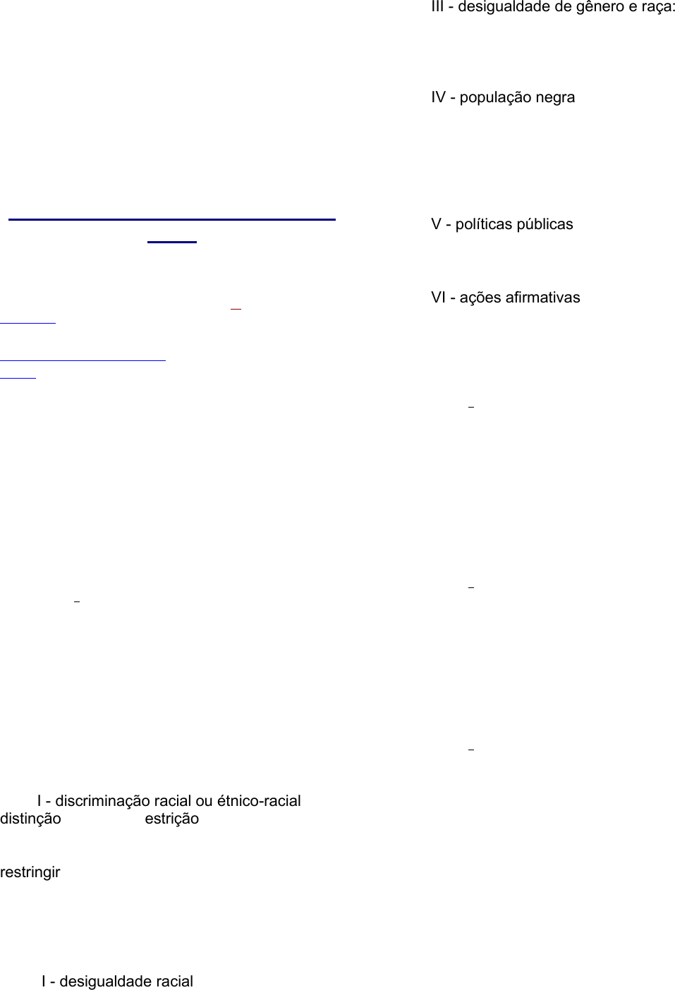 Presidência da República Casa Civil Subchefia para Assuntos Jurídicos LEI Nº 12.288, DE 20 DE JULHO DE 2010. Vigência (Vide Decreto nº 8.136, de 2013) Institui o Estatuto da Igualdade Racial; altera as Leis nos 7.716, de 5 de janeiro de 1989, 9.029, de 13 de abril de 1995, 7.347, de 24 de julho de 1985, e 10.778, de 24 de novembro de 2003. O PRESIDENTE DA REPÚBLICA Faço saber que o Congresso Nacional decreta e eu sanciono a seguinte Lei: TÍTULO I DISPOSIÇÕES PRELIMINARES Art. 1o Esta Lei institui o Estatuto da Igualdade Racial, destinado a garantir à população negra a efetivação da igualdade de oportunidades, a defesa dos direitos étnicos individuais, coletivos e difusos e o combate à discriminação e às demais formas de intolerância étnica. Parágrafo único. Para efeito deste Estatuto, considera-se: I - discriminação racial ou étnico-racial: toda distinção, exclusão, restrição ou preferência baseada em raça, cor, descendência ou origem nacional ou étnica que tenha por objeto anular ou restringir o reconhecimento, gozo ou exercício, em igualdade de condições, de direitos humanos e liberdades fundamentais nos campos político, econômico, social, cultural ou em qualquer outro campo da vida pública ou privada; II - desigualdade racial: toda situação injustificada de diferenciação de acesso e fruição de bens, serviços e oportunidades, nas esferas pública e privada, em virtude de raça, cor, descendência ou origem nacional ou étnica; III - desigualdade de gênero e raça: assimetria existente no âmbito da sociedade que acentua a distância social entre mulheres negras e os demais segmentos sociais; IV - população negra: o conjunto de pessoas que se autodeclaram pretas e pardas, conforme o quesito cor ou raça usado pela Fundação Instituto Brasileiro de Geografia e Estatística (IBGE), ou que adotam autodefinição análoga; V - políticas públicas: as ações, iniciativas e programas adotados pelo Estado no cumprimento de suas atribuições institucionais; VI - ações afirmativas: os programas e medidas especiais adotados pelo Estado e pela iniciativa privada para a correção das desigualdades raciais e para a promoção da igualdade de oportunidades. Art. 2o É dever do Estado e da sociedade garantir a igualdade de oportunidades, reconhecendo a todo cidadão brasileiro, independentemente da etnia ou da cor da pele, o direito à participação na comunidade, especialmente nas atividades políticas, econômicas, empresariais, educacionais, culturais e esportivas, defendendo sua dignidade e seus valores religiosos e culturais. Art. 3o Além das normas constitucionais relativas aos princípios fundamentais, aos direitos e garantias fundamentais e aos direitos sociais, econômicos e culturais, o Estatuto da Igualdade Racial adota como diretriz político-jurídica a inclusão das vítimas de desigualdade étnico- racial, a valorização da igualdade étnica e o fortalecimento da identidade nacional brasileira. Art. 4o A participação da população negra, em condição de igualdade de oportunidade, na vida econômica, social, política e cultural do País será promovida, prioritariamente, por meio de: I - inclusão nas políticas públicas de desenvolvimento econômico e social; II - adoção de medidas, programas e políticas de ação afirmativa; III - modificação das estruturas institucionais do Estado para o adequado enfrentamento e a superação das desigualdades étnicas http://legislacao.planalto.gov.br/legisla/legislacao.nsf/Viw_Identificacao/lei%2012.288-2010?OpenDocument http://legislacao.planalto.gov.br/legisla/legislacao.nsf/Viw_Identificacao/lei%2012.288-2010?OpenDocument http://www.planalto.gov.br/ccivil_03/_ato2007-2010/2010/lei/l12288.htm#art65 http://www.planalto.gov.br/ccivil_03/_Ato2011-2014/2013/Decreto/D8136.htm http://www.planalto.gov.br/ccivil_03/_Ato2011-2014/2013/Decreto/D8136.htm JK Destacar JK Destacar JK Destacar JK Lápis JK Lápis JK Lápis JK Destacar JK Destacar JK Destacar JK Destacar JK Destacar JK Destacar JK Destacar JK Lápis JK Lápis JK Lápis JK Lápis decorrentes do preconceito e da discriminação étnica; IV - promoção de ajustes normativos para aperfeiçoar o combate à discriminação étnica e às desigualdades étnicas em todas as suas manifestações individuais, institucionais e estruturais; V - eliminação dos obstáculos históricos, socioculturais e institucionais que impedem a representação da diversidade étnica nas esferas pública e privada; VI - estímulo, apoio e fortalecimento de iniciativas oriundas da sociedade civil direcionadas à promoção da igualdade de oportunidades e ao combate às desigualdades étnicas, inclusive mediante a implementação de incentivos e critérios de condicionamento e prioridade no acesso aos recursos públicos; VII - implementação de programas de ação afirmativa destinados ao enfrentamento das desigualdades étnicas no tocante à educação, cultura, esporte e lazer, saúde, segurança, trabalho, moradia, meios de comunicação de massa, financiamentos públicos, acesso à terra, à Justiça, e outros. Parágrafo único. Os programas de ação afirmativa constituir-se-ão em políticas públicas destinadas a reparar as distorções e desigualdades sociais e demais práticas discriminatórias adotadas, nas esferas pública e privada, durante o processo de formação social do País. Art. 5o Para a consecução dos objetivos desta Lei, é instituído o Sistema Nacional de Promoção da Igualdade Racial (Sinapir), conforme estabelecido no Título III. TÍTULO II DOS DIREITOS FUNDAMENTAIS CAPÍTULO I DO DIREITO À SAÚDE Art. 6o O direito à saúde da população negra será garantido pelo poder público mediante políticas universais, sociais e econômicas destinadas à redução do risco de doenças e de outros agravos. § 1o O acesso universal e igualitário ao Sistema Único de Saúde (SUS) para promoção, proteção e recuperação da s
