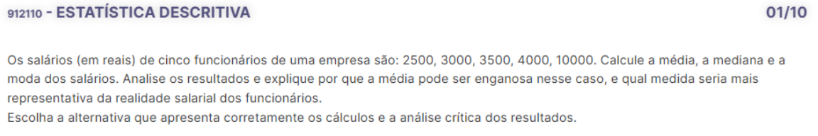 Dados Salários: 2500, 3000, 3500, 4000, 10000 1. Cálculo da Média A média é calculada somando todos os valores e dividindo pelo número de dados. Média = soma dos salários \ número de salários Média = 2500 + 3000 + 3500 + 4000 + 10000 \ 5 ...... Média = 23000\5 = 4600 2. Cálculo da Mediana A mediana é o valor que está no meio quando os dados estão ordenados. Salários em ordem crescente: 2500, 3000, 3500, 4000, 10000. O valor do meio é 3500, então: Mediana=3500 3. Cálculo da Moda A moda é o valor que mais se repete. No conjunto dado, nenhum salário se repete, então: Moda=Não existe (amodal) 4. Análise dos Resultados · Média (4600): Está significativamente influenciada pelo salário de 10000, que é um outlier (valor muito maior que os outros). Por isso, ela não reflete bem a realidade dos outros funcionários. · Mediana (3500): Representa melhor o valor central, pois não é afetada pelos valores extremos. · Moda: Inexistente neste caso, então não contribui para a análise. Medida mais representativa A mediana é a melhor escolha aqui, pois ela reflete mais fielmente a realidade da maioria dos funcionários, sem ser distorcida pelo salário muito alto de 10000. Essa situação mostra como a média pode ser enganosa quando há valores extremos. Em contextos como este, onde os dados apresentam grande variação, a mediana é geralmente mais confiável para descrever a tendência central. image1.png