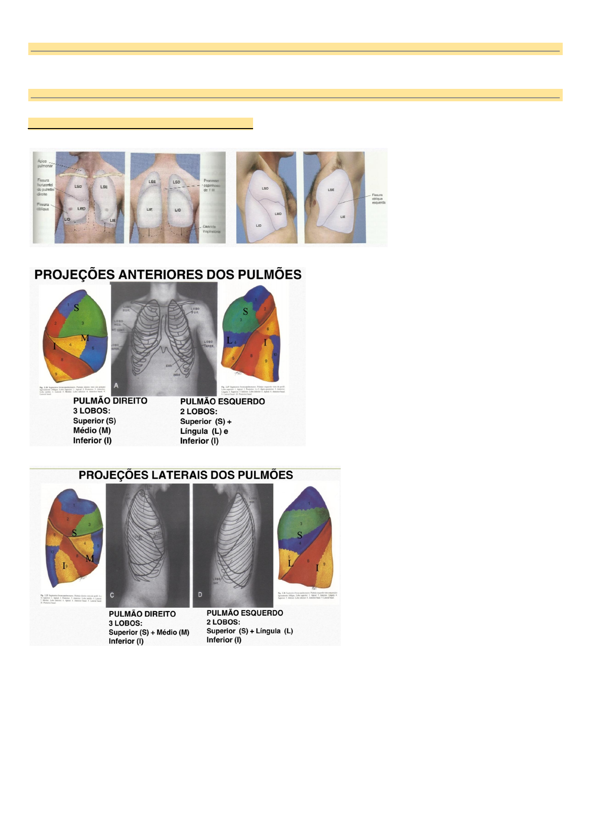 SEMIOLOGIA DO APARELHO RESPIRATÓRIO ANATOMIA TOPOGRÁFICA DOS PULMÕES LINHAS TORÁCICAS REGIÕES TORÁCICAS ÂNGULO DE LOUIS INSPEÇÃO ESTÁTICA Presença de cicatrizes; Lesões; Manchas; Distribuição dos pelos - andrógeno Abaulamentos; Retrações; Assimetrias; Forma do tórax: largura X profundidade 1. Chato (longilíneos) 2. Tonel - barril 3. Infundibuliforme 4. Cariniforme 5. Piriforme - em sino 6. Cifótico 7. Escoliótico 8. Cifoescoliótico 9. Instável Traumático INSPEÇÃO DINÂMICA - expansibilidade simétrica Frequência Respiratória - adultos: 16 - 20 rpm - eupneia: respiração normal, silenciosa, sem esforços - taquipneia: ↑ - bradipneia: ↓ - apneia: parada respiratória Uso dos Músculos Acessórios - sinal de desconforto respiratório e obstrução das vias aéreas - retração/ tiragem intercostal - depressão entre os espaços intercostais - tiragem diafragmática - retração de fúrcula esternal e supraclavicular - batimento da asa do nariz. Tipo respiratório - torácico (normal sentado) - abdominal (normal em decúbito dorsal) - toracoabdominal (misto) Ritmo Respiratório - observar por 2 minutos - sequência, forma, amplitude 1. Normal: mov. resp. regulares - expiração > inspiração 2. Dispneia: mov. resp. alterados em sequência, forma, amplitude 3. Ritmos Anormais: platipneia, ortopneia, trepopneia, respiração de Cheyne-Stokes, respiração de Biot, respiração de Kussmaul, respiração suspirosa PALPAÇÃO Estrutura da Parede Torácica - identificar pontos dolorosos - pele - músculos - cartilagens - ossos Expansibilidade do tórax - comparar expansibilidade + afastamento simétrico Frêmito Tóraco-vocal - paciente: dizer “33” - sentir vibração - vibrações + intensas no ápice - Frêmito normal: - Frêmito aumentado: ↑ densidade do parênquima pulmonar (conduz mais a vibração) - voz reverbera mais em líquidos (que em ossos e ar) - pneumonia, tuberculose - se tem catarro nos alvéolos, o frêmito vai estar aumentado (expectoração crepitante - vibra mais) - Frêmito diminuído: líquido pleural - Frêmito Abolido: vibrações ausentes (separação total entre pulmão e parede torácica) - derrame pleural, pneumotórax completo PERCUSSÃO - paciente sentado - percussão nas faces laterais: paciente com mãos na cabeça - percussão dígito-digital - comparar os lados E e D - percussão em Z 1. Normal: som claro pulmonar 2. Timpanismo: ar aprisionado na pleura (pneumotórax) 3. Hipersonoridade: percussão mais clara, intensa - indica ↑ar nos alvéolos - pneumotórax, enfisema 4. Macicez: indica ↓ou ausência de ar nos alvéolos - câncer de pulmão, derrame pleural, atelectasia 5. Sub-macicez: pneumonia - dedos nas regiões: 1. Anterior - ápice - infra mamária - axilar - infra axilar 2. Posterior - ápice - interescapulovertebral - infraescapular AUSCULTA - paciente sentado - paciente respirar fundo e com a boca entreaberta, 1. Normal: murmúrio vesicular + respiração broncovesicular + respiração brônquica (traqueal) 2. Ruídos Adventícios: a. Roncos b. Sibilos c. Estridor d. Estertores Crepitantes (finos) ou Subcrepitantes (grossos) e. Atrito Pleural SEMIOLOGIA DO APARELHO CARDIOVASCULAR - paciente en decúbito dorsal + decúbito lateral esquerdo - médico sempre à direita do paciente INSPEÇÃO ESTÁTICA - AVALIAR PRECÓRDIO - pele - forma do tórax - abaulamentos - retrações - cicatrizes - estase jugular - simetria INSPEÇÃO DINÂMICA E PALPAÇÃO - Ictus Cordis: ápice do coração - pulso cardíaco mais palpável - 5º EICE na Linha Hemiclavicular E - deslocamento do Ictus: 6º EICE ou lateral - se fosse visível, teria pulsação - pulsação epigástrica - observar tiragem no precórdio (cardiomegalia = abaulamento)