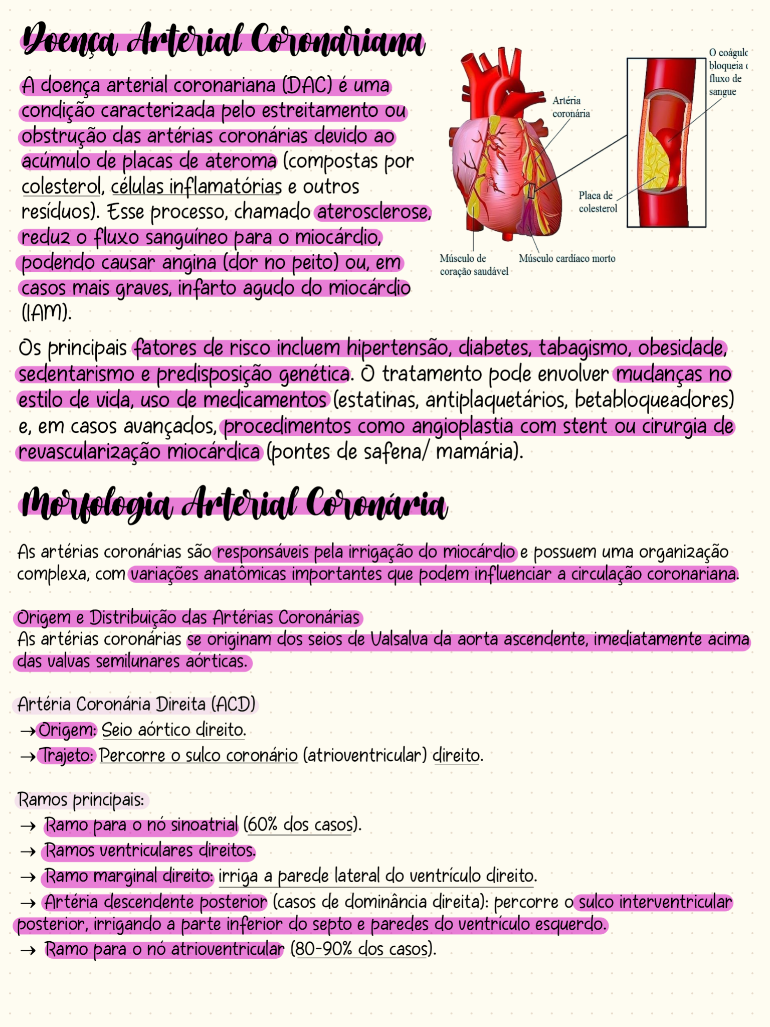 Doenca Arterial Coronariana o coágulo bloqueia ( A doença arterial coronariana (DAC) é uma fluxo de sangue Artéria condição caracterizada pelo estreitamento ou coronária obstrução das artérias coronárias ao acúmulo de placas de ateroma (compostas por colesterol, células inflamatórias e outros Placa de Esse processo, chamado colesterol reduz fluxo sanguineo para o causar angina (dor no peito) ou, em Músculo de Músculo cardíaco morto coração saudável casos mais graves, in farto aguclo do (IAM). Os principais fatores de risco incluem hipertensão, diabetes, tabagismo, sedentarismo e predisposição genética. tratamento pode envolver muclanças no estilo de vicla, uso de medicamentos (estatinas, antiplaquetários, betabloqueadores) e, em casos avançados, procedimentos como angioplastia com stent ou cirurgia de revascularização (pontes de safena/ mamária). Morfologia Arterial Coronaria As artérias coronárias são responsáveis pela irrigação do e possuem uma organização complexa, com variações anatômicas importantes que podem influenciar a circulação coronariana. Origem e Distribuição Artérias Coronárias As artérias coronárias se originam dos seios de da aorta ascendente, imediatamente acima valvas semilunares Artéria Coronária Direita (ACD) Origem: Seio direito. Trajeto: Percorre o sulco coronário (atrioventricular) Ramos principais: Ramo para nó sinoatrial (60% dos casos). Ramos ventriculares Ramo marginal direito: irriga a lateral do ventrículo Artéria descendente posterior (casos de dominância direita): percorre o sulco interventricular posterior, a parte inferior do septo e do ventrículo Ramo para o nó atrioventricular (80-90% dos casos).Artéria Coronária Esquercla (ACE) Origem: Seio aórtico Trajeto: um tronco curto (1-2 cm) que se em dois ramos principais: Artéria Descendente Anterior (ADA): Corre ao longo do sulco interventricular anterior. Ramos septais irrigam os 2/3 anteriores do septo interventricular. Ramos diagonais irrigam a parede ântero-lateral do ventrículo Artéria Circunflexa (CX): Segue pelo sulco coronário Da origem a ramos para a lateral do ventrículo Em casos de dominância origina a descendente posterior. Artérias Coronárias SUPRIMENTO ARTERIAL Artéria Coronária Esquerda Artéria circunflexa Artéria do Sinusal Ramo Marginal Artéria Coronária Obtuso Direita Artéria Descendente Artéria do AV Anterior Ramo diagonal Ramo Agudo Descendente Posterior Dominância Coronária A circulação coronariana pode ser classificada conforme a origem da artéria descendente posterior Dominância (85% dos casos): a ACD origina a ADP. Dominância esquercla (7-8% dos casos): a CX origina a ADP. Dominância balanceada (7-8% dos casos): ambas as artérias contribuem para a ADP.Figura 1. Fotos das faces diafragmáticas de corações dissecados mostrando exemplos de dominância direita (A), dominância balanceada (B), dominância esquerda (C) e dominância direita (Schlessinger 1940) ou dominância balanceada (Falci et al., 1994) (D). Setas brancas apontam para as artérias coronárias direitas. Setas pretas apontam paras as artérias interventriculares posteriores. Cabeças de seta pretas apontam para a continuidade da artéria coronária direita irrigando a parede posterior do esquerdo. Cabeça de seta branca aponta a artéria interventricular anterior que circunda o ápice do coração e se estende à face diafragmática. Barra de escala = 3 cm. A Dominância direita B Dominancia balanceada C Dominância esquerda Dominândia direita (Schlessinger, 1940) Dominância balanceada Falci Jr. et al., 1994) Fonte: autores.Variações Anatômicas Importantes Origem anômala artérias coronárias (exemplo: ACD ou ACE originando-se aorta contralateral). Trajeto interarterial (entre a aorta e a artéria pulmonar), associado a risco de isquemia. Hipoplasia de uma das artérias levando à dependência de circulação colateral. Type I: Type II: Type III: Type IV: LAD terminates Dual LAD and RCA LAD supplies "Wrap-around LAD"- before reaching supply apex entire apex The LAD supplies the apex >25% of Inferior Myocardial Wall Tipo ADA curta, não irriga do Tipo II: A ADA divicle com a ACD a irrigação do do UE. Tipo III: ADA irriga sozinha toda a região do apice Tipo IV: ADA irriga todo do VE além de ultrapassa-lo e irrigar a inferior do em aproximadamente 25% de sua extensão. Circulação Colateral Em casos de obstrução coronariana crônica, pode ocorrer de circulação colateral, com anastomoses entre ramos da ACD e ACE para suprir áreas de isquemia.da ATEROSCLEROSE Artéria com estreitamento devido placa de aterosclerose A aterosclerose é uma doença inflamatória crônica caracterizada pelo acúmulo de lipídios, células inflamatórias e fibroso na parede artérias de médio e grande calibre, levando à formação de placas ateromatosas. Esse processo é multifatorial e envolve Fluxo de sangue Placa de aterosquerose interações complexas entre células leucócitos e componentes matriz Início Aterosclerose processo aterosclerótico inicia-se com a disfunção endotelial, frequentemente causada por fatores de risco como hiperlipidemia, hipertensão, tabagismo e hiperglicemia A disfunção enclotelial resulta na expressão aumentada de de adesão celular UCAM-1) e quimiocinas, a e migração de monócitos para a camada artéria. Formação Estria Gordurosa Dentro cla camada íntima, os monócitos se diferenciam em macrófagos e fagocitam de baixa (LDL-ox), tornando-se células espumosas. acúmulo clessas células forma as estrias gordurosas, o primeiro estágio visível da aterosclerose. Formação e Progressão Placa Aterosclerótica Com o tempo, ocorre uma resposta inflamatória sustentada, com liberação de citocinas pró-inflamatórias (IL-1B, TNF-a) e fatores de crescimento, promovendo a proliferação de células musculares lisas. Essas células contribuem para a deposição de matriz extracelular e formação capa fibros