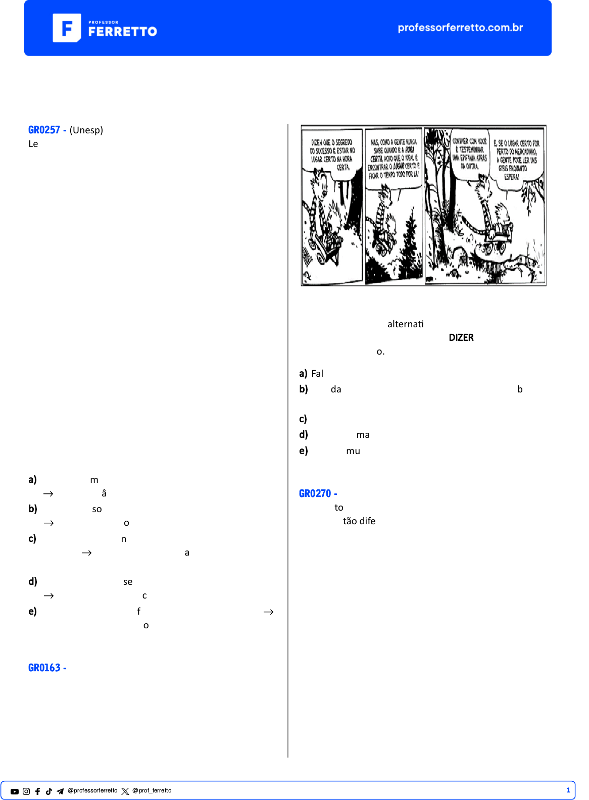 Termos Essenciais GR0257 - (Unesp) Leia o soneto “Nasce o Sol, e não dura mais que um dia”, do poeta Gregório de Matos (1636-1696). Nasce o Sol, e não dura mais que um dia, Depois da Luz se segue a noite escura, Em tristes sombras morre a formosura, Em con�nuas tristezas a alegria. Porém, se acaba o Sol, por que nascia? Se é tão formosa a Luz, por que não dura? Como a beleza assim se transfigura? Como o gosto da pena assim se fia? Mas no Sol, e na Luz falte a firmeza, Na formosura não se dê constância, E na alegria sinta-se tristeza. Começa o mundo enfim pela ignorância, E tem qualquer dos bens por natureza A firmeza somente na inconstância. (Poemas escolhidos, 2010.) O verso está reescrito em ordem direta, sem alteração do seu sen�do original, em: a) “Começa o mundo enfim pela ignorância,” (4ª estrofe) → Pela ignorância, enfim, o mundo começa. b) “Em tristes sombras morre a formosura,” (1ª estrofe) → A formosura morre em tristes sombras. c) “Nasce o Sol, e não dura mais que um dia,” (1ª estrofe) → O Sol não dura mais que um dia que nasce. d) “Depois da Luz se segue a noite escura,” (1ª estrofe) → Segue-se a noite escura depois da Luz. e) “Mas no Sol, e na Luz falte a firmeza,” (3ª estrofe) → Mas falte a firmeza no Sol e na Luz. GR0163 - (Cfn) Indique, dentre as alterna�vas abaixo, a que possui o mesmo �po de sujeito do verbo DIZER, presente no 1º quadrinho do texto. a) Faltou-me cautela naquele momento. b) A�vidades �sicas e boa alimentação fazem bem à saúde do corpo e da mente. c) Estão à sua espera desde ontem. d) Faz três semanas que não vou à praia. e) Choveu muito no final de janeiro. GR0270 - (Unesp) Onde estou? Este sí�o desconheço: Quem fez tão diferente aquele prado? Tudo outra natureza tem tomado, E em contemplá-lo, �mido, esmoreço. Uma fonte aqui houve; eu não me esqueço De estar a ela um dia reclinado; Ali em vale um monte está mudado: Quanto pode dos anos o progresso! Árvores aqui vi tão florescentes, Que faziam perpétua a primavera: Nem troncos vejo agora decadentes. Eu me engano: a região esta não era; Mas que venho a estranhar, se estão presentes Meus males, com que tudo degenera! (Cláudio Manuel da Costa. Obras, 2002.) 1@professorferretto @prof_ferretto Está reescrito em ordem direta, sem prejuízo de seu sen�do original, o seguinte verso: a) “Quem fez tão diferente aquele prado?” (1a estrofe) → Quem aquele prado fez tão diferente? b) “Uma fonte aqui houve; eu não me esqueço” (2a estrofe) → Uma fonte houve aqui; eu não me esqueço. c) “Ali em vale um monte está mudado:” (2a estrofe) → Ali está mudado um monte em vale. d) “Tudo outra natureza tem tomado,” (1a estrofe) → Tudo tem tomado outra natureza. e) “Nem troncos vejo agora decadentes.” (3a estrofe) → Nem troncos decadentes vejo agora. GR0160 - (Cfn) Na frase: “- Saiu agora mesmo com uma trouxinha” - linha 30 – o sujeito é classificado como oculto. Assinale abaixo a frase em que o mesmo ocorre. a) Encontramos belas obras de arte. b) Durante a noite, picharam a parede. c) Existem mo�vos para inocentá-lo. d) Entraram o prefeito e seus assessores. e) Haviam sido realizadas todas as tarefas de casa. 2@professorferretto @prof_ferretto GR0162 - (Insper) O �tulo da chamada alude a um dos termos essenciais da oração: o sujeito. No entanto, para que o sujeito seja classificado como oculto, é necessário que haja certas marcas linguís�cas, que podem ser iden�ficadas em a) Foram criados novos aplica�vos que prometem anonimato dos usuários. b) No mercado há diversos aplica�vos que prometem anonimato dos usuários. c) Surgiram vários aplica�vos que prometem anonimato dos usuários. d) Desenvolvemos novos aplica�vos que prometem anonimato dos usuários. e) Cresce a oferta de aplica�vos que prometem anonimato dos usuários. GR0167 - (Unimep) Leia: I. Paulo está adoentado. II. Paulo está no hospital. a) O predicado é verbal em I e II. b) O predicado é nominal em I e II. c) O predicado é verbo-nominal em I e II. d) O predicado é verbal em I e nominal em II. e) O predicado é nominal em I e verbal em II. GR0169 - (Eear) Com relação aos �pos de predicado, assinale a alterna�va que apresenta a sequência correta quanto à classificação dos predicados das orações abaixo. I- Os alunos foram informados da situação. II- Os candidatos saíram da sala confiantes. III- O professor parece despreocupado. a) Predicado nominal – Predicado verbo-nominal – Predicado verbal b) Predicado verbal – Predicado nominal – Predicado verbo-nominal c) Predicado verbal – Predicado verbo-nominal – Predicado nominal d) Predicado verbo-nominal – Predicado verbal – Predicado nominal e) Predicado nominal – Predicado verbal – Predicado verbo-nominal GR0165 - (Unir) A raça humana A raça humana é Uma semana Do trabalho de Deus A raça humana é ferida acesa Uma beleza, uma podridão O fogo eterno e a morte A morte e a ressurreição A raça humana é Uma semana Do trabalho de Deus A raça humana é o cristal de lágrima Da lavra da solidão Da mina, cujo mapa Traz na palma da mão A raça humana é Uma semana Do trabalho de Deus A raça humana risca, rabisca, pinta A �nta, a lápis, a carvão, a giz O rosto da saudade Que traz do Gênesis Dessa semana santa Entre parênteses Desse divino oásis Da grande apoteose 3@professorferretto @prof_ferretto Da perfeição divina Na Grande Síntese A raça humana é Uma semana Do trabalho de Deus (GIL, Gilberto. CD Raça Humana.) Sobre a construção sintá�ca do texto, marque V para as afirma�vas verdadeiras e F para as falsas. (__) Para conceituar a raça humana foi empregado o predicado nominal, como em A raça humana é o cristal de lágrima. (__) Verbos transi�vos diretos foram empregados para indicar o que a raça humana faz, a exemplo de A raça humana risca, rabisca, pinta / A �nta, a lápis, a carv