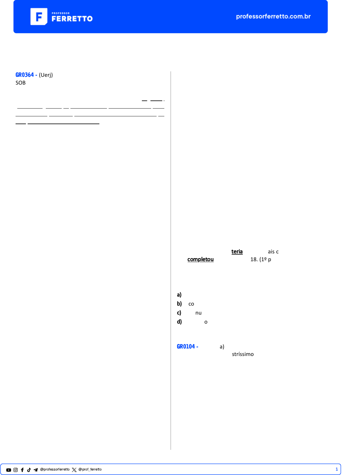 Classes do Verbo GR0364 - (Uerj) SOBREVIVEREMOS NA TERRA? Tenho interesse pessoal no tempo. Primeiro, meu best-seller chama-se Uma breve história do tempo. Segundo, por ser alguém que, aos 21 anos, foi informado pelos médicos de que teria apenas mais cinco anos de vida e que completou 76 anos em 2018. Tenho uma aguda e desconfortável consciência da passagem do tempo. Durante a maior parte da minha vida, convivi com a sensação de que estava fazendo hora extra. Parece que nosso mundo enfrenta uma instabilidade polí�ca maior do que em qualquer outro momento. Uma grande quan�dade de pessoas sente ter ficado para trás. Como resultado, temos nos voltado para polí�cos populistas, com experiência de governo limitada e cuja capacidade para tomar decisões ponderadas em uma crise ainda está para ser testada. A Terra sofre ameaças em tantas frentes que é di�cil permanecer o�mista. Os perigos são grandes e numerosos demais. O planeta está ficando pequeno para nós. Nossos recursos �sicos estão se esgotando a uma velocidade alarmante. A mudança climá�ca foi uma trágica dádiva humana ao planeta. Temperaturas cada vez mais elevadas, redução da calota polar, desmatamento, superpopulação, doenças, guerras, fome, escassez de água e extermínio de espécies; todos esses problemas poderiam ser resolvidos, mas até hoje não foram. O aquecimento global está sendo causado por todos nós. Queremos andar de carro, viajar e desfrutar um padrão de vida melhor. Mas quando as pessoas se derem conta do que está acontecendo, pode ser tarde demais. Estamos no limiar de um período de mudança climá�ca sem precedentes. No entanto, muitos polí�cos negam a mudança climá�ca provocada pelo homem, ou a capacidade do homem de revertê-la. O derre�mento das calotas polares ár�ca e antár�ca reduz a fração de energia solar refle�da de volta no espaço e aumenta ainda mais a temperatura. A mudança climá�ca pode destruir a Amazônia e outras florestas tropicais, eliminando uma das principais ferramentas para a remoção do dióxido de carbono da atmosfera. A elevação da temperatura dos oceanos pode provocar a liberação de grandes quan�dades de dióxido de carbono. Ambos os fenômenos aumentariam o efeito estufa e exacerbariam o aquecimento global, tornando o clima em nosso planeta parecido com o de Vênus: atmosfera escaldante e chuva ácida a uma temperatura de 250 ºC. A vida humana seria impossível. Precisamos ir além do Protocolo de Kyoto – o acordo internacional adotado em 1997 – e cortar imediatamente as emissões de carbono. Temos a tecnologia. Só precisamos de vontade polí�ca. Quando enfrentamos crises parecidas no passado, havia algum outro lugar para colonizar. Estamos ficando sem espaço, e o único lugar para ir são outros mundos. Tenho esperança e fé de que nossa engenhosa raça encontrará uma maneira de escapar dos sombrios grilhões do planeta e, deste modo, sobreviver ao desastre. A mesma providência talvez não seja possível para os milhões de outras espécies que vivem na Terra, e isso pesará em nossa consciência. Mas somos, por natureza, exploradores. Somos mo�vados pela curiosidade, essa qualidade humana única. Foi a curiosidade obs�nada que levou os exploradores a provar que a Terra não era plana, e é esse mesmo impulso que nos leva a viajar para as estrelas na velocidade do pensamento, ins�gando- nos a realmente chegar lá. E sempre que realizamos um grande salto, como nos pousos lunares, exaltamos a humanidade, unimos povos e nações, introduzimos novas descobertas e novas tecnologias. Deixar a Terra exige uma abordagem global combinada – todos devem par�cipar. STEPHEN HAWKING (1942-2018) Adaptado de Breves respostas para grandes questões. Rio de Janeiro: Intrínseca, 2018. Segundo, por ser alguém que, aos 21 anos, foi informado pelos médicos de que teria apenas mais cinco anos de vida e que completou 76 anos em 2018. (1º parágrafo, sublinhado) Os verbos sublinhados descrevem dois fatos que podem ser caracterizados, respec�vamente, como: a) hipoté�co – realizado b) inconcluso – eventual c) con�nuo – momentâneo d) repe��vo – retrospec�vo GR0104 - (Famema) Vossas excelências, ilustríssimos senhores e senhoras, trago no�cias urgentes de um reino distante. É mister vos alertar, Vossas Excelências, que nesta estranha terra os habitantes criaram um país onde os mui digníssimos e respeitáveis representantes do povo são tratados, imaginem Vossas Senhorias, como o próprio povo. Insânia! Dirão que as histórias que aqui relato são meras alucinações de contos de fada, pois há neste rico reino, que chamam de Suécia, rei, rainha e princesas. Mas não se iludam! Os habitantes desta terra já �raram todos os poderes do rei, em nome de uma democracia que proclama uma tal igualdade entre todos, e o 1@professorferretto @prof_ferretto que digo são coisas que tenho visto com os olhos que esta mesma terra um dia há de comer. Nestas longínquas comarcas, os mui dis�ntos parlamentares, ministros e prefeitos viajam de trem ou de ônibus para o trabalho, em sua labuta para adoçar as mazelas do povo. De ônibus, Eminências! E muitos castelos há pelos quatro cantos deste próspero reino, mas aos egrégios representantes do povo é oferecido abrigo apenas em pífias habitações de um cômodo, indignas dos ilustríssimos defensores dos direitos dos cidadãos e da democracia. Este reino está cercado por outros ricos reinos, numa península chamada Escandinávia, onde também há príncipes e reis, e onde os representantes do povo vivem como sobrevive um súdito qualquer. E isto eu também vi, com os olhos que esta terra há de comer: em um dos povos vizinhos, conhecido como o reino dos noruegueses, os nobres representantes do povo chegam a almoçar sanduíches que trazem de casa, e que �ram dos bolsos dos paletós quando a fome aperta. É preciso cautela, Vossas Excelênci