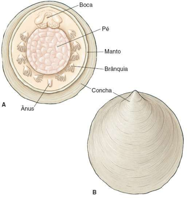 Figura 16.12 Neopilina, classe Monoplacophora. Espécimes vivos variam de 3 mm a cerca de 3 cm de comprimento. A. Vista ventral. B. Vista dorsal. A concha, quando presente, é sempre uma peça única (univalve) e pode ser enrolada ou não. Iniciando pelo ápice, o qual contém a volta menor e mais velha, as voltas da concha tornam-se sucessivamente maiores e enrolam-se ao redor do eixo central, ou columela (Figura 16.13). A concha pode ser dextrógira, quando o enrolamento ocorre para a direita, ou sinistrógira, quando para a esquerda. A direção do enrolamento é controlada geneticamente e as conchas dextrógiras são as mais comuns. Muitos caracóis têm um opérculo, uma placa composta por proteína associada a quinonas que fecha a abertura da concha quando o corpo é recolhido para o seu interior. Os gastrópodes variam desde formas microscópicas até gigantes marinhas, como Pleuroploca gigantea, um caramujo com concha de até 60 cm de comprimento, e as lebres-do-mar Aplysia (Figura 16.22), das quais algumas espécies atingem 1 m de comprimento. A maioria dos gastrópodes, entretanto, varia entre 1 e 8 cm de comprimento. Alguns gastrópodes fósseis têm até 2 m de comprimento. É grande a variação de habitats dos gastrópodes. Os gastrópodes marinhos são comuns tanto na zona litorânea quanto a grandes profundidades, e alguns são mesmo pelágicos. Alguns estão adaptados à água salobra e outros à água doce. No ambiente terrestre são limitados por fatores como composição mineral do solo e extremos de temperatura, aridez e acidez. Assim mesmo, eles estão amplamente disseminados; alguns têm sido encontrados a grandes altitudes e mesmo em regiões polares. Os gastrópodes ocupam todos os tipos de habitats: em pequenos lagos ou grandes corpos d’água, em florestas, pastagens, musgos, sob rochas, subsolo, penhascos escarpados, sobre árvores e sobre os corpos de outros animais. Adotaram com sucesso todos os modos de vida, exceto a locomoção aérea. Figura 16.13 Concha do búzio Busycon. A e B. Busycon carica, uma espécie com concha dextrógira, ou enrolada para a direita. Uma concha dextrógira tem abertura no lado direito, quando mantida com o ápice para cima e a abertura voltada para o observador. C. B. contrarium, uma espécie sinistrógira, ou com a concha enrolada para a esquerda. Os gastrópodes podem ser protegidos por conchas, por secreções tóxicas ou de paladar desagradável e/ou pelo hábito de dissimulação. Algumas espécies são inclusive capazes de utilizar, para sua própria defesa, as células urticantes de cnidários, suas presas. Uns poucos, como Strombus, podem desferir golpes ágeis com o pé, o qual é dotado de opérculo pontudo. Entretanto, esses moluscos são comidos por aves, besouros, pequenos mamíferos, peixes e outros predadores. Servindo como hospedeiros intermediários para muitas espécies de parasitas, especialmente trematódeos (Capítulo 14), os caracóis são frequentemente prejudicados pelas fases larvais dos parasitas. Existem três subclasses de gastrópodes: Prosobranchia, Opisthobranchia e Pulmonata. Elas são descritas mais adiante, mas os nomes dessas subclasses são comumente utilizados para se referir a alguns animais em particular. Exemplos familiares de prosobrânquios incluem as litorinas, lapas, búzios, abalones e cipreídeos. As lesmas-marinhas, lebres-do-mar e nudibrânquios são frequentemente referidos como opistobrânquios. Os pulmonados incluem a maioria das lesmas e caracóis terrestres e de água doce. Forma e função Torção. O desenvolvimento embrionário dos gastrópodes varia dependendo do grupo em questão, mas geralmente há um estágio larval de trocófora seguido por um estágio de véliger, quando a concha é inicialmente formada. O véliger tem dois lobos velares ciliados, utilizados na natação, e um pé em desenvolvimento, já evidente (Figura 16.14). Inicialmente, a boca é anterior e o ânus posterior, mas as posições relativas da concha, do trato digestivo e do ânus, da cavidade do manto contendo as brânquias e dos nervos dispostos ao longo de ambos os lados do trato digestivo são alteradas em um processo denominado torção. A torção é em geral descrita como um processo de dois passos. No primeiro passo, um músculo retrator do pé, assimétrico, se contrai e puxa a concha e as vísceras dentro dela (contendo os órgãos do corpo) em 90° no sentido anti- horário, em relação à cabeça. Esse movimento traz o ânus da região posterior para o lado direito do corpo (Figura 16.14). As descrições tradicionais afirmam que o movimento da concha acompanha o da víscera, mas estudos detalhados recentes demonstraram que o movimento de ambas é independente. Durante os primeiros movimentos da torção, a concha pode ser girada entre 90 e 180° e assumir a posição que persistirá até o estágio adulto. Tradicionalmente, aceitava-se que a cavidade do manto, que abriga as brânquias e o ânus nos animais adultos, movia-se acompanhando o ânus nos primeiros 90° de torção. Entretanto, estudos mostraram que a cavidade do manto desenvolve-se no lado direito do corpo próximo ao ânus, mas inicialmente isolada deste último. Durante o desenvolvimento, ânus e cavidade do manto geralmente se deslocam um pouco mais para a direita, e a cavidade do manto é então remodelada e passa a envolver o ânus. Em uma série mais lenta e variável de transformações, o trato digestivo move-se tanto lateral quanto dorsalmente, ficando o ânus localizado dorsalmente à cabeça e no interior da cavidade do manto (Figura 16.14). Após a torção, o ânus e a cavidade do manto abrem-se dorsalmente à boca e cabeça. As estruturas do lado esquerdo, como brânquia, rim e átrio do coração, situam-se agora do lado direito, enquanto a brânquia, rim e átrio, originalmente do lado direito, situam-se à esquerda, e os cordões nervosos, torcidos, formam a figura de um “8”. Devido ao espaço disponív