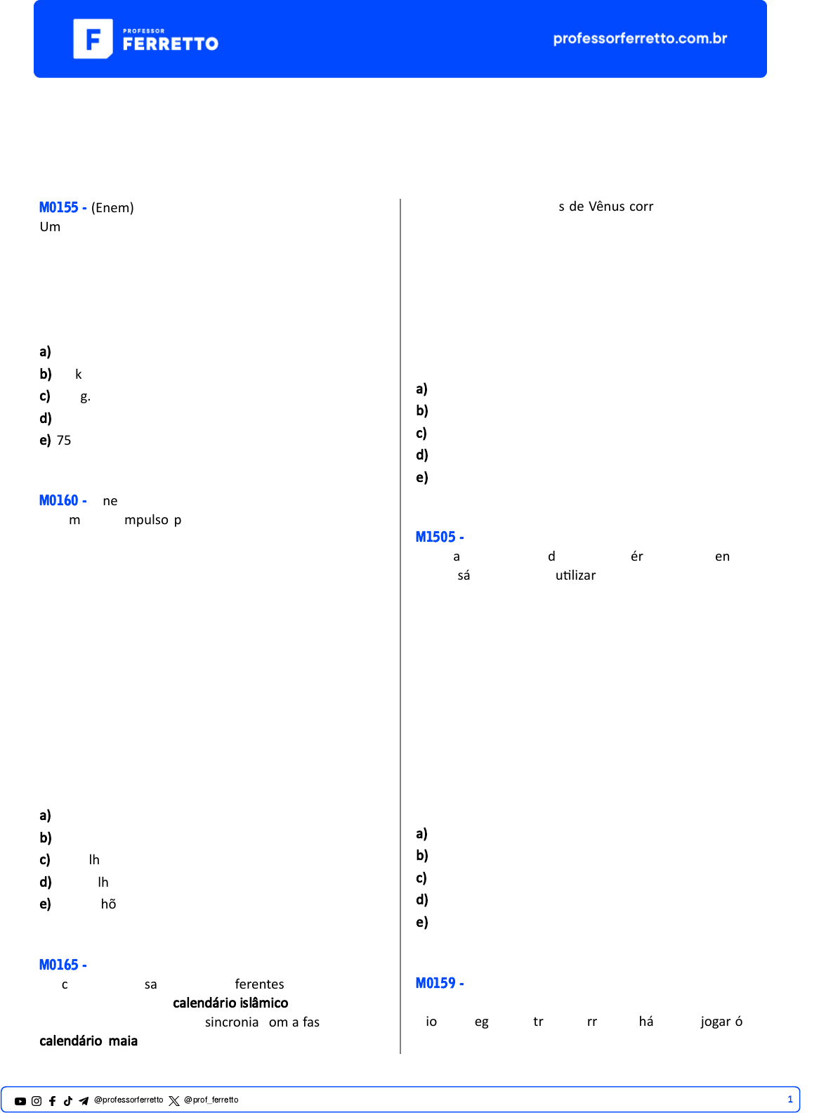 Matemática Básica Regra de 3 M0155 - (Enem) Uma mãe recorreu à bula para verificar a dosagem de um remédio que precisava dar a seu filho. Na bula, recomendava-se a seguinte dosagem: 5 gotas para cada 2 kg de massa corporal a cada 8 horas. Se a mãe ministrou corretamente 30 gotas do remédio a seu filho a cada 8 horas, então a massa corporal dele é de a) 12 kg. b) 16 kg. c) 24 kg. d) 36 kg. e) 75 kg. M0160 - (Enem) Há um novo impulso para produzir combus�vel a par�r de gordura animal. Em abril, a High Plains Bioenergy inaugurou uma biorrefinaria próxima a uma fábrica de processamento de carne suína em Guymon, Oklahoma. A refinaria converte a gordura do porco, juntamente com o o óleo vegetal, em biodiesel. A expecta�va da fábrica é transformar 14 milhões de quilogramas de banha em 112 milhões de litros de biodiesel. Revista Scien�fic American. Brasil, ago. 2009 (adaptado). Considere que haja uma proporção direta entre a massa de banha transformada e o volume de biodiesel produzido. Para produzir 48 milhões de litros de biodiesel, a massa de banha necessária, em quilogramas, será de, aproximadamente, a) 6 milhões. b) 33 milhões. c) 78 milhões. d) 146 milhões. e) 384 milhões. M0165 - (Enem) Os calendários usados pelos diferentes povos da Terra são muito variados. O calendário islâmico, por exemplo, é lunar, e nele cada mês tem sincronia com a fase da lua. O calendário maia segue o ciclo de Vênus, com cerca de 584 dias, e cada 5 ciclos de Vênus corresponde a 8 anos de 365 dias da Terra. MATSUURA, Oscar. Calendários e o fluxo do tempo. Scien�fic American Brasil. Disponível em: h�p://www.uol.com.br. Acesso em: 14 out. 2008 (adaptado). Quantos ciclos teria, em Vênus, um período terrestre de 48 anos? a) 30 ciclos. b) 40 ciclos. c) 73 ciclos. d) 240 ciclos. e) 384 ciclos. M1505 - (Professor Ferre�o) Para a construção de um teleférico, o engenheiro responsável decidiu u�lizar um novo elevador de transporte de pessoas, com o obje�vo de levar as pessoas do solo até o topo de um mirante. Testaram-se dois modelos de elevadores: o primeiro carrega 40 pessoas e demora 15 minutos para ir ao topo e retornar ao solo; o segundo carrega 60 pessoas por vez e demora 21 minutos para percorrer o mesmo trajeto. O engenheiro decide verificar quanto tempo o primeiro demora para carregar 280 pessoas até o topo e voltar. Em seguida, decide calcular a quan�dade máxima de pessoas que o segundo elevador carregaria nesse mesmo tempo. Nessas condições, a quan�dade máxima de pessoas que o segundo elevador pode carregar é a) 133. b) 261. c) 300. d) 392. e) 588. M0159 - (Enem) Um dos grandes problemas da poluição dos mananciais (rios, córregos e outros) ocorre pelo hábito de jogar óleo u�lizado em frituras nos encanamentos que estão 1@professorferretto @prof_ferretto interligados com o sistema de esgoto. Se isso ocorrer, cada 10 litros de óleo poderão contaminar 10 milhões (107) de litros de água potável. Manual de e�queta. Parte integrante das revistas Veja (ed. 2055), Cláudia (ed. 555), Na�onal Geographic (ed. 93) e Nova Escola (ed. 208) (adaptado). Suponha que todas as famílias de uma cidade descartem os óleos de frituras através dos encanamentos e consomem 1 000 litros de óleo em frituras por semana. Qual seria, em litros, a quan�dade de água potável contaminada por semana nessa cidade? a) 102 b) 103 c) 104 d) 105 e) 109 M1908 - (Enem PPL) Uma televisão pode ser posicionada de modo que se consiga enxergar os detalhes de uma imagem em alta definição. Considere que a distância ideal, com conforto visual, para se assis�r à televisão de 32 polegadas é de 1,8 metros. Suponha que haja uma relação de proporcionalidade direta entre o tamanho da tela (medido em polegada) e a distância ideal. Considere que um espectador dispõe de uma televisão de 60 polegadas e que ele deseja se posicionar em frente a ela, com conforto visual. A distância da televisão, em metro, em que o espectador deve se posicionar para que tenha conforto visual é mais próxima de a) 0,33 b) 0,96 c) 1,57 d) 3,37 e) 3,60 M0716 - (Professor Ferre�o) Uma empreiteira u�lizou uma escavadeira para abrir uma vala. Se essa máquina gastou 45 minutos para remover 5/8 do volume de terra, então o restante da terra deverá ser removido em: a) 1 hora. b) 27 minutos. c) 1 hora e 10 minutos. d) 30 minutos. e) 35 minutos. M0158 - (Enem) Nos úl�mos cinco anos, 32 mil mulheres de 20 a 24 anos foram internadas nos hospitais do SUS por causa de AVC. Entre os homens da mesma faixa etária, houve 28 mil internações pelo mesmo mo�vo. Época. 26 abr. 2010 (adaptado). Suponha que, nos próximos cinco anos, haja um acréscimo de 8 mil internações de mulheres e que o acréscimo de internações de homens por AVC ocorra na mesma proporção. De acordo com as informações dadas, o número de homens que seriam internados por AVC, nos próximos cinco anos, corresponderia a a) 4 mil. b) 9 mil. c) 21 mil. d) 35 mil. e) 39 mil. M1098 - (Enem) Alguns medicamentos para felinos são administrados com base na super�cie corporal do animal. Foi receitado a um felino pesando 3,0 kg um medicamento na dosagem diária de 250 mg por metro quadrado de super�cie corporal. O quadro apresenta a relação entre a massa do felino, em quilogramas, e a área de sua super�cie corporal, em metros quadrados. A dose diária, em miligramas, que esse felino deverá receber é de 2@professorferretto @prof_ferretto a) 0,624. b) 52,0. c) 156,0. d) 750,0. e) 1.201,9. M0164 - (Enem) Segundo as regras da Fórmula 1, o peso mínimo do carro, de tanque vazio, com o piloto, é de 605 kg, e gasolina deve ter densidade entre 725 e 780 gramas por litro. Entre os circuitos nos quais ocorrem compe�ções dessa categoria, o mais longo é Spa-Francorchamps, na Bélgica, cujo traçado tem 7 km de extensão. O consumo médio de um carro da Fórmula 1 é de 75 litros para cada 100 km. Suponha que um pil
