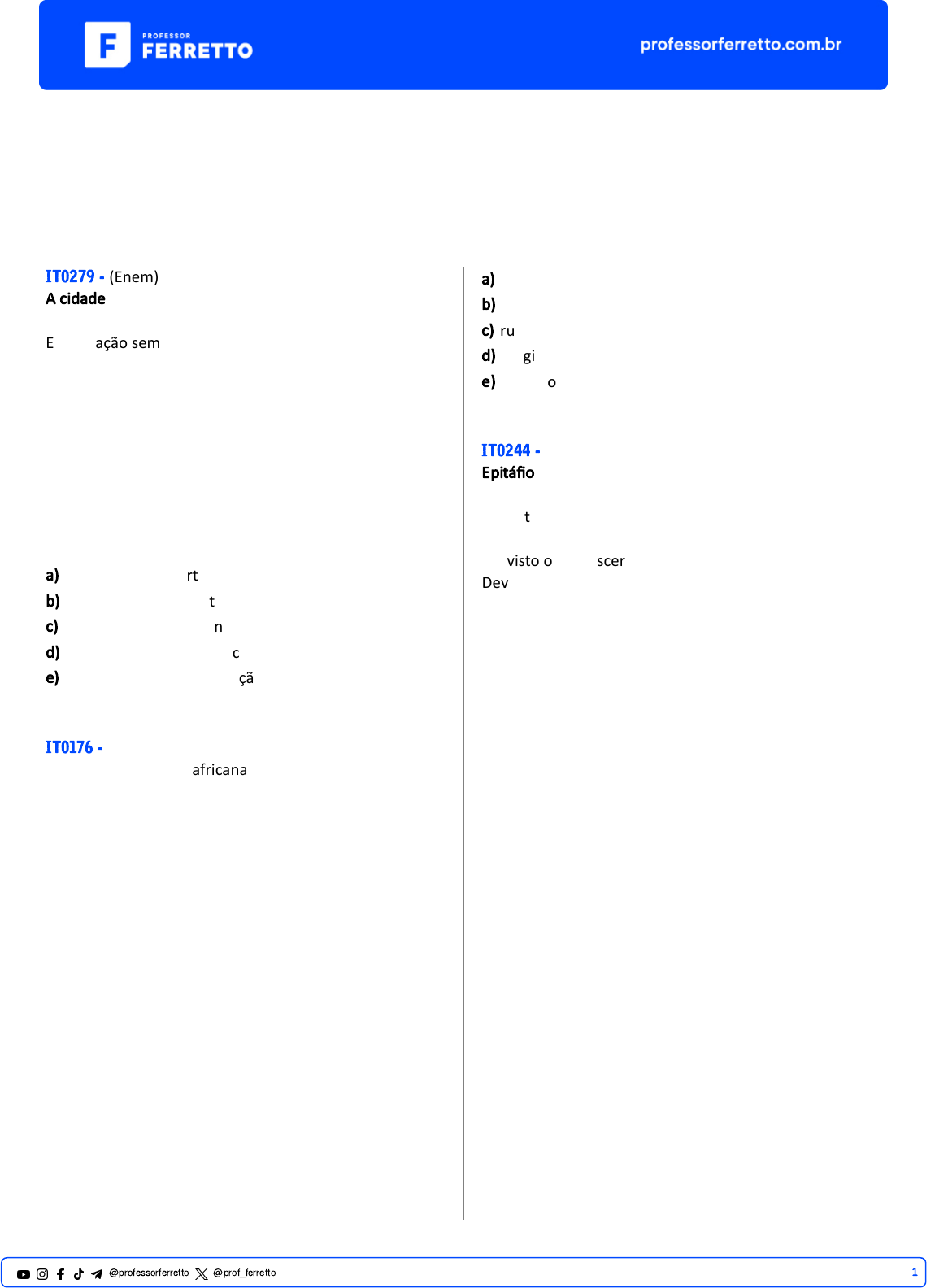 ENEM História da Arte IT0279 - (Enem) A cidade E a situação sempre mais ou menos, Sempre uns com mais e outros com menos. A cidade não para, a cidade só cresce O de cima sobe e o de baixo desce. CHICO SCIENCE e Nação Zumbi. In: Da lama ao caos. Rio de Janeiro: Chaos; Sony Music, 1994 (fragmento). A letra da canção do início dos anos 1990 destaca uma questão presente nos centros urbanos brasileiros que se refere ao(à) a) déficit de transporte público. b) estagnação do setor terciário. c) controle das taxas de natalidade. d) elevação dos índices de criminalidade. e) desigualdade da distribuição de renda. IT0176 - (Enem) A arte pré-histórica africana foi incontestavelmente um veículo de mensagens pedagógicas e sociais. Os San, que cons�tuem hoje o povo mais próximo da realidade das representações rupestres, afirmam que seus antepassados lhes explicaram sua visão do mundo a par�r desse gigantesco livro de imagens que são as galerias. A educação dos povos que desconhecem a escrita está baseada sobretudo na imagem e no som, no audiovisual. Kl-ZERBO, J. A arte pré-histórica africana, In: KI-ZERBO, J. (Org.) História geral da África, I: metodologia e pré- história da África. Brasília: Unesco, 2010. De acordo com o texto, a arte mencionada é importante para os povos que a cul�vam por colaborar para o(a) a) transmissão dos saberes acumulados. b) expansão da propriedade individual. c) ruptura da disciplina hierárquica. d) surgimento dos laços familiares. e) rejeição de prá�cas exógenas. IT0244 - (Enem) Epitáfio Devia ter amado mais Ter chorado mais Ter visto o sol nascer Devia ter arriscado mais E até errado mais Ter feito o que eu queria fazer Queria ter aceitado As pessoas como elas são Cada um sabe a alegria E a dor que traz no coração [...] Devia ter complicado menos Trabalhado menos Ter visto o sol se pôr Devia ter me importado menos Com problemas pequenos Ter morrido de amor BRITTO, S. A melhor banda de todos os tempos da úl�ma semana. Rio de Janeiro: Abril Music, 2001 (fragmento). O gênero epitáfio, palavra que significa uma inscrição colocada sobre lápides, tem a função social de homenagear os mortos. Nesse texto, a apropriação desse gênero no �tulo da letra da canção cria o efeito de 1@professorferretto @prof_ferretto a) destacar a importância de uma pessoa falecida. b) expressar desejo de reversão de a�tudes. c) registrar as caracterís�cas pessoais. d) homenagear as pessoas sepultadas. e) sugerir notações para lápides. IT0287 - (Enem) O meu pai era paulista Meu avô, pernambucano O meu bisavô, mineiro Meu tataravô, baiano Vou na estrada há muitos anos Sou um ar�sta brasileiro CHICO BUARQUE. Paratodos. 1993. Disponível em: www.chicobuarque.com.br. Acesso em: 29 jun. 2015 (fragmento). A caracterís�ca familiar descrita deriva do seguinte aspecto demográfico: a) Migração interna. b) População rela�va. c) Expecta�va de vida. d) Taxa de mortalidade. e) Índice de fecundidade. IT0214 - (Enem) Caminhando contra o vento, Sem lenço e sem documento No sol de quase dezembro Eu vou O sol se reparte em crimes Espaçonaves, guerrilhas Em cardinales bonitas Eu vou Em caras de presidentes Em grandes beijos de amor Em dentes, pernas, bandeiras Bombas e Brigi�e Bardot O sol nas bancas de revista Me enche de alegria e preguiça Quem lê tanta no�cia Eu vou VELOSO, C. Alegria, alegria. In: Caetano Veloso. São Paulo: Phillips, 1967 (fragmento). É comum coexis�rem sequências �pológicas em um mesmo gênero textual. Nesse fragmento, os �pos textuais que se destacam na organização temá�ca são a) descri�vo e argumenta�vo, pois o enunciador detalha cada lugar por onde passa, argumentando contra a violência urbana. b) disserta�vo e argumenta�vo, pois o enunciador apresenta seu ponto de vista sobre as no�cias rela�vas à cidade. c) exposi�vo e injun�vo, pois o enunciador fala de seus estados �sicos e psicológicos e interage com a mulher amada. d) narra�vo e descri�vo, pois o enunciador conta sobre suas andanças pelas ruas da cidade ao mesmo tempo que a descreve. e) narra�vo e injun�vo, pois o enunciador ensina o interlocutor como andar pelas ruas da cidade contando sobre sua própria experiência. IT0233 - (Enem) Pequeno concerto que virou canção Não, não há por que men�r ou esconder A dor que foi maior do que é capaz meu coração Não, nem há por que seguir cantando só para explicar Não vai nunca entender de amor quem nunca soube amar Ah, eu vou voltar pra mim Seguir sozinho assim Até me consumir ou consumir toda essa dor Até sen�r de novo o coração capaz de amor VANDRE, G. Disponível em: h�p://www.letras.terra.com.br. Acesso em 29 jun. 2011. Na canção de Geraldo Vandré, tem-se a manifestação da função poé�ca da linguagem, que é percebida na elaboração ar�s�ca e cria�va da mensagem, por meio de combinações sonoras e rítmicas. Pela análise do texto, entretanto, percebe-se, também, a presença marcante da função emo�va ou expressiva, por meio da qual o emissor a) imprime à canção as marcas de sua a�tude pessoal, seus sen�mentos. b) transmite informações obje�vas sobre o tema de que trata a canção. c) busca persuadir o receptor da canção a adotar um certo comportamento. d) procura explicar a própria linguagem que u�liza para construir a canção. e) obje�va verificar ou fortalecer a eficiência da mensagem veiculada. IT0228 - (Enem) Óia eu aqui de novo xaxando 2@professorferretto @prof_ferretto Óia eu aqui de novo para xaxar Vou mostrar pr'esses cabras Que eu ainda dou no couro Isso é um desaforo Que eu não posso levar Que eu aqui de novo cantando Que eu aqui de novo xaxando Óia eu aqui de novo mostrando Como se deve xaxar Vem cá morena linda Ves�da de chita Você é a mais bonita Desse meu lugar Vai, chama Maria, chama Luzia Vai, chama Zabé, chama Raque Diz que eu tou aqui com alegria 