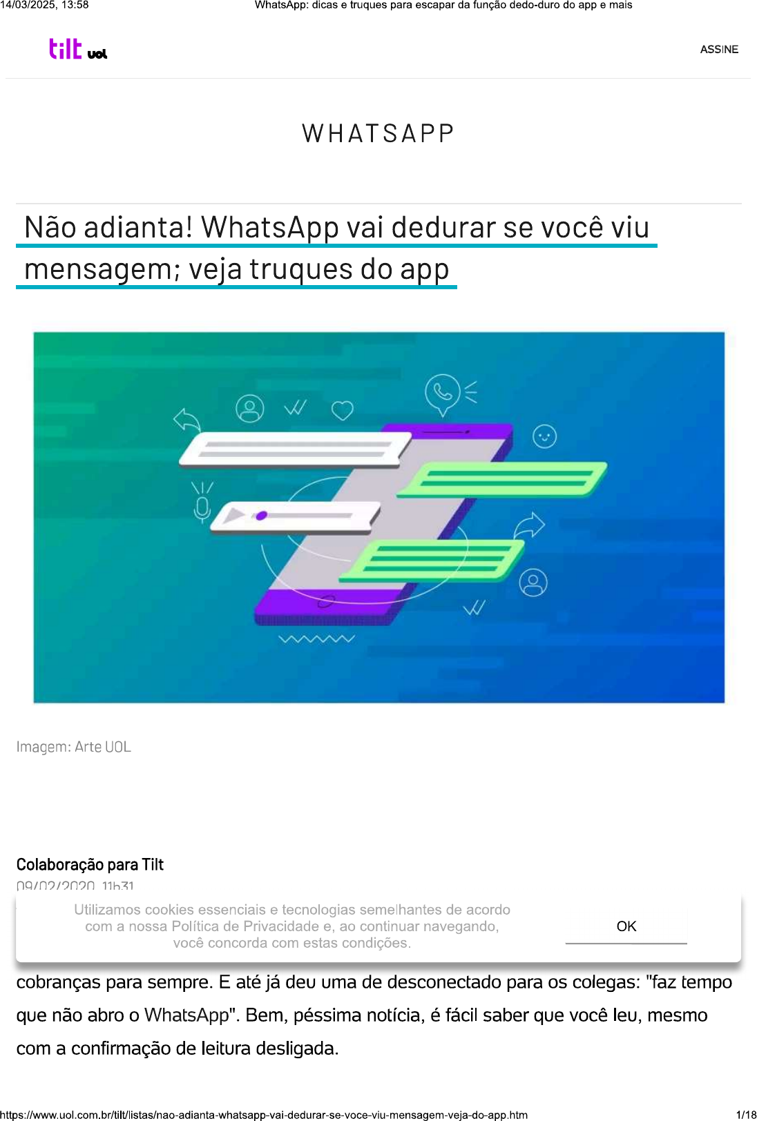 14/03/2025, 13:58 WhatsApp: dicas e truques para escapar da função dedo-duro do app e mais tilt ASSINE WHATSAPP Não adianta! WhatsApp vai dedurar se você viu mensagem; veja truques do app Imagem: Arte UOL Colaboração para Tilt 09/02/2020 Utilizamos cookies essenciais e tecnologias semelhantes de acordo com a nossa Política de Privacidade e, ao continuar navegando, OK você concorda com estas condições. cobranças para sempre. E até já deu uma de desconectado para os colegas: "faz tempo que não abro o WhatsApp". Bem, péssima notícia, é fácil saber que você leu, mesmo com a confirmação de leitura desligada. 1/1814/03/2025, 13:58 WhatsApp: dicas e truques para escapar da função dedo-duro do app e mais tilt ASSINE em um grupo de WhatsApp. Existe outra maneira de descobrir se a mensagem foi vista. Para saber, pressione uma de suas mensagens. No topo direito, toque nos três pontinhos e, depois, selecione "Dados". Pronto. Você saberá quando a mensagem foi entregue e se ela foi lida. Se você não conhecia esse truque, continue lendo, talvez existam mais funções do WhatsApp do que imagina. Conheça os truques Imagem: Reprodução Utilizamos cookies essenciais e tecnologias semelhantes de acordo com a nossa Política de Privacidade e, ao continuar navegando, você concorda com estas condições. 2/1814/03/2025, 13:58 WhatsApp: dicas e truques para escapar da função dedo-duro do app e mais tilt ASSINE GPS avião Area padrão + Dolby de Girar automat Auto Captura de tela obtida. 11:47 1. Engane a confirmação de leitura Para ler as mensagens sem ter a obrigação de responder rapidamente, ative o modo avião de seu smartphone. Abra o WhatsApp e desfrute da privacidade de visualizar tudo sem confirmação de leitura. Ao reativar as funções de seu Utilizamos cookies essenciais e tecnologias semelhantes de acordo com a nossa Política de Privacidade e, ao continuar navegando, você concorda com estas condições. CUMPARTILHAR Imagem: Reprodução 3/1814/03/2025, 13:58 WhatsApp: dicas e truques para escapar da função dedo-duro do app e mais tilt ASSINE Notificação pop-up Sem popup Apenas quando a tela estiver ativada Somente com a tela "desligada" Sempre mostrar notificação CANCELAR 2. Pop-up e atalhos para pessoas especiais Contatos que você costuma conversar com frequência OU grupos que são muito importantes podem ganhar um espaço na área de trabalho da home do seu celular. Toque em um grupo OU indivíduo e segure por alguns momentos. Utilizamos cookies essenciais e tecnologias semelhantes de acordo com a nossa Política de Privacidade e, ao continuar navegando, você concorda com estas condições. "notificações" e selecione "personalizar". Em "pop-up", você poderá escolher entre quatro opções. COMPARTILHAR 4/1814/03/2025, 13:58 WhatsApp: dicas e truques para escapar da função dedo-duro do app e mais tilt ASSINE Google Drive Fazer backup para o Google Drive Conta Fazer backup em 3. Backup no Google Drive Memória de smartphone é sagrada. Por ser restrito, o espaço interno deve ser do anarelho A nn Utilizamos cookies essenciais e tecnologias semelhantes de acordo com a nossa Política de Privacidade e, ao continuar navegando, você concorda com estas condições. e desafogue os dados de seu celular. Em "configurações", selecione "conversas" e depois " Backup de conversas". Lá, você encontrará a opção para armazenar seus arquivos. 5/18tilt ASSINE hagem: Reprodução 1 Adicionar para conversa Ver contato Marcar como não lida III Utilizamos cookies essenciais e tecnologias semelhantes de acordo com a nossa Política de Privacidade e, ao continuar navegando, você concorda com estas condições. serem visualizadas superficialmente, algumas informações caem no limboASSINE estrela, basta selecioná-la. COMPARTILHAR Imagem: Reprodução Tem certeza de que deseja apagar TODAS as suas conversase mensagens? Utilizamos cookies essenciais e tecnologias semelhantes de acordo com a nossa Política de Privacidade e, ao continuar navegando, você concorda com estas condições. 4. Limpar conversas 7/1814/03/2025, 13:58 WhatsApp: dicas e truques para escapar da função dedo-duro do app e mais tilt ASSINE selecione "Conversas" e, depois, "Histórico de conversas". Assim, você pode escolher excluir todas as conversas. COMPARTILHAR Imagem: Reprodução Restaurar backup Restaure suas mensagens e de de do telefone Se voce restaurar voce não depois. IGNORAR Utilizamos cookies essenciais e tecnologias semelhantes de acordo com a nossa Política de Privacidade e, ao continuar navegando, você concorda com estas condições. 5. recuperar conversas 8/1814/03/2025, 13:58 WhatsApp: dicas e truques para escapar da função dedo-duro do app e mais tilt ASSINE sem querer na semana passada e deseja recuperar a mensagem, desinstale WhatsApp e reinstale, restaurando o histórico. COMPARTILHAR Imagem: Reprodução Novo grupo Por nome do grupo adicione uma para o grupo Digite o name do Utilizamos cookies essenciais e tecnologias semelhantes de acordo com a nossa Política de Privacidade e, ao continuar navegando, você concorda com estas condições. 6. Ser ou não ser [chato] 9/1814/03/2025, 13:58 WhatsApp: dicas e truques para escapar da função dedo-duro do app e mais tilt ASSINE você. Observe se a foto do perfil é atualizada e se, ao menos, as suas mensagens chegam ao contato com dois tiques. Tente montar um grupo com esse contato. Se não puder adicioná-lo, você foi bloqueado. COMPARTILHAR Imagem: Reprodução 1 Adicionar para conversa Ver contato não lida Utilizamos cookies essenciais e tecnologias semelhantes de acordo com a nossa Política de Privacidade e, ao continuar navegando, você concorda com estas condições.14/03/2025, 13:58 WhatsApp: dicas e truques para escapar da função dedo-duro do app e mais tilt ASSINE do WhatsApp para sempre. Para evitar o esquecimento, podemos marcar a conversa como "não lida" e voltar mais tarde. Você também pode fazer