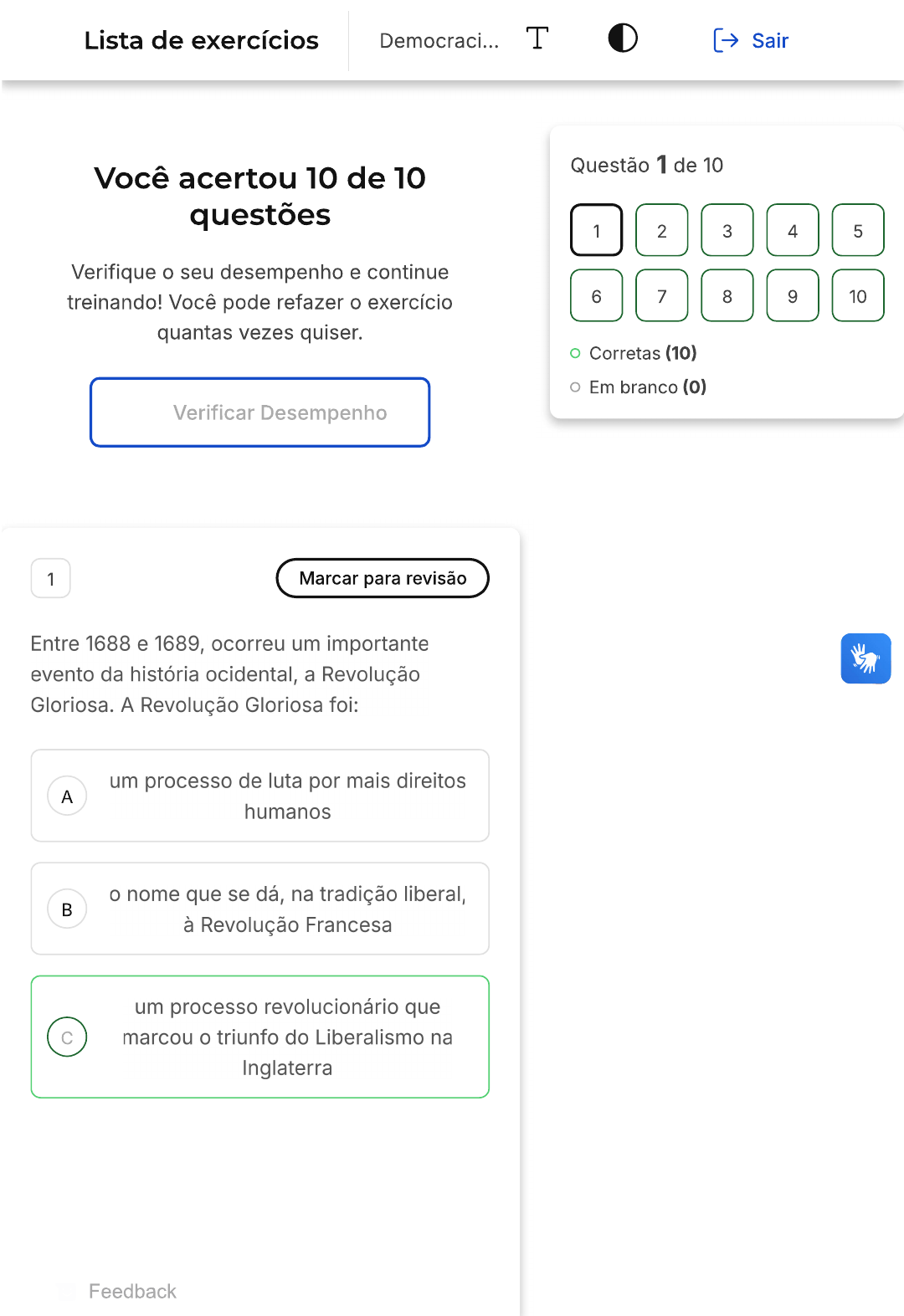 Lista de exercícios Democraci... T Sair Questão 1 de 10 Você acertou 10 de 10 questões 1 2 3 4 5 Verifique o seu desempenho e continue treinando! Você pode refazer o exercício 6 7 8 9 10 quantas vezes quiser. Corretas (10) Em branco (0) Verificar Desempenho 1 Marcar para revisão Entre 1688 e 1689, ocorreu um importante evento da história ocidental, a Revolução Gloriosa. A Revolução Gloriosa foi: um processo de luta por mais direitos A humanos o nome que se dá, na tradição liberal, B à Revolução Francesa um processo revolucionário que C marcou o triunfo do Liberalismo na Inglaterra Feedbackuma revolução que aboliu a sociedade D estamental por toda Europa ocidental a marca do triunfo dos ideais E democráticos na Inglaterra Resposta correta Parabéns, você selecionou a alternativa correta. Confira o gabarito comentado! Gabarito Comentado Esse processo revolucionário levou ao poder a burguesia na Inglaterra, ajudando a maturar as condições institucionais para o desenvolvimento da democracia liberal 2 Marcar para revisão O medo da participação popular tem contornos aristocráticos e elitistas. No entanto, a questão é seriamente debatida entre teóricos também porque esses autores entendem que: o povo não tem, em sociedades de A massas, condições de participar da política o povo tem, em sociedades de B massas, dificuldades de aprender políticao povo não dispõe, em sociedades de C massas, da disponibilidade e interesse para educar-se para a política é difícil garantir que a participação popular esteja devidamente articulada, D em sociedades de massas, com uma educação para boas decisões políticas é impossível garantir que o povo tome E as melhores decisões Resposta correta Parabéns, você selecionou a alternativa correta. Confira o gabarito comentado! Gabarito Comentado modelo agregativo tem respaldo em interpretações temerosas da participação popular. Teme-se que o povo, menos instruído que as elites, tome más decisões, motivo que inspirou, inclusive o colégio eleitoral nos EUA, dentre outros dispositivos institucionais que visam conter a participação popular 3 Marcar para revisão A democracia agonística é um modelo de democracia que enfatiza o papel do conflito e da competição política na tomada de decisões e na construção de uma sociedade mais justa eigualitária. Nesse sentido, a democracia agonística pode ser definida, sobretudo, pela: perspectiva unilateral da justiça sobre A a democracia visão de mundo baseada no B neoliberalismo C cosmovisão liberal-normativa disposição em lidar civilizadamente D com os conflitos compreensão do conflito enquanto E algo a ser sempre resolvido Resposta correta Parabéns, você selecionou a alternativa correta. Confira o gabarito comentado! Gabarito Comentado O cerne dessa teoria é o reconhecimento dos conflitos sociais e sua absorção em esferas mediadoras legítimas dentro do ordenamento democrático 4 Marcar para revisão A democracia agregativa é um modelo representativo que se baseia em uma certa distância entre a participação popular e asdecisões políticas, que são tomadas por representantes eleitos. É um modelo, contudo, que recebe críticas. Qual a principal crítica ao modelo agregativo? A É muito utópico É muito voltado para as classes B populares. C É muito elitista D É muito ultrapassado E Exige muito dos cidadãos Resposta correta Parabéns, você selecionou a alternativa correta. Confira o gabarito comentado! Gabarito Comentado Este modelo parte da ideia de que a democracia direta é inviável, dentre outras razões, principalmente pela incapacidade do homem médio de participar mais ativamente da política. 5 Marcar para revisão A democracia agonística se baseia nopluralismo e no conflito. Isso significa dizer que: esse modelo defende a radicalização A política esse modelo encampa a luta violenta B por direitos esse modelo defende uma democracia C que acomode os conflitos de modo institucional esse modelo apregoa que a escalada da extrema direita somente pode ser D contida pela escalada da extrema esquerda esse modelo justifica a luta violenta E contra a desigualdade social Resposta correta Parabéns, você selecionou a alternativa correta. Confira o gabarito comentado! Gabarito Comentado A democracia agonística consiste no reconhecimento do conflito como constitutivo das sociedades e, portanto, defende a necessidade de acomodá-lo numa ordem que transforme antagonismos em agonismos6 Marcar para revisão Entre 1688 e 1689, ocorreu um importante evento da história ocidental, a Revolução Gloriosa. A Revolução Gloriosa foi: um processo de luta por mais direitos A humanos o nome que se dá, na tradição liberal, B à Revolução Francesa um processo revolucionário que C marcou o triunfo do Liberalismo na Inglaterra uma revolução que aboliu a sociedade D estamental por toda Europa ocidental a marca do triunfo dos ideais E democráticos na Inglaterra Resposta correta Parabéns, você selecionou a alternativa correta. Confira o gabarito comentado! Gabarito Comentado Esse processo revolucionário levou ao poder a burguesia na Inglaterra, ajudando a maturar as condições institucionais para o desenvolvimento da democracia liberal7 Marcar para revisão A democracia agregativa é um modelo representativo que se baseia em uma certa distância entre a participação popular e as decisões políticas, que são tomadas por representantes eleitos. É um modelo, contudo, que recebe críticas. Qual a principal crítica ao modelo agregativo? A É muito utópico É muito voltado para as classes B populares. C É muito elitista D É muito ultrapassado E Exige muito dos cidadãos Resposta correta Parabéns, você selecionou a alternativa correta. Confira o gabarito comentado! Gabarito Comentado Este modelo parte da ideia de que a democracia direta é inviável, dentre outras razões, principalmente pela incapacidade do homem médio de participar mais ativa