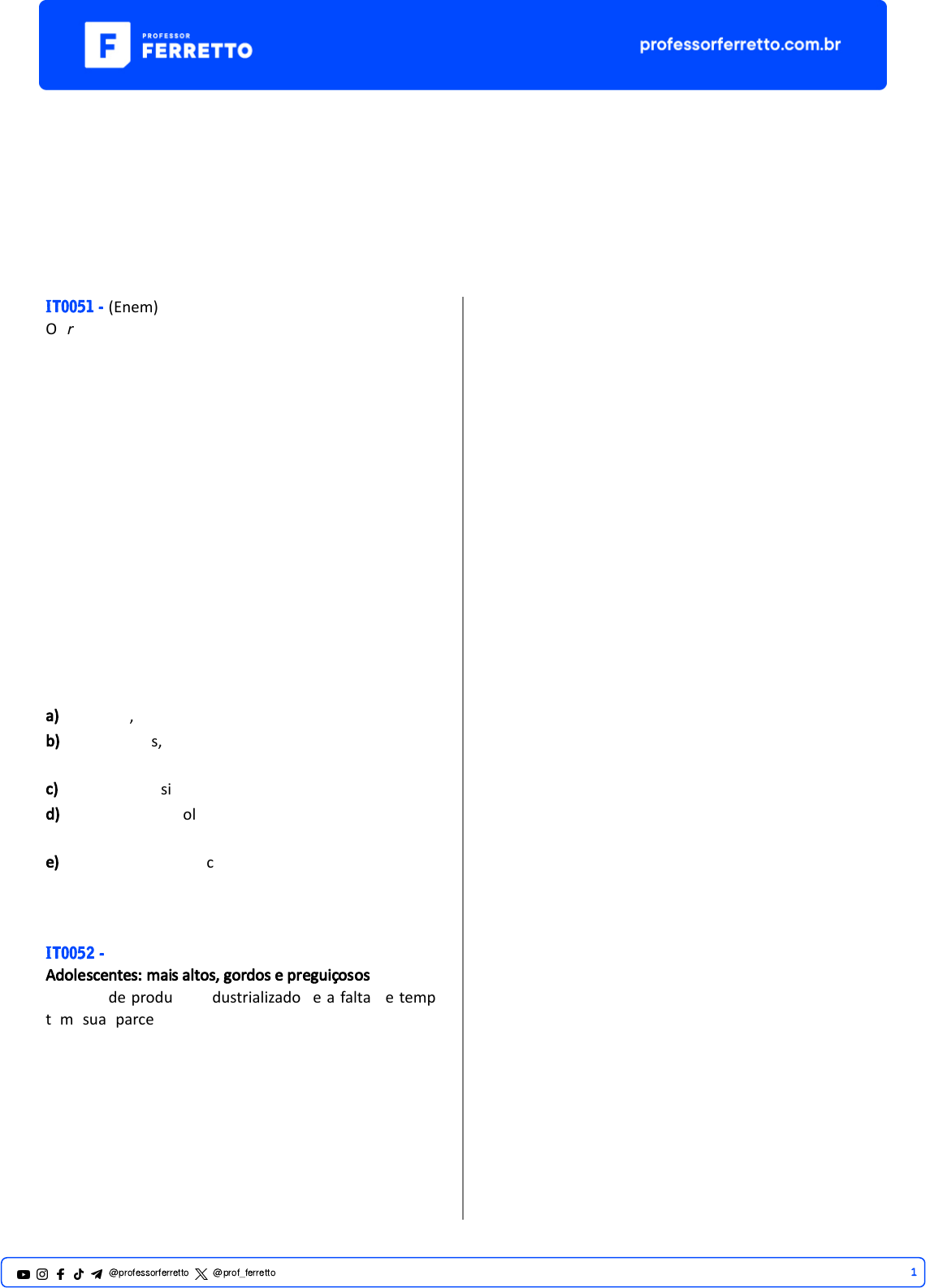 ENEM Linguagem Verbal e Não Verbal Linguagem Corporal IT0051 - (Enem) O rap, palavra formada pelas iniciais de rhythm and poetry (ritmo e poesia), junto com as linguagens da dança (o break dancing) e das artes plás�cas (o grafite), seria difundido, para além dos guetos, com o nome de cultura hip hop. O break dancing surge como uma dança de rua. O grafite nasce de assinaturas inscritas pelos jovens com sprays nos muros, trens e estações de metrô de Nova York. As linguagens do rap, do break dancing e do grafite se tornaram os pilares da cultura hip hop. DAYRELL, J. A música entra em cena: o rap e o funk na socialização da juventude. Belo Horizonte: UFMG. 2005 (adaptado). Entre as manifestações da cultura hip hop apontadas no texto, o break se caracteriza como um �po de dança que representa aspectos contemporâneos por meio de movimentos a) re�líneos, como crí�ca aos indivíduos alienados. b) improvisados, como expressão da dinâmica da vida urbana. c) suaves, como sinônimo da ro�na dos espaços públicos. d) ritmados pela sola dos sapatos, como símbolo de protesto. e) cadenciados, como contestação às rápidas mudanças culturais. IT0052 - (Enem) Adolescentes: mais altos, gordos e preguiçosos A oferta de produtos industrializados e a falta de tempo têm sua parcela de responsabilidade no aumento da silhueta dos jovens. ”Os nossos hábitos alimentares, de modo geral, mudaram muito“, observa Vivian Ellinger, presidente da Sociedade Brasileira de Endocrinologia e Metabologia (SBEM), no Rio de Janeiro. Pesquisas mostram que, aqui no Brasil, estamos exagerando no sal e no açúcar, além de tomar pouco leite e comer menos frutas e feijão. Outro pecado, velho conhecido de quem exibe excesso de gordura por causa da gula, surge como marca da nova geração: a preguiça. ”Cem por cento das meninas que par�cipam do Programa não pra�cavam nenhum esporte“, revela a psicóloga Cris�na Freire, que monitora o desenvolvimento emocional das voluntárias. Você provavelmente já sabe quais são as consequências de uma ro�na sedentária e cheia de gordura. ”E não é novidade que os obesos têm uma sobrevida menor“, acredita Claudia Cozer, endocrinologista da Associação Brasileira para o Estudo da Obesidade e da Síndrome Metabólica. Mas, se há cinco anos os estudos projetavam um futuro sombrio para os jovens, no cenário atual as doenças que viriam na velhice já são parte da ro�na deles. ”Os adolescentes já estão sofrendo com hipertensão e diabete“, exemplifica Claudia. DESGUALDO, P. Revista Saúde. Disponível em: h�p://saude.abril.com.br. Acesso em: 28 jul. 2012 (adaptado). Sobre a relação entre os hábitos da população adolescente e as suas condições de saúde, as informações apresentadas no texto indicam que 1@professorferretto @prof_ferretto a) a falta de a�vidade �sica somada a uma alimentação nutricionalmente desequilibrada cons�tuem fatores relacionados ao aparecimento de doenças crônicas entre os adolescentes. b) a diminuição do consumo de alimentos fontes de carboidratos combinada com um maior consumo de alimentos ricos em proteínas contribuíram para o aumento da obesidade entre os adolescentes. c) a maior par�cipação dos alimentos industrializados e gordurosos na dieta da população adolescente tem tornado escasso o consumo de sais e açúcares, o que prejudica o equilíbrio metabólico. d) a ocorrência de casos de hipertensão e diabetes entre os adolescentes advém das condições de alimentação, enquanto que na população adulta os fatores hereditários são preponderantes. e) a prá�ca regular de a�vidade �sica é um importante fator de controle da diabetes entre a população adolescente, por provocar um constante aumento da pressão arterial sistólica. IT0055 - (Enem) A dança é um importante componente cultural da humanidade. O folclore brasileiro é rico em danças que representam as tradições e a cultura de várias regiões do país. Estão ligadas aos aspectos religiosos, festas, lendas, fatos históricos, acontecimentos do co�diano e brincadeiras e caracterizam-se pelas músicas animadas (com letras simples e populares), figurinos e cenários representa�vos. SECRETARIA DA EDUCAÇÃO. Proposta Curricular do Estado de São Paulo, Educação Física. São Paulo, 2009 (adaptado). A dança, como manifestação e representação da cultura rítmica, envolve a expressão corporal própria de um povo. Considerando-a como elemento folclórico, a dança revela a) manifestações afe�vas, históricas, ideológicas, intelectuais e espirituais de um povo, refle�ndo seu modo de expressar-se no mundo. b) aspectos eminentemente afe�vos, espirituais e de entretenimento de um povo, desconsiderando fatos históricos. c) acontecimentos do co�diano, sob influência mitológica e religiosa de cada região, sobrepondo aspectos polí�cos. d) tradições culturais de cada região, cujas manifestações rítmicas são classificadas em um ranking das mais originais. e) lendas, que se sustentam em inverdades históricas. uma vez que são inventadas, e servem apenas para a vivência lúdica de um povo. IT0042 - (Enem) No Brasil, a disseminação de uma expecta�va de corpo com base na esté�ca da magreza é bastante grande e apresenta uma enorme repercussão, especialmente, se considerada do ponto de vista da realização pessoal. Em pesquisa feita na cidade de São Paulo, aparecem os percentuais de 90% entre as mulheres pesquisadas que se dizem preocupadas com seu peso corporal, sendo que 95% se sentem insa�sfeitas com “seu próprio corpo”. SILVA, A. M. Corpo, ciência e mercado: reflexões acerca da gestação de um novo arqué�po da felicidade. Campinas: Autores Associados; Florianópolis: UFSC, 2001 A preocupação excessiva com o “peso” corporal pode provocar o desenvolvimento de distúrbios associados diretamente à imagem do corpo, tais como a) anorexia e bulimia. b)