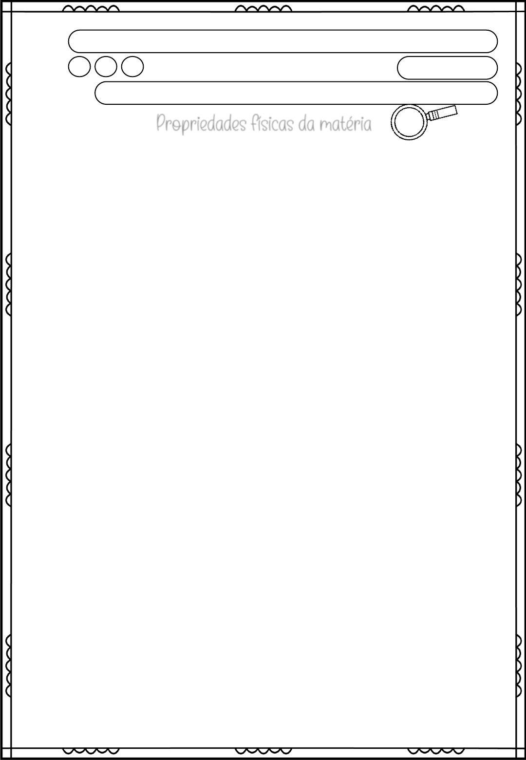 Propriedades físicas da matéria Hoje vamos embarcar em uma aventura pelo universo das propriedades físicas dos materiais. Vamos descobrir características fascinantes que nos ajudam a entender melhor tudo que nos cerca. Matéria: Antes de mais nada, o que é matéria? É simples! Matéria é tudo que ocupa espaço ao nosso redor. Desde a água que bebemos até o ar que respiramos, tudo é matéria. Densidade: A densidade é uma maneira de medir quão "apertados" estão os átomos em um material, relacionando massa e volume. Um material com alta densidade, como o ferro, tende a afundar na água, enquanto um com baixa densidade, como o algodão, flutua. Curioso, não? Por isso, 1 kg de ferro ocupa menos espaço que 1 kg de algodão. Dureza: Quando falamos de dureza, estamos medindo a capacidade de um material resistir a ser riscado ou deformado. Um exemplo claro é comparar um clipe de papel e um giz. O clipe pode riscar o giz, mostrando que tem maior dureza. No mundo dos minerais, o diamante é rei em dureza, enquanto o grafite é bem mais macio. Condutibilidade: Alguns materiais, como o metal e o cobre, são ótimos em conduzir eletricidade, ou seja, permitem que os elétrons passem por eles facilmente. É por isso que os fios elétricos são feitos de cobre. Resistência: Esta propriedade nos diz o quanto um material pode suportar impactos ou forças sem se quebrar ou deformar. Por exemplo, um parafuso é muito mais resistente do que uma varinha de madeira. Elasticidade: Elasticidade é a habilidade de um material de voltar ao seu formato original depois de ser esticado ou comprimido. Uma xuxinha de cabelo ou um cacho de cabelo cacheado são ótimos exemplos de materiais elásticos. Magnetismo: Por fim, o magnetismo é a capacidade de um material atrair certos metais. O ferro e o aço comum, por exemplo, são atraídos por ímãs. Mas lembrem-se, nem todos os metais têm essa propriedade. Data: Turma: Estudante: Escola: 1. O que é matéria? a) Algo que só podemos ver b) Algo que só podemos sentir c) Tudo que ocupa espaço d) Apenas líquidos e gases 2. O que significa 'densidade' de um material? a) A cor do material b) O espaço que ocupa c) A relação entre massa e volume d) A forma do material 3. Se dois objetos têm a mesma massa, mas um afunda na água e o outro flutua, o que isso nos diz sobre a densidade deles? ________________________________________________________________________ ________________________________________________________________________ 4. Cite dois exemplos de materiais com magnetismo: ________________________________________________________________________ 5. O que é condutibilidade? Dê um exemplo de um bom condutor. ________________________________________________________________________ ________________________________________________________________________ 6. Explique a diferença entre resistência e elasticidade em materiais. ________________________________________________________________________ ________________________________________________________________________ ________________________________________________________________________ ________________________________________________________________________ 7. Dê um exemplo de um objeto que você usa na escola ou em casa que demonstra elasticidade. ________________________________________________________________________ 8. O que é magnetismo? ________________________________________________________________________ ________________________________________________________________________ 9. O que acontece com um material elástico quando é esticado? ________________________________________________________________________ PROPRIEDADES FÍSICAS DA MATÉRIA 1. Responda às perguntas e complete a cruzadinha. a) Qual é a propriedade que mede quão juntos estão os átomos em um material? ___________________________________ b) Qual propriedade mede a resistência de um material a ser riscado? ___________________________________ c) Qual propriedade permite que os elétrons passem facilmente por um material? ___________________________________ d) Qual propriedade descreve a capacidade de um material aguentar impactos sem quebrar? ____________________________________ e) Como chamamos a capacidade de um material voltar ao seu formato original após ser esticado? __________________________________ f) Qual é a propriedade de atrair certos metais, como ferro e aço? ____________________________________ Data: Turma: Estudante: Escola: HORA DE EXPLORAR! Por que algumas coisas afundam e outras flutuam? A densidade é uma propriedade que nos mostra o quanto de matéria existe em um determinado espaço. Imaginem um cubo de chumbo e um cubo de isopor do mesmo tamanho. O cubo de chumbo é muito mais pesado, certo? Isso acontece porque o chumbo tem uma densidade maior do que o isopor. Experimento da Densidade • Material Necessário: 1 recipiente transparente com água Objetos de diferentes materiais (metal, madeira, plástico, etc.) • Procedimento: Coloque os objetos na água e observe quais afundam e quais flutuam. Discuta com a turma: os objetos que afundam têm densidade maior ou menor do que a água? Registre na tabela abaixo, os materiais usados, se afundam ou não, e a explicação. Data: Turma: Estudante: Escola: Objeto usado Afunda ou flutua? Explicação: HORA DE EXPLORAR! Por que alguns materiais ficam quentes rapidamente? Condutibilidade Térmica: Por que alguns materiais ficam quentes rapidamente? A condutibilidade térmica é a habilidade de um material de conduzir calor. Materiais com alta condutibilidade térmica, como metais, aquecem rapidamente. Já materiais com baixa condutibilidade, como madeira e plástico, demoram mais para esquentar. Experimento da Densidade • Material Necessário: Colheres de diferentes materiais (metal, madeira, plástico) 1 xícara de água quente • Procedimento: Coloque as colheres na xícara com água quente. Com cuidado, toque as colheres após alguns minu
