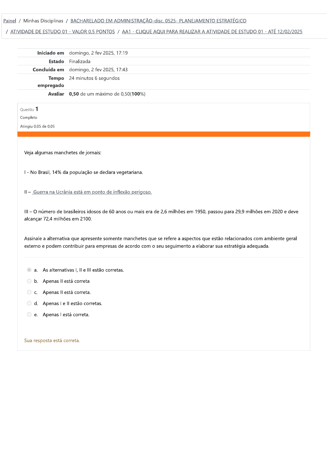 Painel / Minhas Disciplinas / BACHARELADO EM ADMINISTRAÇÃO-disc. 0525- PLANFJAMENTO ESTRATÉGICO / ATIVIDADE DE ESTUDO 01 - VALOR 0,5 PONTOS / AA1 - CLIQUE AQUI PARA REALIZAR A ATIVIDADE DE ESTUDO 01 - ATÉ 12/02/2025 Iniciado em domingo, 2 fev 2025, 17:19 Estado Finalizada Concluída em domingo, 2 fev 2025, 17:43 Tempo 24 minutos 6 segundos empregado Avaliar 0,50 de um máximo de 0,50(100%) Questão 1 Completo Atingiu 0,05 de 0,05 Veja algumas manchetes de jornais: - No Brasil, 14% da população se declara vegetariana. - Guerra na Ucrânia está em ponto de inflexão perigoso. III - número de brasileiros idosos de 60 anos ou mais era de 2,6 milhões em 1950, passou para 29,9 milhões em 2020 e deve alcançar 72,4 milhões em 2100. Assinale a alternativa que apresente somente manchetes que se refere a aspectos que estão relacionados com ambiente geral externo e podem contribuir para empresas de acordo com o seu seguimento a elaborar sua estratégia adequada. a. As alternativas I, e III estão corretas. b. Apenas está correta C. Apenas II está correta. d. Apenas e estão corretas. e. Apenas está correta. Sua resposta está correta.Questão 2 Completo Atingiu 0,05 de 0,05 que irá determinar a rentabilidade de um setor, seja médio ou longo prazo, é a maneira e a intensidade como se manifestam cada uma das 5 forças competitivas. Assinale a alternativa que apresente somente as 5 Forças competitivas de Porter. a. Missão, visão, valores, objetivos e princípios. b. Concorrência, fornecedores, compradores, novos entrantes e substitutos. C. Aspectos organizacionais, aspecto pessoal, aspectos financeiros, aspectos de marketing e aspecto de produção. d. Mudanças tecnológicas, tendências demográficas, mudanças organizacionais, tendências culturais e climas econômicos. e. Oportunidades, ameaças, forças e fraquezas. Sua resposta está correta. Questão 3 Completo Atingiu 0,05 de 0,05 Estratégia pode ser definida "como o conjunto de ações e iniciativas criativas que levam uma empresa ao sucesso" (SERTEK, P. GUINDANI, MARTINS, T. 2010, p. 113), porém nenhuma estratégia é bem executada sem um bom planejamento. Assinale a alternativa em que apresenta os principais direcionamentos sobre o planejamento. a. planejamento é apenas para contribuir com as definições das ações que os diretores precisam realizar com o time. b. planejamento apresenta como fazer e o que fazer. C. O objetivo único e principal do planejamento é o controle do desempenho das estratégias. d. planejamento não contribui para tomada de decisões. e. planejamento é um documento elaborado somente pela autogestão. Sua resposta está correta.Questão 4 Completo Atingiu 0,05 de 0,05 Analise quais são exemplos corretos de quando pode ocorrer vantagem competitiva e classifique em Verdadeiro (V) ou Falso (F): ( ) baixo custo. ( ) qualidade do produto. ( ) diferenciação do produto. Assinale a alternativa correta: a. F. b. V. C. d. V F V. e. Sua resposta está correta.Questão 5 Completo Atingiu 0,05 de 0,05 Sobre a análise Swot, veja as seguintes asserções: I. A análise Swot inicialmente era utilizada por empresas de grande porte e com o tempo passou a ser utilizada por empresas de porte menor, essas passaram a utilizar como uma ferramenta de autoconhecimento do seu negócio, assim contribui para compreensão dos seus pontos fortes e fracos, oportunidades e ameaças externas. PORQUE II. A descoberta das ameaças e oportunidades não são fatores determinantes para se desistir do projeto e sim uma forma de trazer consciência e pensar em novos planos. Assinale a alternativa correta: a. As asserções e são proposições verdadeiras e a é uma justificativa correta da I. b. A asserção é uma proposição falsa e a é uma proposição verdadeira. C. As asserções e são proposições falsas d. As asserções e são proposições verdadeiras, mas a II não é uma justificativa correta da I. e. A asserção é uma proposição verdadeira e a II é uma proposição falsa. Sua resposta está correta.Questão 6 Completo Atingiu 0,05 de 0,05 Veja as afirmativas a respeito da elaboração dos objetivos e assinale a alternativa que corresponde sobre sua importância: - - Os objetivos são a primeira etapa na elaboração da estratégia, antes mesmo da visão e missão. - Os objetivos são criados para contribuir de forma com que a empresa alcance a sua missão. III - Não deve criar mais que objetivos para cada plano. a. Apenas está correta. b. As alternativas I, e III estão corretas. C. Apenas está correta. d. Apenas I e II estão corretas. e. Apenas III está correta. Sua resposta está correta. Questão 7 Completo Atingiu 0,05 de 0,05 Para uma empresa ter sucesso e se destacar diante dos seus concorrentes, o planejamento é uma ferramenta fundamental e apresenta diversos benefícios: - - Possibilita uma ação proativa dos envolvidos. - Possibilita o controle de desempenho durante a execução do processo. III - - Foco no objetivo traçado. Analise as alternativas e assinale a que corresponde aos benefícios do planejamento. a. Apenas e III estão corretas. b. Apenas está correta. C. As alternativas I, II e III estão corretas. d. Apenas e III estão corretas. e. Apenas I e II estão corretas. Sua resposta está correta.Questão 8 Completo Atingiu 0,05 de 0,05 Analise as afirmativas abaixo sobre estratégia e assinale Verdadeiro (V) ou Falso (F): ( ) Pela perspectiva da economia industrial, a estratégia é vista como uma forma de as forças de mercado e influenciar o ambiente competitivo. ( ) Análises das forças é um recurso do planejamento para encontrar os melhores gestores para atuar nos projetos adequados. ( ) Inovação e criatividade são importantes para a empresa se destacar no mercado e assim os consumidores sintam motivados a escolhê-la no lugar do concorrente. a. b. V. d. V. Sua resposta está correta.Questão 9 Completo Atingiu 0,05 de 0,05 O planejamento estratégico é importante 