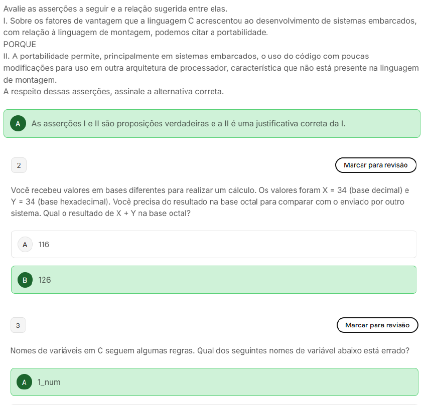 Avalie as asserções a seguir e a relação sugerida entre elas. I. Sobre os fatores de vantagem que a linguagem C acrescentou ao desenvolvimento de sistemas embarcados, com relação à linguagem de montagem, podemos citar a portabilidade. PORQUE II. A portabilidade permite, principalmente em sistemas embarcados, uso do código com poucas modificações para uso em outra arquitetura de processador, característica que não está presente na linguagem de montagem. A respeito dessas asserções, assinale a alternativa correta. A As asserções e II são proposições verdadeiras e a é uma justificativa correta da I. 2 Marcar para revisão Você recebeu valores em bases diferentes para realizar um cálculo. Os valores foram X = 34 (base decimal) e Y = 34 (base hexadecimal). Você precisa do resultado na base octal para comparar com o enviado por outro sistema. Qual resultado de X+Y na base octal? A 116 B 126 3 Marcar para revisão Nomes de variáveis em C seguem algumas regras. Qual dos seguintes nomes de variável abaixo está errado? A 1_numprograma em C a seguir chama uma função chamada func(), passando os três valores fornecidos pelo usuário. que a função func() retorna? #include int func(int a, int b. int c); int main(){ A Retorna menor valor fornecido pelo usuário. B Retorna primeiro valor fornecido pelo usuário. C Retorna último valor fornecido pelo usuário. D Retorna segundo valor fornecido pelo usuário. E Retorna maior valor fornecido pelo usuário.5 Marcar para revisão Um sistema embarcado pode ser gerenciado por software embarcado ou não, dependendo do dispositivo central de processamento utilizado no projeto. 1 Microcontrolador 2 Microprocessador 3 FPGA 4 DSP 5 ASIC 6 Raspberry Pi Qual alternativa abaixo corresponde aos dispositivos que podem controlar um sistema embarcado sem software embarcado? A 1-3 B 4-5 C 1-2 D 5-6 E 3-5 6 Marcar para revisão Considere as afirmações abaixo sobre sistemas embarcados. - Todo sistema embarcado com RTOS é de tempo real. - Todo sistema embarcado sem sistema operacional é de tempo real. III - Todo sistema embarcado bare metal é de tempo real. IV - Todo sistema embarcado com Linux é de tempo real. Quais as opções estão corretas? A I, III 7 Marcar para revisão seu grupo de projeto resolveu usar um sistema de numeração de base 4. Qual a notação posicional correta do número 2312 na base 4? A 23124=8 Marcar para revisão Você precisa simplificar a expressão abaixo, usando as regras da álgebra booleana para usar menos portas lógicas no circuito a ser montado e diminuir consumo. Qual a expressão simplificada? ABC+ABC+ABC A AB+B+C B A+BC C AB+C D B+C E A(B + C) 9 Marcar para revisão Você chegou à expressão lógica (1) abaixo para implementar um circuito lógico de desligamento de uma máquina. Porém, gerente técnico pediu para você usar a expressão lógica (2) no lugar, dizendo que é equivalente a (1). Que regra(s) ele usou para fazer esta alteração? A Idempotente B Associativa C Distributiva e idempotente D De Morgan10 Marcar para revisão Examinando as regras para soma lógica abaixo, vemos que os valores se assemelham à tabela-verdade de uma porta lógica. Que tipo de porta é essa? A B Q 0 0 0 0 1 1 1 0 1 1 1 1 A NOR B NAND C AND D XOR E OR 1 Marcar para revisão ) Assinale abaixo a opção correta que mostra a sintaxe do comando if que verifica se a variável número é divisível por 2 e por 7 (Exemplo: 14 é divisível por dois e por 7). A sintaxe do if é apenas para opção verdadeira, não tem a alternativa else. A if ( ((numero % 2)==0) ((numero % printf("O número é divisível por 2 e por 7"); B if ( ((numero % 2)==0) == ((numero % 7)==0) ) printf("O número é divisível por 2 e por 7"); C if ( ((numero 2)==0)2 Marcar para revisão Com relação às estruturas de repetição (ou laços) na linguagem C, for, while e do-while. Qual opção abaixo é verdadeira? A A condição dentro de um laço while e do-while não precisa ser colocada dentro de parênteses. B Os laços while e for executam sempre, pelo menos uma vez, corpo do laço. C laço do while executa sempre, pelo menos uma vez, corpo do laço. 3 Marcar para revisão Interprete programa abaixo e assinale qual das opções será impressa na saída. #define TAM 4 main() { int i = 0; int X = 1000; int v[TAM] = {30,20,30,40}; for (i=0;i printf("%d",x); } Assinale a opção correta: A 780 B 870 C 8804 Marcar para revisão A respeito da estrutura struct da linguagem C, podemos afirmar que: A estrutura struct da linguagem C permite incluir, em uma única entidade, somente elementos de tipos A diferentes. Normalmente, os elementos da estrutura struct da linguagem C não têm nenhuma relação semântica B com o nome da estrutura. Por exemplo: os elementos associados a uma identidade pessoal (número, nome e data de nascimento). C A definição de uma estrutura (struct) é baseada no tipo de dado chamado vetor (array). Uma estrutura é um conjunto de uma ou mais variáveis agrupadas sob um único nome, de forma a D facilitar a sua referência. 5 Marcar para revisão Analise código abaixo. Int while { printf("n=%d\n",n); } Após a verificação, escolha uma das opções abaixo que tenha a mesma saída que comando while. A for(n=2; n6 Marcar para revisão Dentre os operadores da linguagem C, operador ternário (?) pode substituir a estrutura de condição if-else. Dado a instrução abaixo: numero = 0? numero++ : numero--; Se valor da variável (numero) for -10, qual será resultado do comando? A 10 B 11 C 9 D -11 7 Marcar para revisão Uma variável do tipo básico unsigned char na linguagem C é armazenada em 1(um) byte de memória e intervalo de valores permitido é de 0 a 255. Considerando tipo básico char. Qual das alternativas abaixo é a correta quanto à quantidade de memória armazenada e intervalo de valores usados pelo tipo char? A 2 bytes; intervalo: -255 a 0. B 1 byte; intervalo: -128 a 127. 8 Marcar para revisão Com relação à u