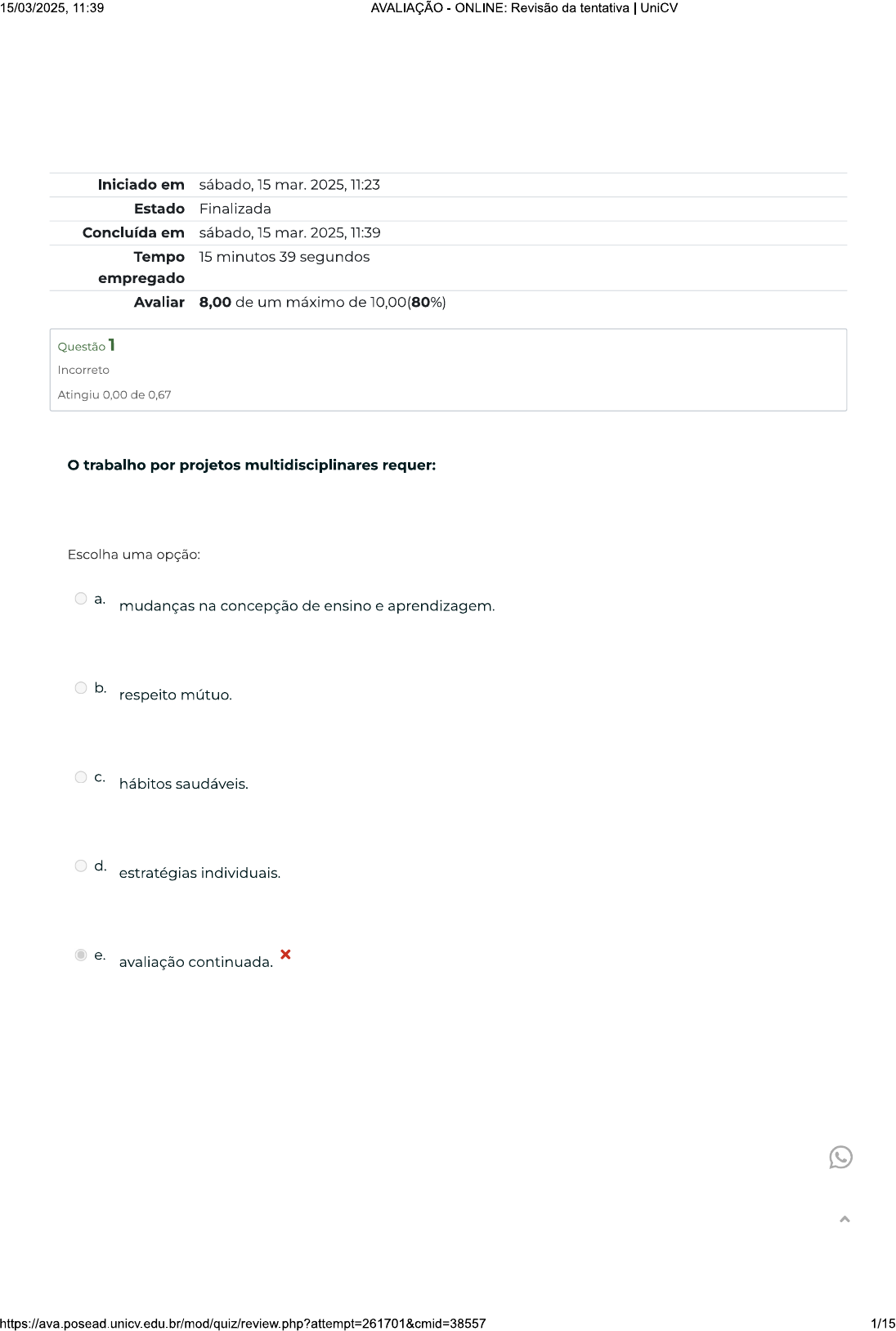 15/03/2025, 11:39 AVALIAÇÃO - ONLINE: Revisão da tentativa UniCV Iniciado em sábado, 15 mar. 2025, 11:23 Estado Finalizada Concluída em sábado, 15 mar. 2025, 11:39 Tempo 15 minutos 39 segundos empregado Avaliar 8,00 de um máximo de 10,00(80%) Questão 1 Incorreto Atingiu 0,00 de 0,67 trabalho por projetos multidisciplinares requer: Escolha uma opção: a. mudanças na concepção de ensino e aprendizagem. b. respeito mútuo. C. hábitos saudáveis. d. estratégias individuais. e. avaliação continuada. x 1/1515/03/2025, 11:39 AVALIAÇÃO - Revisão da tentativa UniCV Questão 2 Incorreto Atingiu 0,00 de 0,66 Sabe-se que alguns pesquisadores da área educacional resistem em atribuir valor à afetividade; isso é percebido, por exemplo, na exposição de alguns trabalhos sobre o tema. No entanto, estudos de teóricos significativos para a educação abrangem a questão da afetividade no processo de ensino- aprendizagem, em especial nos estudos do educador francês Henri Wallon. desenvolvimento cognitivo resulta da interação entre a criança e as pessoas com quem ela mantém contatos regulares, no caso da escola, o aluno e os professores. Assim sendo, pode-se considerar, sobre a afetividade na aprendizagem, que: Escolha uma opção: a. professor não deve estar disponível para conversar sobre problemas pessoais e afetivos com seus alunos. b. As crianças assimilam as experiências aos esquemas afetivos, diferente do modo que assimilam as experiências às estruturas cognitivas. C. A aprendizagem tem estreitos vínculos com a afetividade, pois esta está intimamente ligada às interações entre os sujeitos pertencentes do processo educativo. Pode-se dizer que processo educativo é um processo movido pela empatia. d. A escola deve manter um certo afastamento do aluno na construção da sua personalidade, visto que isso é uma responsabilidade especificamente da família. e. Na aprendizagem escolar, a relação entre alunos, professores, conteúdo escolar, livros e escrita se dá puramente no campo cognitivo. 2/1515/03/2025, 11:39 AVALIAÇÃO - Revisão da tentativa I UniCV Questão 3 Correto Atingiu 0,67 de 0,67 As experiências transformadoras estão atreladas à combinação forma e conteúdo. Como o educador pode pensar e realizar um ensino que favoreça as aprendizagens? Escolha uma opção: a. Deixando os alunos livres para que conduzam tanto os conteúdos como as estratégias de aprendizagem. b. Buscando conhecer aluno e fazê-lo perceber suas capacidades para aprender. C. Utilizando mais estratégias de acúmulo e repetição de conteúdo, para facilitar processo de aprendizagem. d. Utilizando exercícios para serem realizados fora do espaço de sala de aula. e. Priorizando a prática em detrimento da teoria, pois a teoria é muito cansativa. 3/1515/03/2025, 11:39 AVALIAÇÃO - Revisão da tentativa UniCV Questão 4 Correto Atingiu 0,66 de 0,66 Acerca do planejamento docente, é correto afirmar que: Escolha uma opção: a. deve ser construído de forma individual, pois cada professor possui uma realidade, que impede que planejamento seja feito coletivamente. b. é um instrumento coletivo redutor de conhecimento, que contribui para padronizar os conteúdos que serão trabalhados. C. serve para auxiliar professor na sua organização diária, visto que é uma exigência burocrática exigida por todas as escolas. d. deve ser realizado apenas no início e no fim do ano letivo, a fim de guiar os professores quanto as atividades iniciais e avaliar como decorreram. e. professor utiliza como oportunidade de reflexão e avaliação da sua prática, organizando e reorganizando seu trabalho. 4/1515/03/2025, 11:39 AVALIAÇÃO - ONLINE: Revisão da tentativa UniCV Questão 5 Correto Atingiu 0,67 de 0,67 As metodologias ativas por meio de projetos são caminhos para iniciar um processo de mudança no processo de ensino-aprendizagem. Quando os projetos acontecem a partir da integração de mais de uma disciplina, professores e áreas de conhecimento, chama-se de: Escolha uma opção a. projetos político-pedagógicos. b. projetos de pesquisa. C. projetos integradores ou interdisciplinares. d. projetos integradores ou transdisciplinares. e. projetos dentro de cada disciplina. 5/1515/03/2025, 11:39 AVALIAÇÃO - Revisão da tentativa UniCV Questão 6 Correto Atingiu 0,67 de 0,67 Em relação à tutoria em sala de aula, como forma de orientar a participação ativa do aluno no processo de aprendizagem, marque a opção INCORRETA: Escolha uma opção: a. A tutoria é uma estratégia que pode ser aplicada tanto por um aluno quanto por um outro professor. b. A tutoria pode auxiliar na identificação de deficiências e dificuldades de aprendizagem no aluno. C. A tutoria, assim como processo de mentoring, é uma prática pedagógica utilizada para estimular a interação professor aluno. d. Para utilizar a tutoria, é necessário que professor atenda um determinado perfil. e. A tutoria permite estratégias de interação e de condução do processo ensino-aprendizagem. 6/1515/03/2025, 11:39 AVALIAÇÃO - ONLINE: Revisão da tentativa I UniCV Questão 7 Correto Atingiu 0,67 de 0,67 A aprendizagem e o conhecimento se destacam por meio de três linhas epistemológicas: inatismo, empirismo e interacionismo. Assinale a alternativa que explique o conceito de interacionismo: Escolha uma opção: a. sujeito nasce como uma folha em branco, ou seja, desprovido de qualquer conhecimento. b. conhecimento está fora dos alunos. C. A aprendizagem e conhecimento se dão a partir das relações e interações dos sujeitos com meio. d. professor é o sujeito que ensina e aluno sujeito que aprende. e. Aprendizagem e conhecimento não têm a ver com meio em que os sujeitos vivem. 7/1515/03/2025, 11:39 AVALIAÇÃO - Revisão da tentativa UniCV Questão 8 Correto Atingiu 0,66 de 0,66 De que forma o professor pode organizar o seu trabalho pedagógico? Escolha uma opção: a. Organizando as atividades a partir das ques