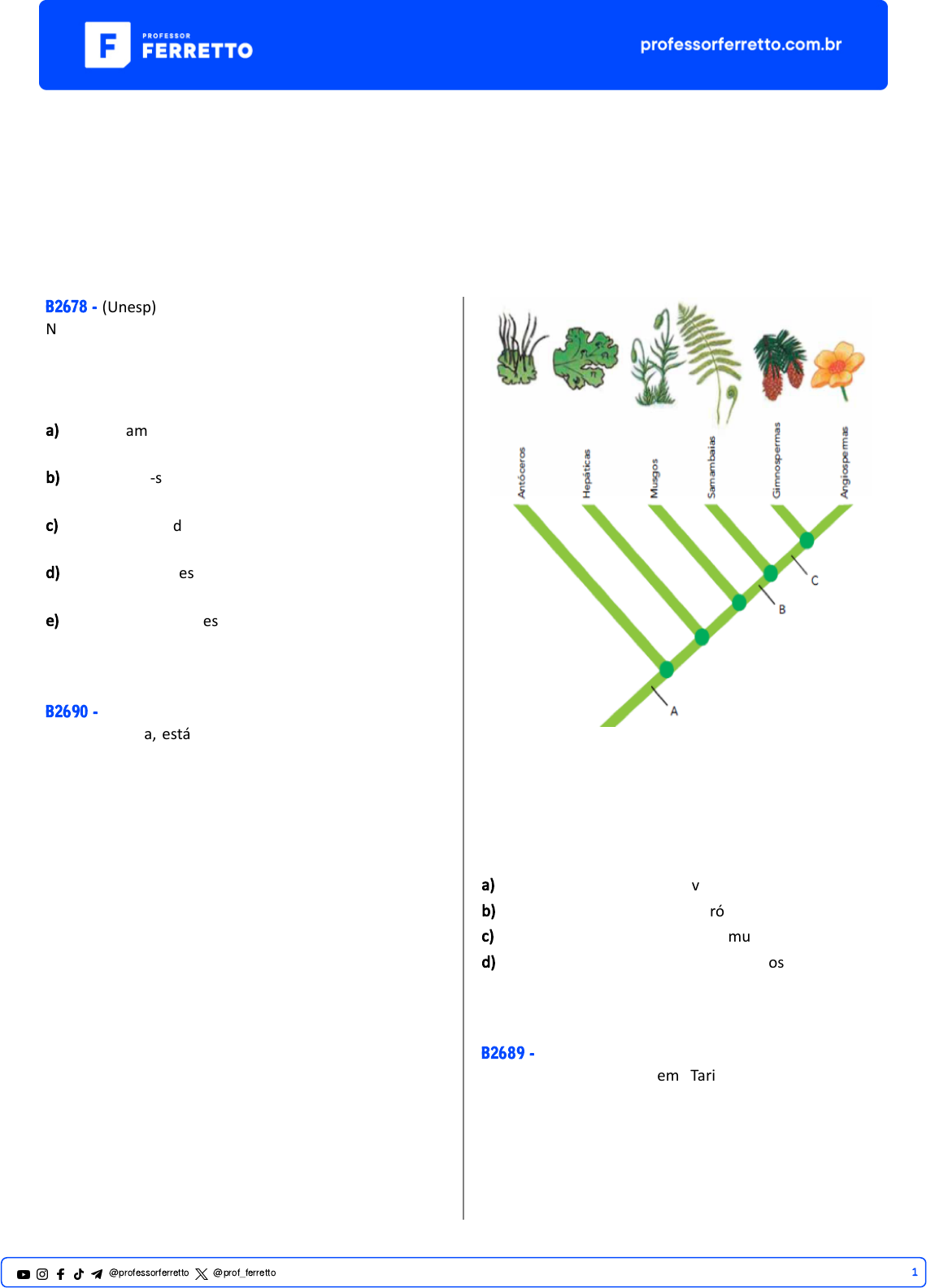 Vestibulares Botânica Introdução à Reprodução Vegetal B2678 - (Unesp) Na aula de biologia, a professora comentou que as briófitas poderiam ser consideradas “os an�bios do reino vegetal”. Esta afirmação é válida se considerarmos que as briófitas, assim como alguns an�bios, a) apresentam um sistema de distribuição de água pelo corpo que se dá de célula para célula, por osmose. b) reproduzem-se por alternância de gerações (metagênese). c) têm uma fase do desenvolvimento (gametófito) que ocorre exclusivamente na água. d) sofrem um processo de metamorfose, durante o qual se alteram os mecanismos de captação de oxigênio. e) vivem em ambientes úmidos e dependem da água para a fecundação. B2690 - (Uerj) No cladograma, está representado o grau de parentesco entre diferentes grupos de vegetais. Adaptado de biologiaevolu�va.wordpress.com. As letras A, B e C indicam, respec�vamente, o momento em que surgem, ao longo do processo evolu�vo, as seguintes caracterís�cas dos vegetais: a) cu�cula, sementes, tecidos vasculares. b) embriões mul�celulares, esporófito dominante, frutos. c) esporófito dominante, embriões mul�celulares, frutos. d) gametângios mul�celulares, tecidos vasculares, sementes. B2689 - (Unichristus) Cien�stas descobriram em Tarija (Colômbia) o fóssil vegetal mais an�go já encontrado na América do Sul, de 400 milhões de anos. Trata-se de uma das “plantas superiores” mais an�gas, cuja proliferação permi�u o desenvolvimento da vida animal fora dos oceanos. Revista Terra – Fev./96 - No 2 - Edição 46 - Editora Azul. 1@professorferretto @prof_ferretto É sabido que as plantas sofreram evolução passando do meio aquá�co ao terrestre. Várias adaptações ocorreram, levando o grupo mais adaptado ao ambiente terrestre, as Angiospermas, a conquistarem todos os ambientes do planeta. Baseado no texto e conhecimentos correlatos, pode-se inferir que a) para que a conquista do ambiente terrestre fosse efe�va, foi necessário o desaparecimento de vasos condutores. b) nas criptógamas, a fase gameto��ca correspondente a um período curto que depende da água. c) a evolução levou ao aparecimento da semente e do fruto, estruturas protetoras do embrião e que proporcionam condições inadequadas à sua dispersão. d) as angiospermas ainda dependem do meio líquido para a sua reprodução, pois os seus gametas masculinos apresentam flagelos, estruturas adaptadas à locomoção. e) as raízes exercem funções de fixação do vegetal e absorção da água e foram estruturas selecionadas durante a evolução, propiciando assim, a expansão das plantas no meio terrestre. B2686 - (Fuvest) A tabela abaixo relaciona algumas caracterís�cas de três grupos de plantas: O preenchimento correto da tabela deve subs�tuir os números I, II e III, respec�vamente, por a) briófitas, gimnospermas e angiospermas. b) pteridófitas, gimnospermas e angiospermas. c) briófitas, pteridófitas e angiospermas. d) briófitas, pteridófitas e gimnospermas. e) pteridófitas, angiospermas e gimnospermas. B2677 - (Upe) A evolução das plantas terrestres se deu a par�r de plantas aquá�cas, provavelmente algas cloro�ceas mul�celulares, rela�vamente complexas, há aproximadamente 500 milhões de anos. Entretanto, a conquista do ambiente terrestre necessitou de uma série de adaptações que permi�ssem sua sobrevivência e seu ciclo de vida. Os problemas enfrentados pelas espécies de plantas terrestres estão relacionados a seguir: I. Desidratação; II. Sustentação; III. Reprodução; IV. Respiração; V. Nutrição. Correlacione as adaptações evolu�vas das plantas terrestres aos problemas listados acima. Assinale a alterna�va que apresenta a respec�va correlação a) I. Epiderme e Súber II. Caule e raiz III. Esporângio e Flores IV. Estômatos V. Vasos condutores b) I. Caule e raiz II. Epiderme e Súber III. Estômatos IV. Epiderme e Súber V. Vasos condutores c) I. Esporângio e Flores II. Estômatos III. Caule e raiz IV. Caule e raiz V. Vasos condutores d) I. Estômatos II. Epiderme e Súber III. Vasos condutores IV. Caule e raiz V. Esporângio e Flores e) I. Estômatos II. Epiderme e Súber III. Esporângio e Flores IV. Vasos condutores V. Caule e raiz B2684 - (Fuvest) As afirmações abaixo referem-se a caracterís�cas do ciclo de vida de grupos de plantas terrestres: musgos, samambaias, pinheiros e plantas com flores. I. O grupo evolu�vamente mais an�go possui fase haploide mais duradoura do que fase diploide. II. Todos os grupos com fase diploide mais duradoura do que fase haploide apresentam raiz, caule e folha verdadeiros. III. Os grupos que possuem fase haploide e diploide de igual duração apresentam, também, rizoides, filoides e cauloides (ou seja, raiz, folha e caule não verdadeiros). Está correto apenas o que se afirma em a) I. b) II. c) III. d) I e II. e) II e III. B2692 - (Ufrgs) Assinale com V (verdadeiro) ou F (falso) as afirmações abaixo, em relação aos organismos que pertencem ao 2@professorferretto @prof_ferretto reino Plantae. (_) Os caules e as folhas são reves�dos por uma cu�cula. (_) As Pteridófitas possuem o esporófito reduzido. (_) Os embriões mul�celulares possuem cavidades internas. (_) As que se reproduzem sexuadamente apresentam alternância de ploidia. A sequência correta de preenchimento dos parênteses, de cima para baixo, é a) FFVF. b) VFFV. c) FVFF. d) VVFF. e) FVVV. B2682 - (Facid) Observe o ciclo de vida haplodiplobionte generalizado na imagem abaixo, �pico dos vegetais. De acordo com o ciclo apresentado e os seus conhecimentos sobre os grupos vegetais, analise as afirma�vas a seguir: I. O esporófito é um organismo diploide (2n), enquanto o gametófito é haploide (n). II. Os esporos são produzidos por meiose espórica, enquanto os gametas são formados a par�r de meiose gamé�ca. III. Nas plantas vasculares, o esporófito representa a g