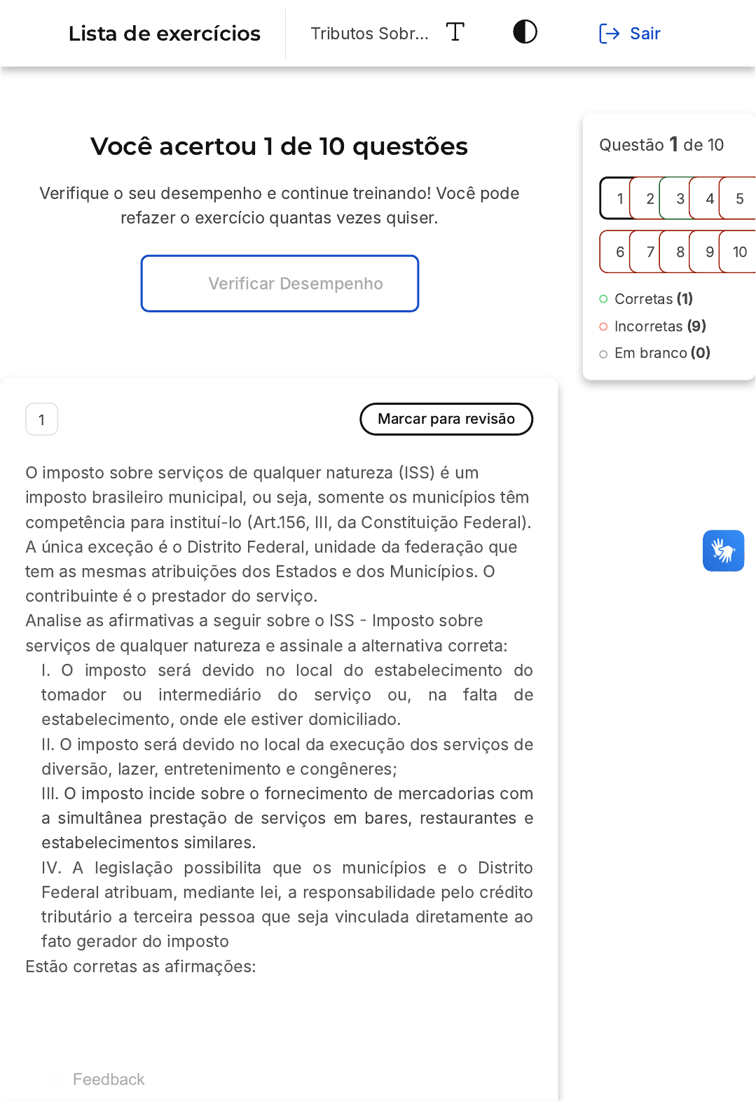 Você acertou 1 de 10 questões Verifique o seu desempenho e continue treinando! Você pode refazer o exercício quantas vezes quiser. Verificar Desempenho 1 Marcar para revisão O imposto sobre serviços de qualquer natureza (ISS) é um imposto brasileiro municipal, ou seja, somente os municípios têm competência para instituí-lo (Art.156, III, da Constituição Federal). A única exceção é o Distrito Federal, unidade da federação que tem as mesmas atribuições dos Estados e dos Municípios. O contribuinte é o prestador do serviço. Analise as afirmativas a seguir sobre o ISS - Imposto sobre serviços de qualquer natureza e assinale a alternativa correta: I. O imposto será devido no local do estabelecimento do tomador ou intermediário do serviço ou, na falta de estabelecimento, onde ele estiver domiciliado. II. O imposto será devido no local da execução dos serviços de diversão, lazer, entretenimento e congêneres; III. O imposto incide sobre o fornecimento de mercadorias com a simultânea prestação de serviços em bares, restaurantes e estabelecimentos similares. IV. A legislação possibilita que os municípios e o Distrito Federal atribuam, mediante lei, a responsabilidade pelo crédito tributário a terceira pessoa que seja vinculada diretamente ao fato gerador do imposto Estão corretas as afirmações: Questão 1 de 10 Corretas (1) Incorretas (9) Em branco (0) 1 2 3 4 5 6 7 8 9 10 Lista de exercícios Tributos Sobr… Sair Feedback A B C D E I e III apenas. II e III apenas. I, III e IV apenas. I, II e IV apenas. I, II, III e IV. Resposta incorreta Opa! A alternativa correta é a letra D. Confira o gabarito comentado! Gabarito Comentado A alternativa correta é a que afirma que as afirmações I, II e IV estão corretas. A afirmação I está correta, pois o ISS é devido no local do estabelecimento do tomador ou intermediário do serviço ou, na falta de estabelecimento, onde ele estiver domiciliado. A afirmação II também está correta, pois o ISS é devido no local da execução dos serviços de diversão, lazer, entretenimento e congêneres. A afirmação IV está correta, pois a legislação permite que os municípios e o Distrito Federal atribuam, mediante lei, a responsabilidade pelo crédito tributário a terceira pessoa que seja vinculada diretamente ao fato gerador do imposto. No entanto, a afirmação III está incorreta, pois o fornecimento de mercadorias com a simultânea prestação de serviços em bares, restaurantes e estabelecimentos similares constitui fato gerador do ICMS, e não do ISS, a incidir sobre o valor total da operação. A B C 2 Marcar para revisão O ICMS (imposto sobre operações relativas à circulação de mercadorias e sobre prestações de serviços de transporte interestadual, intermunicipal e de comunicação) é de competência dos Estados e do Distrito Federal. Sua regulamentação constitucional está prevista na Lei Complementar 87/1996 (a chamada "Lei Kandir"). Analise as afirmativas a seguir sobre ICMS e assinale a alternativa correta: I. O ICMS incide sobre o fornecimento de mercadorias com prestação de serviços não compreendidos na competência tributária dos Municípios; II. O ICMS incide sobre o fornecimento de mercadorias com prestação de serviços sujeitos ao imposto sobre serviços, de competência dos Municípios, quando a lei complementar aplicável expressamente o sujeitar à incidência do imposto estadual. III. O ICMS é um tributo de competência Estadual, mas alíquotas interestaduais são de competência do Senado Federal. IV. Salvo deliberação em contrário dos estados e do Distrito Federal, a alíquota interna não pode ser superior à alíquota interestadual. Estão corretas as afirmações: I e III apenas. II e III apenas. I, II e III apenas. D E A B C D E I, II e IV apenas. I, II, III e IV. Resposta incorreta Opa! A alternativa correta é a letra C. Confira o gabarito comentado! Gabarito Comentado A alíquota interna não pode ser inferior às alíquotas interestaduais (art. 155, §2º, VI, CF). 3 Marcar para revisão O ISS - Imposto sobre serviços de qualquer natureza, de competência municipal, tem como principal finalidade a arrecadação de recursos para os municípios, que são os titulares da competência tributária. Considerando as características do ISS podemos classificá-lo como um: Tributo seletivo. Tributo fiscal. Tributo cumulativo. Tributo adicional. Tributo direto. A B Resposta correta Parabéns, você selecionou a alternativa correta. Confira o gabarito comentado! Gabarito Comentado O ISS é classificado como um tributo fiscal pois a sua função principal é a arrecadação de valores para compensar as despesas públicas. ----- 4 Marcar para revisão O Imposto sobre Produtos Industrializados (IPI) é um tributo de competência federal que incide sobre os produtos da indústria nacional ou na importação de produtos estrangeiros no desembaraço aduaneiro. Considere as afirmações sobre o Imposto sobre Produtos Industrializados: I. O IPI é um tributo não cumulativo, ou seja, ocorre a compensação de créditos de valores pagos em operações anteriores. II. O IPI adota alíquotas inversamente proporcionais à essencialidade do produto com o objetivo de atender ao Princípio Constitucional da Capacidade Contributiva. III. O Imposto sobre Produtos Industrializados tem como único fato gerador a sua saída de produtos industrializados dos estabelecimentos industriais ou equiparados. IV. A base de cálculo no IPI, nas operações internas (ocorridas dentro do país) é o valor da operação pela qual a mercadoria deixa o estabelecimento do industrial ou do comerciante a ele equiparado. Estão CORRETAS as afirmações: I e II, apenas. I, III e IV, apenas. C D E I, II e III, apenas. I, II e IV, apenas. I, II, III e IV. Resposta incorreta Opa! A alternativa correta é a letra D. Confira o gabarito comentado! Gabarito Comentado De acordo com o Código Tributário Nacional (