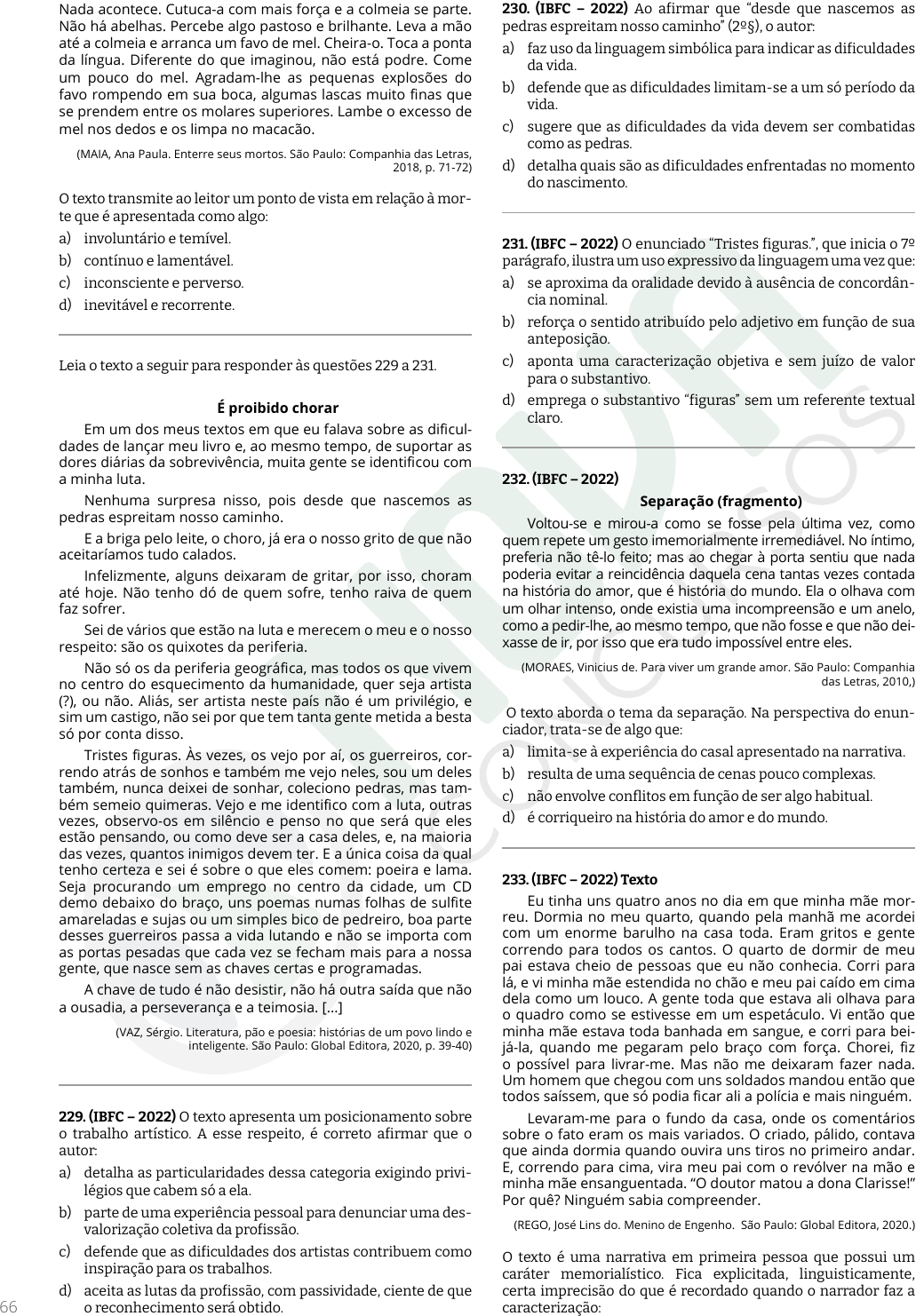 Ste ffa ny d a S ilv a A bid el - 1 64 .02 3.5 27 -2 1 66 Nada acontece. Cutuca-a com mais força e a colmeia se parte. Não há abelhas. Percebe algo pastoso e brilhante. Leva a mão até a colmeia e arranca um favo de mel. Cheira-o. Toca a ponta da língua. Diferente do que imaginou, não está podre. Come um pouco do mel. Agradam-lhe as pequenas explosões do favo rompendo em sua boca, algumas lascas muito finas que se prendem entre os molares superiores. Lambe o excesso de mel nos dedos e os limpa no macacão. (MAIA, Ana Paula. Enterre seus mortos. São Paulo: Companhia das Letras, 2018, p. 71-72) O texto transmite ao leitor um ponto de vista em relação à mor- te que é apresentada como algo: a) involuntário e temível. b) contínuo e lamentável. c) inconsciente e perverso. d) inevitável e recorrente. Leia o texto a seguir para responder às questões 229 a 231. É proibido chorar Em um dos meus textos em que eu falava sobre as dificul- dades de lançar meu livro e, ao mesmo tempo, de suportar as dores diárias da sobrevivência, muita gente se identificou com a minha luta. Nenhuma surpresa nisso, pois desde que nascemos as pedras espreitam nosso caminho. E a briga pelo leite, o choro, já era o nosso grito de que não aceitaríamos tudo calados. Infelizmente, alguns deixaram de gritar, por isso, choram até hoje. Não tenho dó de quem sofre, tenho raiva de quem faz sofrer. Sei de vários que estão na luta e merecem o meu e o nosso respeito: são os quixotes da periferia. Não só os da periferia geográfica, mas todos os que vivem no centro do esquecimento da humanidade, quer seja artista (?), ou não. Aliás, ser artista neste país não é um privilégio, e sim um castigo, não sei por que tem tanta gente metida a besta só por conta disso. Tristes figuras. Às vezes, os vejo por aí, os guerreiros, cor- rendo atrás de sonhos e também me vejo neles, sou um deles também, nunca deixei de sonhar, coleciono pedras, mas tam- bém semeio quimeras. Vejo e me identifico com a luta, outras vezes, observo-os em silêncio e penso no que será que eles estão pensando, ou como deve ser a casa deles, e, na maioria das vezes, quantos inimigos devem ter. E a única coisa da qual tenho certeza e sei é sobre o que eles comem: poeira e lama. Seja procurando um emprego no centro da cidade, um CD demo debaixo do braço, uns poemas numas folhas de sulfite amareladas e sujas ou um simples bico de pedreiro, boa parte desses guerreiros passa a vida lutando e não se importa com as portas pesadas que cada vez se fecham mais para a nossa gente, que nasce sem as chaves certas e programadas. A chave de tudo é não desistir, não há outra saída que não a ousadia, a perseverança e a teimosia. [...] (VAZ, Sérgio. Literatura, pão e poesia: histórias de um povo lindo e inteligente. São Paulo: Global Editora, 2020, p. 39-40) 229. (IBFC – 2022) O texto apresenta um posicionamento sobre o trabalho artístico. A esse respeito, é correto afirmar que o autor: a) detalha as particularidades dessa categoria exigindo privi- légios que cabem só a ela. b) parte de uma experiência pessoal para denunciar uma des- valorização coletiva da profissão. c) defende que as dificuldades dos artistas contribuem como inspiração para os trabalhos. d) aceita as lutas da profissão, com passividade, ciente de que o reconhecimento será obtido. 230. (IBFC – 2022) Ao afirmar que “desde que nascemos as pedras espreitam nosso caminho” (2º§), o autor: a) faz uso da linguagem simbólica para indicar as dificuldades da vida. b) defende que as dificuldades limitam-se a um só período da vida. c) sugere que as dificuldades da vida devem ser combatidas como as pedras. d) detalha quais são as dificuldades enfrentadas no momento do nascimento. 231. (IBFC – 2022) O enunciado “Tristes figuras.”, que inicia o 7º parágrafo, ilustra um uso expressivo da linguagem uma vez que: a) se aproxima da oralidade devido à ausência de concordân- cia nominal. b) reforça o sentido atribuído pelo adjetivo em função de sua anteposição. c) aponta uma caracterização objetiva e sem juízo de valor para o substantivo. d) emprega o substantivo “figuras” sem um referente textual claro. 232. (IBFC – 2022) Separação (fragmento) Voltou-se e mirou-a como se fosse pela última vez, como quem repete um gesto imemorialmente irremediável. No íntimo, preferia não tê-lo feito; mas ao chegar à porta sentiu que nada poderia evitar a reincidência daquela cena tantas vezes contada na história do amor, que é história do mundo. Ela o olhava com um olhar intenso, onde existia uma incompreensão e um anelo, como a pedir-lhe, ao mesmo tempo, que não fosse e que não dei- xasse de ir, por isso que era tudo impossível entre eles. (MORAES, Vinicius de. Para viver um grande amor. São Paulo: Companhia das Letras, 2010,) O texto aborda o tema da separação. Na perspectiva do enun- ciador, trata-se de algo que: a) limita-se à experiência do casal apresentado na narrativa. b) resulta de uma sequência de cenas pouco complexas. c) não envolve conflitos em função de ser algo habitual. d) é corriqueiro na história do amor e do mundo. 233. (IBFC – 2022) Texto Eu tinha uns quatro anos no dia em que minha mãe mor- reu. Dormia no meu quarto, quando pela manhã me acordei com um enorme barulho na casa toda. Eram gritos e gente correndo para todos os cantos. O quarto de dormir de meu pai estava cheio de pessoas que eu não conhecia. Corri para lá, e vi minha mãe estendida no chão e meu pai caído em cima dela como um louco. A gente toda que estava ali olhava para o quadro como se estivesse em um espetáculo. Vi então que minha mãe estava toda banhada em sangue, e corri para bei- já-la, quando me pegaram pelo braço com força. Chorei, fiz o possível para livrar-me. Mas não me deixaram fazer nada. Um homem que chegou com uns soldados mandou então que todos saíssem, que só podia ficar ali a polícia e mais ningu