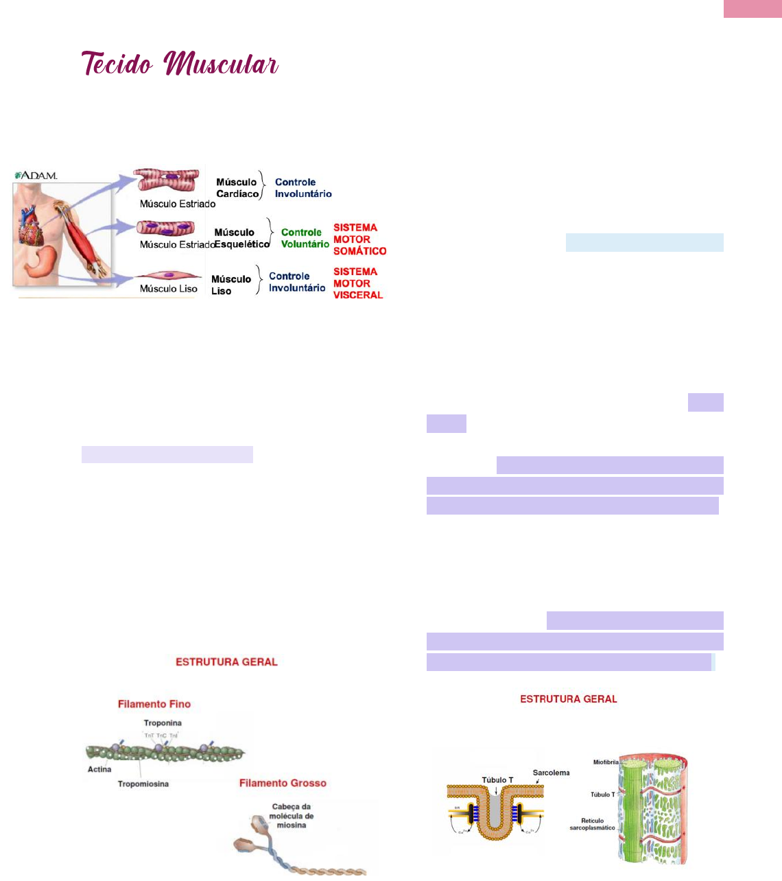 1 Fisiobiotecnologia – Resumo Prova II Estriado e liso; Cardíaco; Responsável pela contração - possível graças às propriedades contráteis das proteínas contidas no citoplasma das células musculares. Contração muscular: refere-se ao deslizamento da actina sobre a miosina nas células musculares, permitindo os movimentos do corpo. As fibras musculares contêm os filamentos de proteínas contráteis de actina e miosina, dispostas lado a lado - esses filamentos se repetem ao longo da fibra muscular, formando o sarcômero. Células: estruturas alongadas chamadas de fibras musculares (particularidades em relação a outras células). Miofibrilas: agrupamento de feixes de actina e feixes de miosina revestidos por um tecido conjuntivo que formam a fibra muscular. Sarcolema: membrana plasmática da fibra muscular. Retículo sarcoplasmático: é uma rede de túbulos e cisternas que envolve cada miofibrila (unidade contrátil da célula muscular) e libera os íons de cálcio quando o músculo é estimulado a contrair. Apresenta quantidade significativa de íons de cálcio (estoques de cálcio) responsáveis pela contração da musculatura. Funciona como um reservatório de energia para a contração muscular. (contém cálcio - liberado do RS no potencial de ação e se liga na troponina). Túbulos transversos: servem para nutrir célula com íons, glicose e outras substâncias necessárias ao funcionamento da célula. Faz com que o potencial de ação (despolarização) chegue no interior da fibra muscular, promovendo a liberação de cálcio, sendo importante pois as proteínas contráteis e Ca+ (se liga a troponina) se encontram no interior. Cálcio: é necessário para a contração muscular, está armazenado no retículo sarcoplasmático (RS), sendo liberado quando o potencial de ação chega na fibra. Sarcoplasma: citoplasma que contém as diversas organelas que compõem a célula muscular. 2 Fisiobiotecnologia – Resumo Prova II Miofilamentos: Fino (troponina, actina e tropomiosina) cálcio se liga a porção C da troponina, a tropomiosina cobre os sítios de ligação da actina com a miosina. Grosso: miosina. Junção neuromuscular - acetilcolina Filamento fino: composto pela actina, tropomiosina e troponina. Filamento grosso: miosina. Contração: deslizamento da actina sobre a miosina. Troponina: formada por três subunidades: T, C e L. Quando o cálcio é liberado pelo RS e se liga a porção C (TnC), a tropomiosina cobre os sítios de ligação da actina com a miosina. Se o cálcio se liga a troponina, a tropomiosina sai da actina permitindo a sua ligação com a miosina. PEPS – Potencial excitatório pós-sinapse: Chega no interior da fibra (túbulos T) e libera Ca e se liga à TnC e a tropomiosina libera o sítio de ligação da miosina. Miastenia graves: doença autoimune na qual a pessoa produz anticorpos contra receptores da acetilcolina: gera fraqueza, cansaço, fadiga… Platicidade celular: Hipertrofia: aumenta o volume das células -com aumento de proteínas. Atrofia: redução da massa muscular devido a lesões nos neurônios motores. Hiperplasia: aumento do n° de células num órgão ou tecido. Creatina: Produzimos no intestino, fígado e rins e conseguimos absorver em alimentos como peixe e ovos. Responsável por voltar os estoques de ATP (regeneração); Entra na fibra muscular através de proteínas transportadoras e se conjuga em fósforo (fosfocreatina). Armazenada em forma de fosfocreatina no corpo, seu fosfato inorgânico (Pi) serve como substrato para o ATP. Célula utiliza ATP na contração → vira ADP. Célula precisa de energia, portanto a creatina doa P ao ADP→ ATP. Regeneração de ATP. 3 Fisiobiotecnologia – Resumo Prova II Responsável por movimentos peristálticos; No indivíduo adulto, as células musculares lisas mantêm a capacidade de se dividir, o que permite a regeneração do músculo lesionado; Apresenta contrações lentas e involuntárias (ex: sistema digestório - trato gastrointestinal). Contrações reguladas por diferença de pH estomacal, intestinal, diferenças de temperatura ou agentes químicos; Contração muscular: Não necessita de troponina nem de tropomiosina. Precisa de Ca+, ATP e Calmodulina; Cálcio liberado pelo retículo sarcoplasmático se liga a uma proteína chamada calmodulina (CaM), que cobre os sítios de ligação para Ca+. A CaM ativa uma quinase que faz a fosforilação de uma ATPase de miosina ativa (MLCK), permitindo o deslizamento da actina com a miosina. Relaxamento: o cálcio livre no citosol diminui quando o Ca+ é bombeado de volta para o RS ou para fora da célula. Ca+ se desliga da CaM e a fosfatase da miosina retira o fosfato, diminuindo a atividade da ATPase da miosina = diminuição da tensão muscular. 4 Fisiobiotecnologia – Resumo Prova II Músculo dividido entre átrios e ventrículos Venoso - dióxido de carbono (CO2) Arterial – oxigênio (O2) A ligação entre átrio e ventrículo se da por válvulas - depende do movimento de contração ou relaxamento do coração Artéria aorta: maior artéria, com grende força e resistência para levar sangue por todo nosso corpo. Sístole - contração e bombeamento de sangue para o corpo Diástase - relaxamento muscular e enchimento de sangue Sangue: átrio esquerdo → ventrículo esquerdo (por meio de válvulas) → vai para o corpo através da artéria aorta; Entre VE e artéria aorta - válvulas semilunares Sangue volta para o átrio direito ou ventrículo direito através das veias cava - sangue com dióxido Circulação sistêmica - aorta (transporta sangue com O2 para o corpo) e circulação pulmonar; Funções: Fornecer sangue; Entrega de nutrientes e O2; Remoção de resíduos do metabolismo celular; Regulação da pressão arterial; Transporte de hormônios das glândulas endócrinas até o sítio de ação; Composição do Sistema Circulatório Coração: serve como bomba, fornecendo pressão para que o sangue flua para os tecido