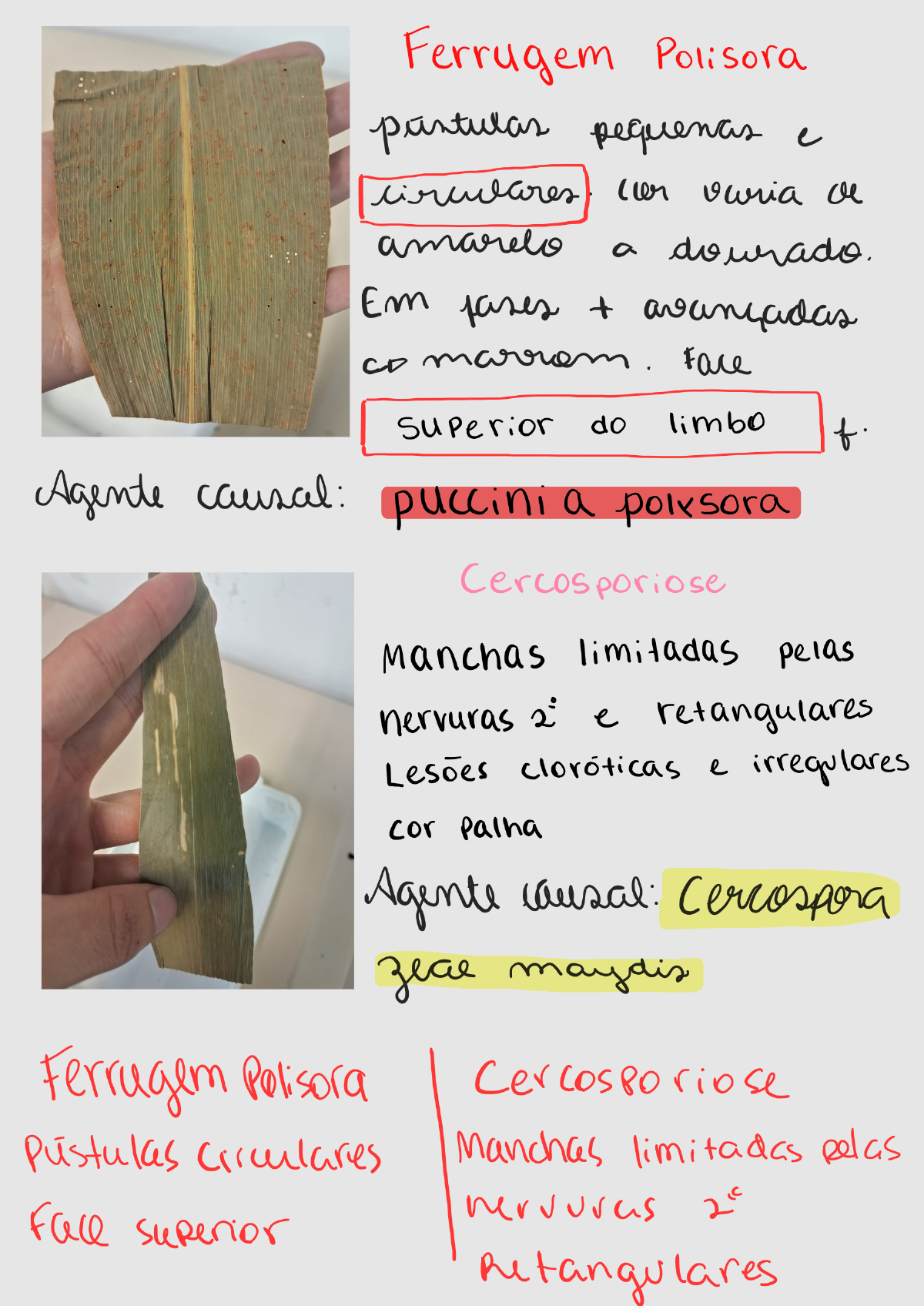 Ferrugem Polisora pequenas e amarelo a Em + CD Face superior do limbo Agente causal: puccini a polysora Cercosporiose Manchas limitadas pelas nervuras 2 e retangulares Lesoes e irregulares cor Agente causal: Cercospora maydis Polisora riose Manchas limitadas pelas superior Retangularescancro citrico Pontos (slide) w Lesoes necroticas com halo amarelado em ambas Evolvem pl pustulas marrom. Folhas, ramos. afeta qualidade polpa xanthomonas subsp. citri Pinta Folhas, ramos, Frutos. em ataque severo Não ha sintomas na lima acida Guignardia Pinta dura cl centro deprimido Mancha preta ou dura: Mancha sardenta: É sintoma mais típico da Pequenas lesões doença. Aparece logo levemente deprimidas e após a mudança de cor da avermelhadas que apare- casca. As lesões cem em frutos maduros e apresentam bordas também na pós-colheita. salientes marrom escuras também são ou negras e centro formados no centro das deprimido de cor palha lesões. com pontinhos escuros (picnídios), nos quais são formados os esporos. Mancha virulenta: Falsa melanose: Esse sintoma origina-se São pequenas manchas pelo aumento do tamanho superficiais pretas e lisas, e da fusão dos outros dispersas ou agregadas na tipos de lesões. Com casca. Este sintoma ocorre desenvolvimento, pode em frutos ainda verdes e é tomar grandes áreas da primeiro a aparecer, a superfície do fruto. partir de fevereiro no estado de São Paulo. Pode ser confundido com a melanose dos citros, que apresenta lesões mais ásperas e claras.Podridão Negra LD amareladas, em forma vertice voltado Centro da