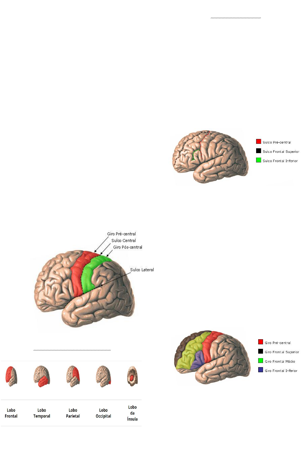 Sulcos e Giros do Telencéfalo: A superfície do cérebro apresenta depressões denominadas sulcos, que delimitam os giros ou circunvoluções cerebrais. Em qualquer hemisfério, os dois sulcos mais importantes são o sulco lateral e o sulco central. Sulco Lateral: é o sulco que separa o lobo frontal do lobo temporal Sulco Central: separa o lobo parietal do frontal. O sulco central é ladeado por dois giros paralelos, um anterior, giro pré- central, e outro posterior, giro pós-central. As áreas situadas na frente do sulco central relacionam-se com a MOTRICIDADE, enquanto as situadas atrás deste sulco relacionam-se com a SENSIBILIDADE. FACE SUPERO LATERAL LOBO FRONTAL Sulcos: Sulco Pré-central: mais ou menos paralelo ao sulco central Sulco Frontal Superior: inicia-se na porção superior do sulco pré-central e dirigi-se anteriormente no lobo frontal. É perpendicular a ele. Sulco Frontal Inferior: partindo da porção inferior do sulco pré-central, dirige-se para frente e para baixo. Giros: Giro Pré-central: localiza-se entre o sulco central e o sulco pré-central. Neste giro se localiza a área motora principal do cérebro (córtex motor). Giro Frontal Superior: localiza-se acima do sulco frontal superior. Giro Frontal Médio: localiza-se entre o sulco frontal superior e inferior. Giro Frontal Inferior: localiza-se abaixo do sulco frontal inferior. O giro frontal inferior do hemisfério esquerdo é o centro cortical da palavra falada LOBO TEMPORAL Sulcos: Sulco Temporal Superior: inicia-se próximo ao pólo temporal e dirige-se para trás paralelamente ao ramo posterior do sulco lateral, terminando no lobo parietal. Sulco Temporal Inferior: paralelo ao sulco temporal superior é geralmente formado por duas ou mais partes descontinuas. Giros: Giro Temporal Superior: localiza-se entre o sulco lateral e o sulco temporal superior. Giro Temporal Médio: localiza-se entre os sulcos temporal superior e o temporal inferior. Giro Temporal Inferior: localiza-se abaixo do sulco temporal inferior e se limita com o sulco occípito-temporal. Afastando-se os lábios do sulco lateral, aparece o seu assoalho, que é parte do giro temporal superior. LOBO PARIETAL Sulcos: Sulco Pós-central: localiza-se posteriormente ao giro pós-central. É paralelo ao sulco central. Sulco Intraparietal: geralmente localiza- se perpendicular ao sulco pós-central (com o qual pode estar unido) e estende-se para trás para terminar no lobo occipital. Diferentemente dos outros lobos, o lobo parietal apresenta um giro e dois lóbulos: Giro Pós-central: localiza-se entre o sulco central e o sulco pós-central. É no giro pós-central que se localiza uma das mais importantes áreas sensitivas do córtex, a área somestésica. Lóbulo Parietal Superior: localiza-se superiormente ao sulco intra-parietal. Lóbulo Parietal Inferior: localiza-se inferiormente ao sulco intraparietal. LOBO OCCIPITAL O lobo occipital ocupa uma porção relativamente pequena da face súpero- lateral do cérebro, onde apresenta pequenos sulcos e giros irregulares e inconstantes. Os principais sulcos e giros desse lobo são visualizados na face medial do cérebro. LOBO DA ÍNSULA O lobo da ínsula é visualizado afastando-se os lábios do sulco lateral. A ínsula tem forma cônica e seu ápice, voltado para baixo e para frente, é denominado de límen da ínsula. Sulco Central da Ínsula: parte do sulco circular, na porção superior da ínsula, e dirige-se no sentido antero-inferior. Divide a ínsula em duas partes: giros longos e giros curtos. Sulco Circular da Ínsula: circunda a ínsula na sua borda superior. Giros: Giros Longos da Ínsula: estão localizados posteriormente ao sulco central da ínsula. Giros Curtos da Ínsula: estão localizados anteriormente ao sulco central da ínsula RESUMO SULCOS E GIROS VISTA LATERAL RESUMO LOBO DA ÍNSLULA VISTA MEDIAL Corpo Caloso: é a maior das comissuras inter-hemisféricas, unindo áreas simétricas do córtex de cada hemisfério. Fórnix: emergindo abaixo do esplênio do corpo caloso e arqueando-se em direção à comissura anterior, está o fórnix, feixe complexo de fibras septo pelúcido separa os dois ventrículos laterais LOBO FRONTAL E PARIETAL Na parte medial do cérebro, existem dois sulcos que passam do lobo frontal para o lobo parietal: Sulco do Corpo Caloso: começa abaixo do rostro do corpo caloso, contorna o tronco e o esplênio do corpo caloso, onde se continua já no lobo temporal, com o sulco do hipocampo. Sulco do Cíngulo: tem seu curso paralelo ao sulco do corpo caloso, do qual é separado pelo giro do cíngulo. Termina posteriormente em dois sulcos: ramo marginal do giro do cíngulo, porção final do sulco do giro do cíngulo que cruza a margem superior do hemisfério, e o sulco subparietal, que continua posteriormente em direção ao sulco parieto-ocipital. Sulco Paracentral: Destaca-se do sulco do cíngulo em direção á margem superior do hemisfério, que delimita, com o sulco do cíngulo e o sulco marginal, o lóbulo paracentral. Giro do Cíngulo: contorna o corpo caloso, ligando-se ao giro para-hipocampal pelo istmo do giro do cíngulo. É percorrido por um feixe de fibras, o fascículo do cíngulo. Lóbulo Paracentral: localiza-se entre o sulco marginal e o sulco paracentral. Na parte anterior e posterior deste lóbulo localizam-se as áreas motoras e sensitivas relacionadas com a perna e o pé. Cúneos: localiza-se entre o sulco parieto- occipital e o sulco calcarino. É um giro complexo de forma triangular. Adiante do cúneos, no lobo parietal, temos o pré- cúneos. Giro Occipito-temporal Medial: localiza-se abaixo do sulco calcarino. Esse giro continua anteriormente com o giro para- hipocampal, do lobo temporal. FACE INFERIOR Lobo Temporal Lobo Frontal LOBO TEMPORAL Sulco Occipito-temporal: localiza-se entre os giros occipito-temporal lateral e occipito-temporal medial. Sulco Colateral: inicia-se próximo ao pólo occipital e se dirige para frente. O sulco colater