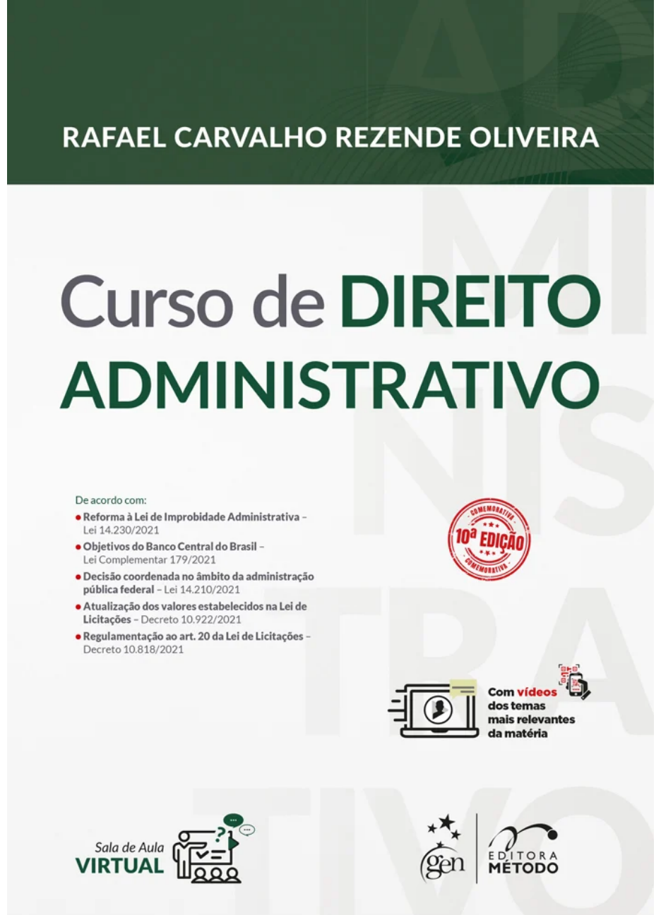 ■ ■ ■ ■ ■ ■ ■ ■ O autor deste livro e a editora empenharam seus melhores esforços para assegurar que as informações e os procedimentos apresentados no texto estejam em acordo com os padrões aceitos à época da publicação, e todos os dados foram atualizados pelo autor até a data de fechamento do livro. Entretanto, tendo em conta a evolução das ciências, as atualizações legislativas, as mudanças regulamentares governamentais e o constante fluxo de novas informações sobre os temas que constam do livro, recomendamos enfaticamente que os leitores consultem sempre outras fontes fidedignas, de modo a se certificarem de que as informações contidas no texto estão corretas e de que não houve alterações nas recomendações ou na legislação regulamentadora. Fechamento desta edição: 19.01.2022 O Autor e a editora se empenharam para citar adequadamente e dar o devido crédito a todos os detentores de direitos autorais de qualquer material utilizado neste livro, dispondo-se a possíveis acertos posteriores caso, inadvertida e involuntariamente, a identificação de algum deles tenha sido omitida. Atendimento ao cliente: (11) 5080-0751 | faleconosco@grupogen.com.br Direitos exclusivos para a língua portuguesa Copyright © 2022 by Editora Forense Ltda. Uma editora integrante do GEN | Grupo Editorial Nacional Travessa do Ouvidor, 11 – Térreo e 6º andar Rio de Janeiro – RJ – 20040-040 www.grupogen.com.br Reservados todos os direitos. É proibida a duplicação ou reprodução deste volume, no todo ou em parte, em quaisquer formas ou por quaisquer meios (eletrônico, mecânico, gravação, fotocópia, distribuição pela Internet ou outros), sem permissão, por escrito, da Editora Forense Ltda. Capa: Aurélio Corrêa CIP – BRASIL. CATALOGAÇÃO NA FONTE. SINDICATO NACIONAL DOS EDITORES DE LIVROS, RJ. O51c 10. ed. Oliveira, Rafael Carvalho Rezende mailto:faleconosco@grupogen.com.br http://www.grupogen.com.br/ Curso de direito administrativo / Rafael Carvalho Rezende Oliveira. – 10. ed., rev., atual. e reform. – Rio de Janeiro: Método, 2022. 1080 p.; 24 cm. Inclui bibliografia e índice ISBN 978-65-5964-383-7 1. Direito administrativo – Brasil. I. Título. 21-75195 CDU: 342.9(81) Camila Donis Hartmann – Bibliotecária – CRB-7/6472 Para meus pais, Celso Rezende Oliveira e Cleonice Carvalho Rezende Oliveira, meus ídolos. Para minha mulher, Alessandra Bordeaux, minha alma gêmea. Para meus filhos, Lucca Bordeaux Oliveira e Isabela Bordeaux Oliveira, razões da minha felicidade plena. Para minha irmã, Renata Oliveira, e minha sobrinha, Karina Oliveira, meus amores. “Ela está no horizonte (...). Me aproximo dois passos, ela se afasta dois passos. Caminho dez passos e o horizonte corre dez passos. Por mais que eu caminhe, jamais a alcançarei. Para que serve a utopia? Serve para isso: para caminhar.” (Eduardo Galeano) “Se as coisas são intangíveis... ora! Não é motivo para não querê-las... Que tristes os caminhos, se não fora A mágica presença das estrelas.” (Mario Quintana) Pós-doutor pela Fordham University School of Law (Nova York). Doutor em Direito pela UVA/RJ. Mestre em Teoria do Estado e Direito Constitucional pela PUC/RJ. Especialista em Direito do Estado pela UERJ. Professor titular de Direito Administrativo do IBMEC. Professor do programa de pós-graduação stricto sensu em Direito do PPGD/UVA. Professor do Mestrado Acadêmico em Direito da Universidade Candido Mendes. Professor de Direito Administrativo da EMERJ. Professor dos cursos de pós-graduação da FGV e da Universidade Candido Mendes. Membro do Instituto de Direito Administrativo do Estado do Rio de Janeiro – IDAERJ. Presidente do Conselho editorial interno da Revista Brasileira de Alternative Dispute Resolution – RBADR. Procurador do Município do Rio de Janeiro. Ex-Defensor Público federal. Advogado, árbitro e consultor jurídico. Sócio-fundador do escritório Rafael Oliveira Advogados Associados. Site: www.professorrafaeloliveira.com.br Site: www.roaa.adv.br Facebook: @ProfessorRafaelOliveira Twitter: @RafaelDirAdm http://www.professorrafaeloliveira.com.br/ http://www.roaa.adv.br/ https://www.facebook.com/ProfessorRafaelOliveira/ https://twitter.com/rafaeldiradm YouTube: @professorrafaeloliveira GENJURIDICO.com.br/rafaeloliveira/ http://www.youtube.com/professorrafaeloliveira http://genjuridico.com.br/rafaeloliveira/ a) b) c) d) A 10.ª edição do Curso de Direito Administrativo representa o amadurecimento da obra e a sua consolidação no cenário jurídico. Trata-se de conquista que decorre não apenas do esforço diuturno na atualização do livro, mas, especialmente, do carinho dos leitores. O maior desafio na atualização desta edição foi a incorporação das profundas modificações da Lei 8.429/1992 (Lei de Improbidade Administrativa – LIA), implementadas pela Lei 14.230/2021. Em síntese, a 10.ª edição do Curso de Direito Administrativo apresenta as seguintes novidades: inserção de novos tópicos; atualização doutrinária e jurisprudencial, com menção às recentes decisões proferidas pelo STF e STJ; referências às principais decisões do TCU e Orientações Normativas da AGU; atualização legislativa, com destaque para os seguintes diplomas normativos: d.1) Lei Complementar 179/2021: define os objetivos do Banco Central do Brasil e dispõe sobre sua autonomia e sobre a nomeação e a exoneração de seu Presidente e de seus Diretores; d.2) Lei 14.230/2021: altera a Lei 8.429/1992 (Lei de Improbidade Administrativa – LIA); d.3) Lei 14.227/2021: altera a Lei 11.079/2004 (PPP) e dá outras providências; d.4) Lei 14.210/2021: acrescenta o Capítulo XI-A à Lei 9.784/1999 para dispor sobre a decisão coordenada no âmbito da Administração Pública federal; d.5) Decreto 10.947/2022: regulamenta o inciso VII do art. 12 da Lei 14.133/2021 (nova Lei de Licitações), para dispor sobre o plano de contratações anual e instituir 