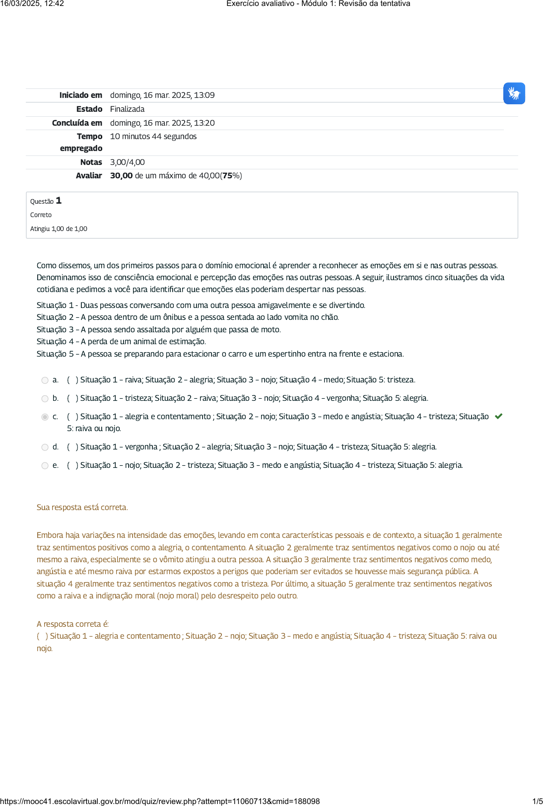 Iniciado em domingo, 16 mar. 2025, 13:09 Estado Finalizada Concluída em domingo, 16 mar. 2025, 13:20 Tempo empregado 10 minutos 44 segundos Notas 3,00/4,00 Avaliar 30,00 de um máximo de 40,00(75%) Questão 1 Correto Atingiu 1,00 de 1,00 Como dissemos, um dos primeiros passos para o domínio emocional é aprender a reconhecer as emoções em si e nas outras pessoas. Denominamos isso de consciência emocional e percepção das emoções nas outras pessoas. A seguir, ilustramos cinco situações da vida cotidiana e pedimos a você para identificar que emoções elas poderiam despertar nas pessoas. Situação 1 - Duas pessoas conversando com uma outra pessoa amigavelmente e se divertindo. Situação 2 – A pessoa dentro de um ônibus e a pessoa sentada ao lado vomita no chão. Situação 3 – A pessoa sendo assaltada por alguém que passa de moto. Situação 4 – A perda de um animal de estimação. Situação 5 – A pessoa se preparando para estacionar o carro e um espertinho entra na frente e estaciona. a. ( ) Situação 1 – raiva; Situação 2 – alegria; Situação 3 – nojo; Situação 4 – medo; Situação 5: tristeza. b. ( ) Situação 1 – tristeza; Situação 2 – raiva; Situação 3 – nojo; Situação 4 – vergonha; Situação 5: alegria. c. ( ) Situação 1 – alegria e contentamento ; Situação 2 – nojo; Situação 3 – medo e angústia; Situação 4 – tristeza; Situação 5: raiva ou nojo. d. ( ) Situação 1 – vergonha ; Situação 2 – alegria; Situação 3 – nojo; Situação 4 – tristeza; Situação 5: alegria. e. ( ) Situação 1 – nojo; Situação 2 – tristeza; Situação 3 – medo e angústia; Situação 4 – tristeza; Situação 5: alegria. Sua resposta está correta. Embora haja variações na intensidade das emoções, levando em conta características pessoais e de contexto, a situação 1 geralmente traz sentimentos positivos como a alegria, o contentamento. A situação 2 geralmente traz sentimentos negativos como o nojo ou até mesmo a raiva, especialmente se o vômito atingiu a outra pessoa. A situação 3 geralmente traz sentimentos negativos como medo, angústia e até mesmo raiva por estarmos expostos a perigos que poderiam ser evitados se houvesse mais segurança pública. A situação 4 geralmente traz sentimentos negativos como a tristeza. Por último, a situação 5 geralmente traz sentimentos negativos como a raiva e a indignação moral (nojo moral) pelo desrespeito pelo outro. A resposta correta é: ( ) Situação 1 – alegria e contentamento ; Situação 2 – nojo; Situação 3 – medo e angústia; Situação 4 – tristeza; Situação 5: raiva ou nojo. 16/03/2025, 12:42 Exercício avaliativo - Módulo 1: Revisão da tentativa https://mooc41.escolavirtual.gov.br/mod/quiz/review.php?attempt=11060713&cmid=188098 1/5 Questão 2 Correto Atingiu 1,00 de 1,00 Leia a situação hipotética a seguir em que se apresenta um contexto seguido de opções de reações emocionais. Assinale qual das opções teria mais chances de um desfecho positivo, considerando o que dissemos sobre a flexibilidade do uso de estratégias para lidar com situações desafiadoras, evitando o acirramento de conflitos. Durante uma apresentação de trabalho em sala de aula, um colega constrange você ao apontar um grande erro em seu trabalho que deveria ter visto. Então, você: a. Responde agressivamente ao colega dizendo que ele não tem autoridade para fazer críticas ao seu trabalho. b. Leva o fato na brincadeira fazendo os seus colegas rirem, fingindo não ter dado importância, ainda que o erro fosse de fato grave. c. Tenta mudar de assunto, como se nada tivesse acontecido e você não estivesse abalado emocionalmente. d. Inventa uma desculpa rápida para sair da sala, fugindo da situação que te abalou emocionalmente. e. Aceita as críticas, embora reconheça que poderia ser feita de maneira diferente, e pensa que pode aprender com elas, avaliando que a outra pessoa no fundo acabou te ajudando a corrigir o problema. Sua resposta está correta. a. Se escolheu essa resposta, é provável que o desfecho seja negativo. Ao agir assim poderá acirrar a animosidade entre vocês em uma situação pública. Vai ser difícil reverter essa situação. ERRADO b. Se escolheu essa resposta, é provável que o desfecho seja negativo. Ignorar ou tentar ridicularizar a pessoa que fez a crítica, pode fazê-la reagir emocionalmente de maneira desfavorável, acirrando o conflito entre vocês. ERRADO c. Se escolheu essa resposta, é provável que o desfecho seja negativo, pois fingir ou suprimir uma reação emocional tem um alto custo emocional com efeitos negativos para o seu bem-estar o que repercutirá no acirramento do conflito entre vocês, pois irá culpar a outra pessoa pelo seu mal-estar. ERRADO d. Se escolheu essa resposta, é provável que o desfecho seja negativo, pois fugir da situação pode dar a impressão aos demais que não consegue ser assertivo quando confrontado, mostrando-se frágil emocionalmente, o que pode ter um custo emocional para você e potencialmente motivar conflitos futuros por culpar o outro pelo seu mal estar. ERRADO e. Se escolheu essa resposta, é muito provável que o desfecho seja positivo. Você está usando uma estratégia de regulação emocional denominada de mudança cognitiva, ou seja, está agindo de maneira flexível na situação, compreendendo que as pessoas podem ser infelizes no modo como fazem suas críticas, mas que isso pode ser uma ótima oportunidade de corrigir o erro e aprender com a situação. CERTO A resposta correta é: Aceita as críticas, embora reconheça que poderia ser feita de maneira diferente, e pensa que pode aprender com elas, avaliando que a outra pessoa no fundo acabou te ajudando a corrigir o problema. 16/03/2025, 12:42 Exercício avaliativo - Módulo 1: Revisão da tentativa https://mooc41.escolavirtual.gov.br/mod/quiz/review.php?attempt=11060713&cmid=188098 2/5 Questão 3 Correto Atingi