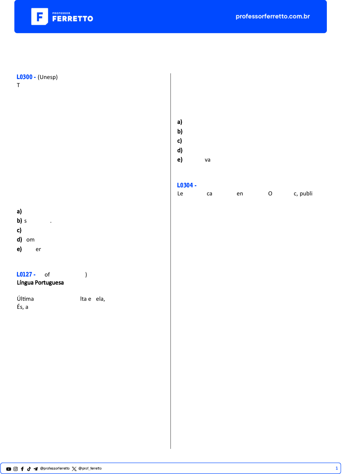 Realismo L0300 - (Unesp) Tal movimento deriva quase todos os seus critérios de probabilidade do empirismo das ciências naturais. Baseia seu conceito de verdade psicológica no princípio de causalidade, o desenvolvimento apropriado da trama na eliminação do acaso e dos milagres, sua descrição do ambiente na ideia de que todo e qualquer fenômeno natural tem lugar numa interminável cadeia de condições e mo�vos, sua u�lização de detalhes caracterís�cos no método de observação cien�fica – que não despreza circunstância alguma, por mais insignificante e trivial que seja. (Arnold Hauser. História social da arte e da literatura, 1994. Adaptado.) O texto refere-se ao movimento a) árcade. b) simbolista. c) realista. d) român�co. e) modernista. L0127 - (Professor Ferre�o) Língua Portuguesa Úl�ma flor do Lácio, inculta e bela, És, a um tempo, esplendor e sepultura: Ouro na�vo, que na ganga impura A bruta mina entre os cascalhos vela… Amo-te assim, desconhecida e obscura, Tuba de alto clangor, lira singela, Que tens o trom e o silvo da procela E o arrolo da saudade e da ternura! Amo o teu viço agreste e o teu aroma De virgens selvas e de oceano largo! Amo-te, ó rude e doloroso idioma, Em que da voz materna ouvi: "meu filho!" E em que Camões chorou, no exílio amargo, O gênio sem ventura e o amor sem brilho! (Olavo Bilac) O poeta Olavo Bilac foi um dos maiores representantes da poesia parnasiana. O texto acima representa uma forma fixa muito u�lizada pelos escritores parnasianos, que é: a) uma ode b) uma elegia c) um haicai d) um soneto e) uma trova L0304 - (Unesp) Leia a crônica “Almas penadas”, de Olavo Bilac, publicada originalmente em 1902. Outro fantasma?... é verdade: outro fantasma. Já tardava. O Rio de Janeiro não pode passar muito tempo sem o seu lobisomem. Parece que tudo aqui concorre para nos impelir ao amor do sobrenatural [...]. Agora, já se não adormecem as crianças com histórias de fadas e de almas do outro mundo. Mas, ainda há menos de cinquenta anos, este era um povo de beatos [...]. [...] Os tempos melhoraram, mas guardam ainda um pouco dessa primi�va credulidade. Inventar um fantasma é ainda um magnífico recurso para quem quer levar a bom termo qualquer grossa pa�faria. As almas simples vão propagando o terror, e, sob a capa e a salvaguarda desse temor, os pa�fes vão rejubilando. O novo espectro que nos aparece é o de Catumbi. Começou a surgir vagamente, sem espalhafato, pelo pacato bairro – como um fantasma de grande e louvável modés�a. E tão esba�do1 passava o seu vulto na treva, tão su�lmente deslizava ao longo das casas adormecidas – que as primeiras pessoas que o viram não puderam em consciência dizer se era duende macho ou duende fêmea. [...] O fantasma não falava – naturalmente por saber de longa data que pela boca é que morrem os peixes e os fantasmas... Também, ninguém lhe falava – não por experiência, mas por medo. Porque, enfim, pode um homem ter nascido num século de luzes e de descrenças, e ter mamado o leite do liberalismo nos estafados seios da Revolução Francesa, e não acreditar nem em Deus nem no Diabo – e, apesar disso, sen�r a 1@professorferretto @prof_ferretto voz presa na garganta, quando encontra na rua, a desoras2, uma avantesma3... Assim, um profundo mistério cercava a existência do lobisomem de Catumbi – quando começaram de aparecer ves�gios assinalados de sua passagem, não já pelas ruas, mas pelo interior das casas. Não vades agora crer que se tenham sumido, por exemplo, as hós�as consagradas da igreja de Catumbi, ou que os empregados do cemitério de S. Francisco de Paula tenham achado alguma sepultura vazia, ou que algum circunspecto pai de família, certa manhã, ao despertar, tenha dado pela falta... da própria alma. Nada disso. Os fenômenos eram outros. Desta casa sumiram-se as arandelas, daquela outra as galinhas, daquela outra as joias... E a polícia, finalmente, adquiriu a convicção de que o lobisomem, para perpétua e suprema vergonha de toda a sua classe, andava acumulando novos pecados sobre os pecados an�gos, e dando-se à prá�ca de excessos menos merecedores de exorcismos que de cadeia. Dizem as folhas4 que a polícia, competentemente munida de ben�nhos5 e de revólveres, de amuletos e de sabres, assaltou anteontem o reduto do fantasma. Um jornal, dando conta da diligência, disse que o delegado achou dentro da casa sinistra – um velho pardieiro6 que fica no topo de uma ladeira íngreme – alguns objetos singulares que pareciam instrumentos “pertencentes a gatunos”. E acrescentou: “alguns morcegos esvoaçavam espavoridos, tentando apagar as velas acesas que os si�antes7 empunhavam”. Esta nota de morcegos deve ser um chique român�co do no�ciarista. No fundo da alma de todo o repórter há sempre um poeta... Vamos lá! nestes tempos, que correm, já nem há morcegos. Esses feios quirópteros, esses medonhos ratos alados, companheiros clássicos do terror noturno, já não aparecem pelo bairro civilizado de Catumbi. Os animais, que esvoaçavam espavoridos, eram sem dúvida os frangões roubados aos quintais das casas... Ai dos fantasmas! e mal dos lobisomens! o seu tempo passou. (Olavo Bilac. Melhores crônicas, 2005.) 1esba�do: de tom pálido. 2a desoras: muito tarde. 3avantesma: alma do outro mundo, fantasma, espectro. 4folha: periódico diário, jornal. 5ben�nho: objeto de devoção contendo orações escritas. 6pardieiro: prédio velho ou arruinado. 7si�ante: policial. Cons�tui exemplo de interação do cronista com o leitor o trecho a) “o lobisomem, para perpétua e suprema vergonha de toda a sua classe, andava acumulando novos pecados sobre os pecados an�gos” (3º parágrafo). b) “As almas simples vão propagando o terror, e, sob a capa e a salvaguarda desse temor, os pa�fes vão rejubilando” (1º parágrafo). c) “Não vades agora crer que se tenham sumido, por exe