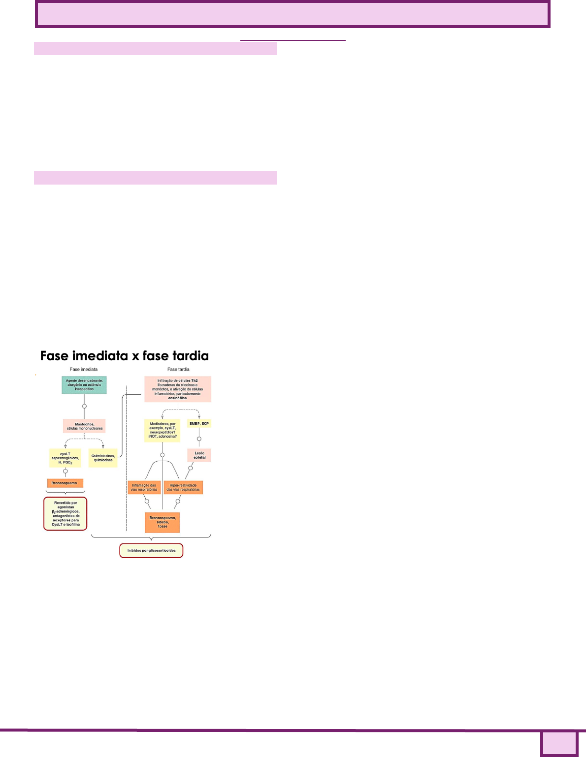 Caso 3 – Farmacologia Jennifer Seljenes Suprema Medicina ASMA 1 Doenças respiratórias ❑ O Brasil é um dos países com maiores taxas de prevalência de asma e rinite alérgica, principalmente em crianças. ❑ Diversos fatores podem influenciar na incidência dessas doenças: genética, tabagismo, o ambiente, a exposição à poluição atmosférica e às variações climáticas. Cigarro e poeira são substâncias que vão desencadear resposta alérgica e podem levar a broncoconstrição. ASMA - Doença heterogênea, caracterizada por broncoconstrição, inflamação das vias aéreas e hiper-responsividade brônquica; - Sintomas: sibilos, dispneia, opressão torácica retroesternal, tosse e limitação variável do fluxo aéreo; - Patogênese: Fase imediata (broncoespasmo) e fase tardia (inflamação crônica); - Imunologia: Ativação de mastócitos, eosinófilos infiltrados, linfócitos T auxiliares 2 (Th2) Em uma fase mais imediata tratamos o broncoespasmo, e em uma fase mais tardia a gente trata essa inflamação crônica decorrente da liberação de mediadores. Do ponto de vista imunológico, a asma normalmente é acompanhada desse processo inflamatório crônico, ela é acompanhada da ativação de mastócitos, vai ocorrer sua degranulação, vai liberar histamina, várias substâncias vasodilatadoras e broncococntritoras. Muitas vezes esse processo inflamatório vai estar acompanhado do aumento da migração de eosinófilos e células mononucleares (macrófagos, células T), principalmente as células TH2. Todas as células, principalmente os mastócitos e eosinófilos, são as principais células responsáveis pela liberacao destes mediadores. Fase mais precoce, vai desencadear broncoconstrição. principais responsáveis pela liberação dos mediadores que fazem mais precoce e essa nova construção. Então basicamente a gente tem que entender que a asma tem essa fase imediata, que a gente tem vários estímulos desencadeadores, que podem ser pó, alérgico, fumaça de cigarro e poluição, vai gerar um estímulo muitas vezes este estímulo vai ser captado com células das apresentadoras de antígenos. Essas células vão levar o alérgeno até os órgãos linfoides. Nos órgãos linfoides vão ter a ativação de uma resposta TH2, esses linfócitos vão ativar mastócitos e células B (plasmócitos). Os plasmócitos que são células B ativadas vão secretar maiores níveis de IgE (principal imunoglobulina alérgica) e também os o IgE vão se ligar aos mastócitos e fazer a degranulação dos mediares presentes nos mastócitos. Os principais mediadores que os mastócitos secretam o sistema leucotrienos C, D e E e algumas moléculas vasodilatadoras, que são moléculas que vao iniciar o processo de broncoconstrição. Os mastócitos liberam substâncias quimiotáticas. Vão recrutar mais células para aquele ambiente inflamatório. FASE IMEDIATA -> TRATA BRONCOESPASMO -> salbulatmol (aerolin) FASE TARDIA -> INFLAMACAO CRONICA -> glicocorticoides ------------------------------------------------------------------------------- è Tratamento farmacológico da Asma - Agonistas β2-adrenérgicos (simpaticomiméticos;) -> melhor escolha para crise (salbutamol e femoterol - Glicocorticóides inalatórios ou sistêmicos; - Teofilina (metilxantina); estimulantes do SNC efeito broncodilatador - Agentes anticolinérgicos (antagonistas dos receptores muscarínicos); - Cromoglicato dissódico; - Antagonistas dos receptores do leucotrienos e inibidores de 5- lipo-oxigenase; broncodilatadores - Imunomoduladores (Omalizumabe; Mepolizumabe). -> asma mais grave Os principais da asma são os agonistas β2-adrenérgicos que são o salbutamol, femoterol, juntamente com os glicocorticoides. ------------------------------------------------------------------------------- RESUMO: Agonista B2 utilizado para asma adulta. Glicocorticoide associa a melhor resposta principalmente diminuindo essa informação sistêmica na fase mais aguda. Caso 3 – Farmacologia Jennifer Seljenes Suprema Medicina ASMA 2 Agonistas β2 - adrenérgicos Fármacos: ❑ Curta duração: Salbutamol, terbutalina, fenoterol-> tratamento da asma aguda grave; 3 a 4 horas de duração. Crises asmáticas imediatas. Usando até 6xdia. Fenoterol pode causar arritimia porque ele ativa B1. ❑ Longa duração: Formoterol, Salmeterol, -> tratamento da asma e DPOC; 12 horas de duração. Asma persistente. Utilizados principalmente na DPOC, frequência de administração menor. ❑ Ultralonga duração: indacaterol, olodaterol, vilanterol; 24 horas de duração. Quase não é usado no Brasil - Reações adversas: taquicardia, arritmias e dessensibilização. - Agonistas B2 adrenergicos que são seletivos (o propranolol) pode causar asma. Caso persistência, mais do que 2x por semana, já não é aconselhado usar B2 adrenérgico de forma contínua, associar de curta com longa duração. ------------------------------------------------------------------------------- è Mecanismo de ação: Agonista B2 tem uma subunidade Gs quando ativa vai estimular a adenililciclase, gerando a formação de AMPc, a partir da quebra do ATP. O AMPc aumenta PKA que ira promover a redução da concentração de cálcio intracelular na musculatura lisa vascular, e consequentemente, vasodilatação. ------------------------------------------------------------------------------- è Uso clínico do B2-adrenergico ❑ Reversão da obstrução das vias aéreas em episódios agudos (salbutamol e terbutalina); fármaco de escolha em caso de broncospasmo asmático agudo. Uso clínico principalmente em episódios de agudos na emergência. Uso inalatório como fármaco de escolha em casos agudos. ❑ Profilaxia do broncoespasmo (Noturno ou após exercício físico) – terapia de longo prazo (salmeterol e formoterol); início mais lento, potencializa o efeito dos corticosteroides; Terapia de longo prazo, para um controle melhor, quando se tem mais de 2 vezes na semana va