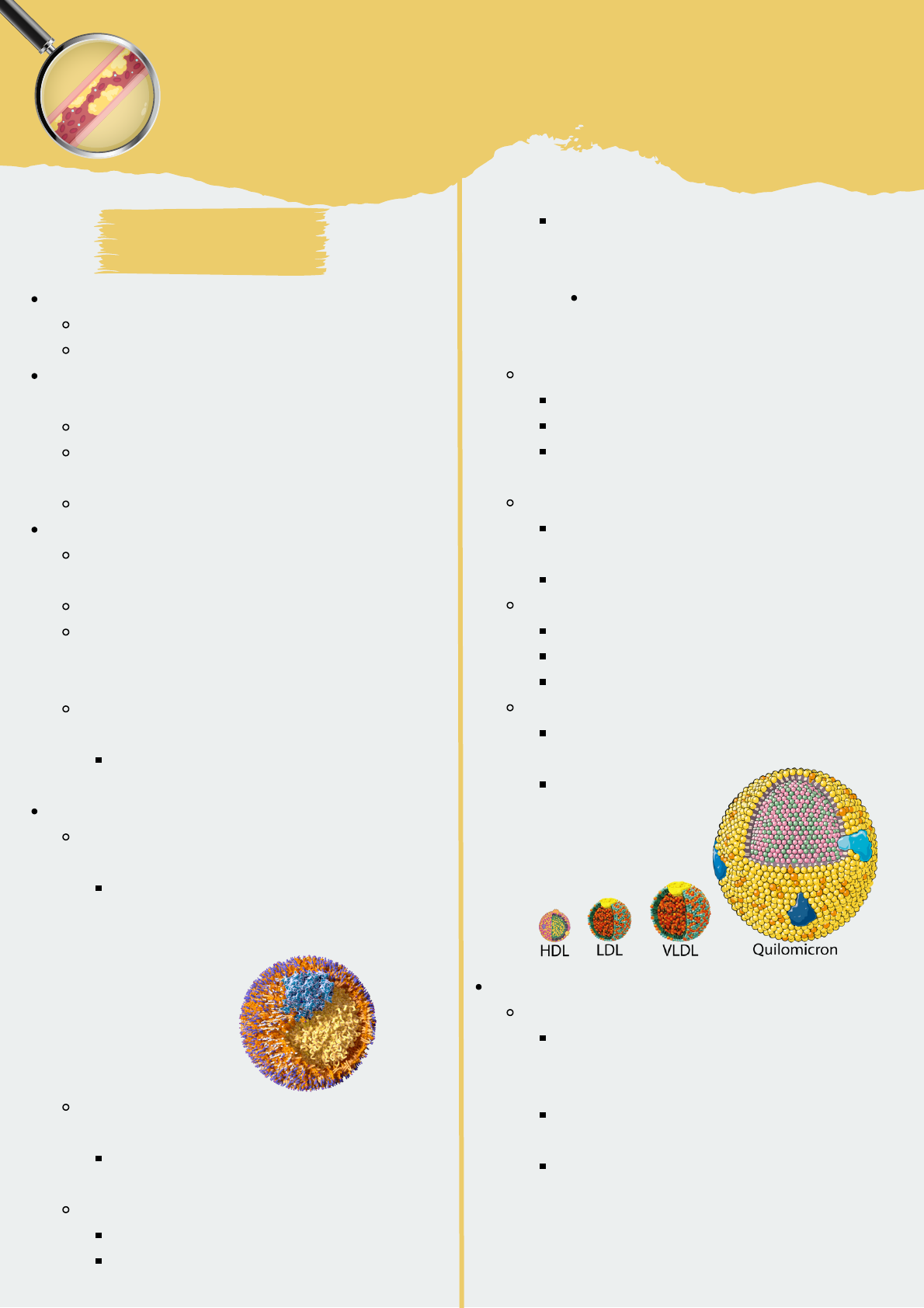 Dislipidemia @laura.medstudies Os lipídios tem duas origens: Dieta – Exógenos Síntese celular – Endógenos Representados pelo colesterol, triglicerídeos, Colesterol - Vitamina D e hormônios; Triglicerídeos (TG) - Fonte de energia celular; Fosfolipídeos - Membrana plasmática; Apolipoproteínas (apo): As apolipoproteínas são proteínas carreadoras de lipídeos; Compõe as lipoproteínas; São carreadoras e possuem efeitos sobre reações enzimáticas (apo C2 e C3) e interação com receptores (B100 e E); A apo (a) é considerada um fator de risco para aterosclerose; A apo (a) é uma modificação da apo B100, presente no HDL; Lipoproteínas (Lp): Proteínas (hidrofílica - superfície) + lipídeos (hidrofóbico + centro); Os lipídeos são hidrofóbicos, necessitando de um componente hidrofílico para circular na corrente sanguínea; fosfolipídeos e ácidos graxos; Metabolismo Lipídico Seus tipos mudam de acordo com a densidade: Lp com muita gordura e poucas proteínas possui baixa densidade; Quilomícron (QM): Maior tamanho; Rica em TG; Não possui relação com a aterosclerose pois é grande demais para atravessar o espaço subendotelial; Porém seus remanescentes são menores, podendo estar relacionado com o processo aterosclerótico; VLDL - Lp de muito baixa densidade: Menor que o QM; Rica em TG; Transporta TG do fígado para a circulação periférica; IDL - Lp de média densidade: É o resultado da remoção de alguns TG do VLDL; Possui TG e colesterol; LDL - Lp de baixa densidade: Resultado da saída dos TG do IDL; Principal apo - Apo B100 Rica em colesterol; HDL -Lp de alta densidade: Retira colesterol dos tecidos periféricos e leva para o fígado; Apo A1 e A2; Transporte dos lipídeos: Intestino - Via exógena: Os lipídeos da dieta sofrem ação das lipases e formam micelas para entrar nos enterócitos; Após absorção, eles seguem pela linfa, na forma de QM; Nos tecidos periféricos a Lipase lipoproteica (LPL) quebra os TG, liberando ácidos graxos para os tecidos usarem como fonte de energia; O QM sem TG é retirado da circulação pelo fígado; Os remanescentes estão associados à aterosclerose pois o seu tamanho vai diminuindo a medida que perde TG; Fígado - Via endógena: O fígado produz VLDL, rico em TG; A lipase lipoproteica quebra os TG do VLDL, transformando ele em IDL; O mesmo acontece com o IDL, que vira LDL; A maior parte do LDL é retirado da circulação pelo fígado, mas alguns permanecem, predispondo à aterosclerose; Principais moléculas aterogênicas: IDL e LDL; A remoção de colesterol dos tecidos periféricos é feita pelo HDL; Esse processo é necessário, pois lipídeos em excesso causa lesão tecidual; Para ser incorporado no HDL, o colesterol deve estar em forma de éster de colesterol; Enzima responsável por esta conversão: LCAT (lecitina- colesterol-aciltransferase); Quando o HDL está cheio do colesterol, ele é retirado da circulação pelo fígado; Classificação Dislipidemias primárias: Condições genéticas raras; Possui causas poligênicas e monogênicas; Hipercolesterolemia isolada: Possui depósitos cutâneos de colesterol: Xantelasma - Pálpebras Xantomas - Tendões; Arco córneo; Doença cardiovascular prematura; Forma mais comum: Hiperlipidemia Familiar Combinada; Suspeita-se quando TG > = 175 mg/dl Dislipidemias secundárias: Mais frequente; Principais causas: Álcool, obesidade, HAS, DM, hipotireoidismo, síndrome nefrótica; Paciente HIV+ tem maior risco de dislipidemia: A infecção e o tratamento com antirretrovirais podem levar à hipertrigliceridemia e redução do HDL; Melhores drogas nesse caso: Pravastatina e Fluvastatina; Diagnóstico Normalidade dos exames: Colesterol Total (CT) - até 190 mg/dl TG - até 175 mg/dl sem jejum e 150 mg/dl em jejum; HDL - maior que 40 mg/dl em homens e que 50 mg/dl em mulheres; LDL 400 mg/dl; Fibratos: Estimula o receptor alfa-ativado, que ativa a lipase lipoproteica, responsável pela quebra de TG; Reduz TG e eleva HDL; Indicação: TG > 500 mg/dl Genfibrozil - representante; Não pode ser associado à estatina pelo risco de rabdomiólise; Reações: diminuição da libida, gastrointestinal e litíase biliar; Contraindicação: Insuficiência renal, hepática e colangite bliar; Ácido nicotínico: Vitamina do complexo B que reduz a ação da lipase tecidual, diminuindo os ácidos graxos ofertados para sintetizar TG; Eleva HDL, reduz TG e LDL; Reações: Rubor facial. urticária e hepatotoxicidade; Para evitar rubor, pode-se tomar AAS ou AINE; Contraindicações: úlcera péptica, hepatopatias e sangramento arterial; Ômega 3: Reduz os TG; Possui atividade anti-inflamatória, mas seu benefício cardiovascular é duvidoso; Pode ser usado em crianças e gestantes; Reações: Dispepsia e eructação; Esquemas e Estratégias de Tratamento Esquemas de Tratamento: Reduzir LDL: MEV + estatinas e/ou ezetimibe e/ou inibidores da PCKS9 e/ou resinas de troca; Reduzir TG: MEV + fibratos e/ou ácido nicotínico e/ou ômega 3; Elevar HDL: MEV + ácido nicotínico e/ou ômega 3; Estratégias de tratamento: AHA: As estatinas buscam prevenir doença aterosclerótica em pacientes de alto risco; Grupos que se beneficiam de estatinas: Paciente com doença cardiovascular aterosclerótica clínica; LDL > = 190 mg/dl DM de 40-75 anos, com LDL de 70- 189 mg/dl LDL entre 70-189 mg/dl + risco estimado de ter doença cardiovascular em 10 anos > 7,5% Pacientes com IC ou em hemodiálise não apresentam diminuição da mortalidade com estatina; SBC - Sociedade Brasileira de Cardiologia: Estima o risco de doença cardiovascular aterosclerótica em 10 anos; Risco muito alto: Doença aterosclerótica significativa - Obstrução > = 50 % Alvo LDL = 190 mg/dl OU DM com fator de risco; Alvo de LDLAtorvastatina - 40 a 80 mg Rosuvastatina - 20 a 40 mg Risco Intermediário: Escore de risco global entre 5 a 20% em homens, e entre 5-10% em mulheres; Alvo de LDL