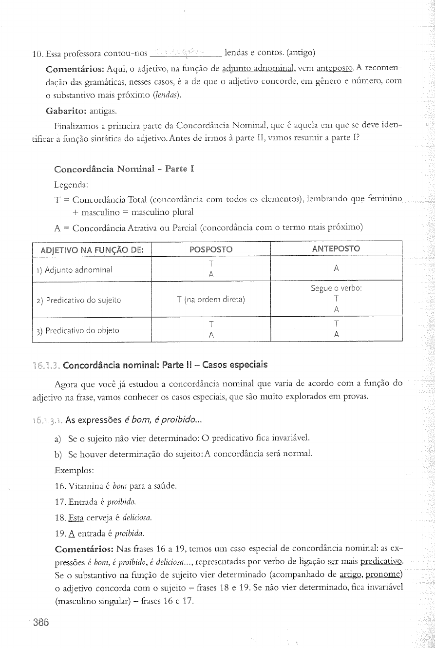 10. Essa professora contou-nos lendas e contos. (antigo) Comentários: Aqui, adjetivo, na função de adjunto adnominal, vem anteposto. A recomen- dação das gramáticas, nesses casos, é a de que adjetivo concorde, em gênero e número, com substantivo mais próximo (lendas) Gabarito: antigas. Finalizamos a primeira parte da Nominal, que é aquela em que se deve iden- tificar a função sintática do adjetivo. Antes de irmos à parte II, vamos resumir a parte I? Concordância Nominal Parte I Legenda: T = Total (concordância com todos os elementos), lembrando que feminino + masculino = masculino plural A = Concordância Atrativa ou Parcial (concordância com O termo mais próximo) ADJETIVO NA FUNÇÃO DE: POSPOSTO ANTEPOSTO T 1) Adjunto adnominal A A Segue verbo: 2) Predicativo do sujeito T (na ordem direta) T A T T 3) Predicativo do objeto A A 16.1.3. Concordância nominal: Parte II - Casos especiais Agora que você já estudou a concordância nominal que varia de acordo com a função do adjetivo na frase, vamos conhecer os casos especiais, que são muito explorados em provas. 16.1.3.1. As expressões é bom, é proibido.. a) Se sujeito não vier determinado: O predicativo fica b) Se houver determinação do sujeito: A concordância será normal. Exemplos: 16. Vitamina é bom para a saúde. 17. Entrada é proibido. 18. Esta cerveja é deliciosa. 19. A entrada é proibida. Comentários: Nas frases 16 a 19, temos um caso especial de concordância nominal: as ex- pressões é bom, é proibido, é deliciosa. representadas por verbo de ligação ser mais predicativo. Se o substantivo na função de sujeito vier determinado (acompanhado de artigo, pronome) adjetivo concorda com sujeito - frases 18 e 19. Se não vier determinado, fica invariável (masculino singular) - frases 16 e 17. 38616.1.3.2. Plural do adjetivo composto a) Adjetivo composto formado de adjetivo + O primeiro elemento fica invariável, e último concorda com substantivo a que se refere. Obs.: 1) azul-marinho, azul-celeste, ultravioleta: são invariáveis. 2) surdo-mudo: variam os dois elementos. b) Adjetivo composto formado de adjetivo + substantivo: Os dois elementos ficam invariáveis. Quando a cor vier representada por substantivo não varia. 20. Amizades luso-brasileiras. 21. Todas usavam saias vermelho-claras. 22. Assisti a reuniões político-sociais. 23. Descobertas médico-cientificas contribuem para bem da humanidade. 24. Comprou dois ternos azul-marinho. 25. Raios ultravioleta. 26. Meninos surdos-mudos. Comentários: A maioria dos exemplos de adjetivos compostos em Língua Portuguesa é aquela cuja formação é de dois adjetivos. Como vimos na teoria, só último elemento se flexiona em gênero e número, exceções feitas a: azul-marinho, azul-celeste e ultravioleta, que não se flexionam. Em surdo-mudo, embora seja um adjetivo composto formado por dois ad- jetivos, a gramática determina que os dois elementos variem em gênero e número (surdos-mu- dos, surdas-mudas). 27. Adorava tecidos verde-limão. 28. Bermudas amarelo-ouro. Comentários: Se aparecer substantivo no adjetivo composto, nenhum elemento se flexiona, ficam invariáveis. 29. Blusas laranja. 30, Sapatos cinza. 31. gelo. Comentários: Em português, observa-se que adjetivo é a classe que denota cor (blusas azuis, vermelhas, amarelas, brancas...). Quando a cor vem representada por substantivo (laranja, cinza, gelo, abóbora...), não varia, já que não é papel de substantivo denotar cor. 16.1.3.3. Expressões mesmo, próprio, obrigado, anexo... As expressões mesmo, próprio, anexo, quite, obrigado, incluso, leso, junto, tal concordam com nome ou pronome a que se referem. Obs.: Em anexo: fica invariável. 32. Elas mesmas não sabiam a questão. 38733. Ela própria escreveu bilhete. 34. Enviou-lhe anexas/em anexo neste envelope as duplicatas necessárias. 35. Vinham inclusas na pasta a carta e a procuração. 36. Estamos quites com todos vocês. 37. Muito obrigada, respondeu a moça. 38. Cometeram-se crimes de leso-idioma./ lesa-pátria. 39. Os filhos são tais qual pai./ O filho é tal quais os pais 40. Ana e Rosa saem sempre juntas. 41. Fernanda chegou junto com Lúcia à escola. Comentários: Nas frases 32 e 33, mesmas refere-se a elas e própria, a ela. Na frase 34, adjetivo anexas está se referindo a duplicatas. Na ordem direta, teríamos: "Enviou-lhe as duplicatas necessárias anexas" Uma outra forma de se dizer mesmo seria com a expres- são em anexo, que é invariável e está sempre certa. Na frase 35, inclusas é adjetivo de carta e procuração. Na ordem direta, teríamos: "A carta e a procuração vinham inclusas". Na frase 36, quites é adjetivo de nós, é mesmo que desobrigados. Vem do verbo quitar, é seu particípio irregular, mas, aqui, tem valor de adjetivo e concorda com pronome (nós) a que se refere. Obrigada, na frase 37, é adjetivo e concorda com substantivo moça. É por isso que meninos dizem obrigado e meninas, obrigada. Na frase 38, leso é adjetivo: é mes- mo que lesado, prejudicado. ele concordar em gênero e número com substantivo com qual forma uma composição (idioma e pátria). Na frase 39, tal e qual concordam com nome ou pronome que determinam: tal concorda com antecedente e qual, com O ele- mento seguinte. No primeiro exemplo, tais concordou com filhos e qual, com pai. No segundo exemplo, tal concordou com filho e quais, com pais. Na frase 40, juntas é adjetivo que se refere aos substantivos Ana e Rosa. Já na frase 41, tem-se a locução prepositiva junto com invariável. 16.1.3.4. Expressões menos, pseudo, alerta, um e outro, um ou outro... a) Monstro (como adjetivo), menos, pseudo, alerta: Ficam invariáveis b) Um e outro, nem um nem outro, um ou outro: Com essas expressões substantivo não se flexiona. 42. Compareceram menos pessoas que esperado. 43. Se você quiser manter a elegância, coma menos. 44. Ainda existem alguns pseudo-heróis. 45. Os soldados continuavam alerta. 46. São duas criaturas 