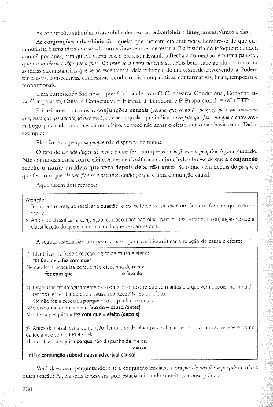 As conjunções subordinativas subdividem-se em adverbiais e integrantes. Vamos a elas... As conjunções adverbiais são aquelas que indicam circunstâncias. Lembre-se de que cir- cunstância é uma ideia que se adiciona à frase sem ser necessária. É a história do fofoqueiro: por para Certa vez, O professor Evanildo Bechara comentou, em uma palestra, que circunstância é algo que a frase não pede, só a nossa curiosidade.. Pois bem, cabe ao aluno conhecer as ideias circunstanciais que se acrescentam à ideia principal de um texto, desenvolvendo-a. Podem ser causais, consecutivas, concessivas, condicionais, comparativas, conformativas, finais, temporais e proporcionais. Uma curiosidade São nove tipos: 6 iniciando com C: Concessiva, Condicional, Conformati- va, Comparativa, Causal e Consecutiva + F Final; T Temporal e P Proporcional. = 6C+FTP Primeiramente, temos as conjunções causais (porque, que, como (= porque), pois que, uma vez que, visto que, porquanto, já que etc.), que são aquelas que indicam um fato que faz com que outro ocor- ra. Logo, para cada causa haverá um efeito. Se você não achar efeito, então não havia causa. Daí, exemplo: Ele não fez a pesquisa porque não dispunha de meios. O fato de ele não dispor de meios é que fez com que ele não fizesse a pesquisa. Agora, cuidado! Não confunda a causa com efeito. Antes de classificar a conjunção, lembre-se de que a conjunção recebe o nome da ideia que vem depois dela, não antes. Se que vem depois do porque é que fez com que ele não fizesse a pesquisa, então porque é uma conjunção causal. Aqui, valem dois recados: Atenção: 1. Tenha em mente, ao resolver a questão, O conceito de causa: ela é um fato que faz com que outro ocorra. 2. Antes de classificar a conjunção, cuidado para não olhar para lugar errado: a conjunção recebe a classificação do que ela inicia, não do que veio antes dela. A seguir, sistematizo um passo a passo para você identificar a relação de causa e efeito: 1) Identificar na frase a relação lógica de causa e efeito: "O fato de... fez com que" Ele não fez a pesquisa porque não dispunha de meios. fez com que o fato de 2) Organizar cronologicamente os acontecimentos: (o que vem antes e que vem depois, na linha do tempo), entendendo que a causa acontece ANTES do efeito. Ele não fez a pesquisa porque não dispunha de meios. Não dispunha de meios = o fato de = causa (antes) Não fez a pesquisa fez com que = efeito (depois) 3) Antes de classificar a conjunção, lembre-se de olhar para O lugar certo: a conjunção recebe nome da ideia que vem DEPOIS dela. Ele não fez a pesquisa porque não dispunha de causa Então: conjunção subordinativa adverbial causal. Você deve estar perguntando: e se a conjunção iniciasse a oração ele não fez a pesquisa e não a outra oração? Aí, ela seria consecutiva, pois estaria iniciando efeito, a consequência. 230Assim, surge a conjunção consecutiva, que é aquela que introduz uma oração que expres- sa a consequência da principal. São de sorte que, de modo que, de forma que, sem que (= que não), que (tendo como antecedente na oração principal uma palavra como tal, tão, cada, tanto, tamanho) etc. Portanto, temos a frase. Estudou tanto durante a noite que dormiu na hora do exame. O primeiro passo é reconhecer que há, nessa frase, uma relação de causa e efeito. Triste é quando a gente sequer enxerga isso no texto... Em seguida, organizar, na frase, que é causa e O que é o efeito. Lembre-se de que: 1. Na linha do tempo, a causa antecede efeito: acontece antes. 2. A conjunção recebe nome da ideia que ela Assim, temos: O fato de estudar tanto durante a noite aconteceu antes de ter dormido na hora do exame: estudar muito fez com que dormisse na prova. Logo, estudar é a causa e dormir é efeito. Ora, se a conjun- ção inicia fato de ter dormido na hora do exame, que é a consequência, ela é consecutiva e não causal. A seguir, mais exemplos de frases que expressam relações de causa e efeito, para você treinar com O nosso passo a passo: Estudou tanto durante a noite que dormiu na hora do exame. 1) O fato de ter estudado muito fez com que dormisse. (Relação de causa e efeito) 2) O que acontece primeiro? Dorme ou estuda? Estudou... = causa Dormiu... = efeito 3) Que inicia causa ou efeito? Efeito! Então é consecutiva. A dor era tanta que ferido desmaiou. 1) Há relação de causa e efeito? fato de fez com que... A dor desmaiou 2) que aconteceu primeiro? A dor = desmaiou antes depois causa efeito 3) A conjunção inicia a causa ou O efeito? Efeito consecutivo Agora vamos às conjunções concessivas. As conjunções concessivas introduzem uma ora- ção que expressa ideia contrária à da principal, sem, no entanto, impedir sua realização. São elas: ainda que, apesar de que, embora, mesmo que, conquanto, se bem que, por mais que, posto que etc. Observe: Embora fosse tarde, fomos visitá-lo. O fato de ser tarde não impediu que fôssemos São informações contrárias, que não se excluem. Além do mais, verbo está no subjuntivo (fosse), que acaba sendo uma característica marcante das conjunções concessivas. 231Atenção: 1. As conjunções concessivas indicam contrariedade, oposição. 2. A fim de não confundi-las com as coordenativas adversativas, que também contrastam, não deixe de memorizar as conjunções de cada lista e de lembrar que a conjunção concessiva, normalmente, leva verbo para subjuntivo, O que não ocorre com as adversativas. Mais um exemplo para você Eu não desistirei desse plano mesmo que todos me abando- nem. O fato de todos me abandonarem não impedirá que eu desista desse plano: ideia de concessão. Atenção ao verbo "abandonem", que está no presente do subjuntivo, isso ajuda a se ter certeza de que a conjunção é concessiva. Atenção às conjunções CONQUANTO e PORQUANTO, muito comuns nas provas: CONQUANTO = EMBORA Embora fosse tarde, fomos visitá-lo. (ideia contrária