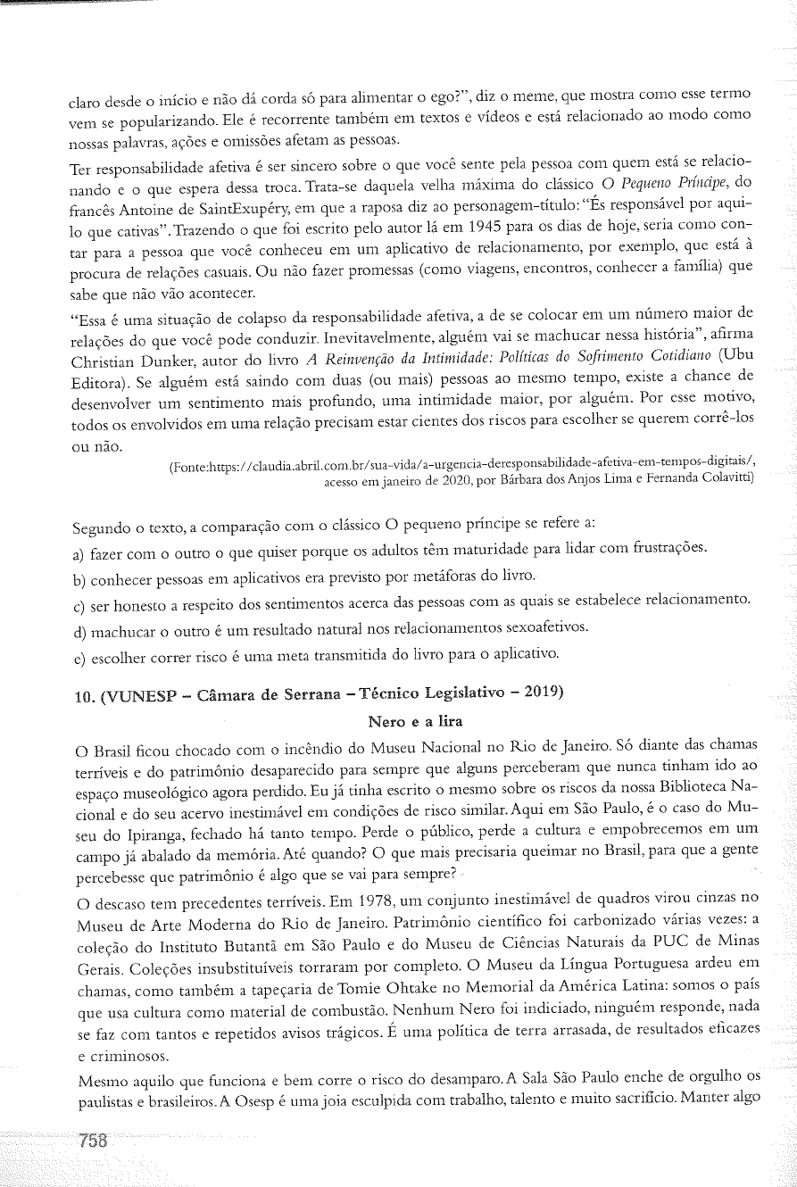 claro desde início e não dá corda só para alimentar ego?", diz meme, que mostra como esse termo vem se popularizando. Ele é recorrente também em textos e vídeos e está relacionado ao modo como nossas palavras, ações e omissões afetam as pessoas. Ter responsabilidade afetiva é ser sincero sobre O que você sente pela pessoa com quem está se relacio- nando e que espera dessa troca. Trata-se daquela velha máxima do clássico O Pequeno do francês Antoine de SaintExupéry, em que a raposa diz ao personagem-título: "És responsável por aqui- lo que Trazendo que foi escrito pelo autor lá em 1945 para os dias de hoje, seria como con- tar para a pessoa que você conheceu em um aplicativo de relacionamento, por exemplo, que está à procura de relações casuais. Ou não fazer promessas (como viagens, encontros, conhecer a família) que sabe que não vão acontecer. "Essa é uma situação de colapso da responsabilidade afetiva, a de se colocar em um número maior de relações do que você pode conduzir. Inevitavelmente, alguém vai se machucar nessa história", afirma Christian Dunker, autor do livro A Reinvenção da Intimidade: Políticas do Sofrimento Cotidiano (Ubu Editora). Se alguém está saindo com duas (ou mais) pessoas ao mesmo tempo, existe a chance de desenvolver um sentimento mais profundo, uma intimidade maior, por alguém. Por esse motivo, todos os envolvidos em uma relação precisam estar cientes dos riscos para escolher se querem corrê-los ou não. acesso em janeiro de 2020, por Bárbara dos Anjos Lima e Fernanda Colavitti) Segundo texto, a comparação com clássico O pequeno príncipe se refere a: a) fazer com outro que quiser porque os adultos têm maturidade para lidar com frustrações. b) conhecer pessoas em aplicativos era previsto por metáforas do livro. c) ser honesto a respeito dos sentimentos acerca das pessoas com as quais se estabelece relacionamento. d) machucar outro é um resultado natural nos relacionamentos sexoafetivos. e) escolher correr risco é uma meta transmitida do livro para O aplicativo. 10. (VUNESP Câmara de Serrana Técnico Legislativo 2019) Nero e a lira O Brasil ficou chocado com O incêndio do Museu Nacional no Rio de Janeiro. Só diante das chamas e do patrimônio desaparecido para sempre que alguns perceberam que nunca tinham ido ao espaço museológico agora perdido. Eu já tinha escrito mesmo sobre os riscos da nossa Biblioteca Na- cional e do seu acervo inestimável em condições de risco similar. Aqui em São Paulo, é caso do Mu- seu do Ipiranga, fechado há tanto tempo. Perde público, perde a cultura e empobrecemos em um campo já abalado da memória. Até quando? O que mais precisaria queimar no Brasil, para que a gente percebesse que patrimônio é algo que se vai para sempre? O descaso tem precedentes Em 1978, um conjunto inestimável de quadros virou cinzas no Museu de Arte Moderna do Rio de Janeiro. Patrimônio científico foi carbonizado várias vezes: a coleção do Instituto em São Paulo e do Museu de Ciências Naturais da PUC de Minas Gerais, Coleções insubstituíveis torraram por completo. O Museu da Língua Portuguesa ardeu em chamas, como também a tapeçaria de Tomie Ohtake no Memorial da América Latina: somos país que usa cultura como material de combustão. Nenhum Nero foi indiciado, ninguém responde, nada se faz com tantos e repetidos avisos trágicos. É uma política de terra arrasada, de resultados eficazes e criminosos. Mesmo aquilo que funciona e bem corre O risco do desamparo. A Sala São Paulo enche de orgulho os paulistas e brasileiros. A Osesp é uma joia esculpida com trabalho, talento e muito sacrifício. Manter algo 758do padrão da Osesp e da Sala São Paulo em um país como O Brasil é quase um milagre. A qualidade material da sala, esforço de todos e a educação de um público fiel. Por ela passa a fina flor da música brasileira e internacional. A cultura é assim. Muita coisa queimou, projetos sobreviveram em estado precário, e todos aguardam poderes sensíveis ao papel insubstituível da cultura na definição da cidadania. Quando eu vejo montante do fundo partidário em comparação ao estado precário de orquestras e museus, sou percor- rido por uma dor muito forte. O que mais terá de silenciar, queimar, desaparecer ou ficar no passado até que acordemos? Quantos artistas deixarão de comunicar seu talento com uma sociedade que necessita desesperadamente de criação e sensibilidade para pensar mais alto e melhor? Alguém aqui acha coincidência que a economia mais forte da Europa, a Alemanha, também seja uma terra de forte investimento privado e público na música e nas artes? O que mais precisa desaparecer para sempre, para que governos e eleitores descubram valor do nosso patrimônio material e imaterial? Para nós, pessoas sem poder, resta prestigiar O que ainda existe, visitar mais nossos museus, cobrar dos políticos que elegemos há pouco e valorizar com alunos e filhos os muitos heróis de uma resis- tência cultural. (Leandro Karnal. O Estado de S.Paulo. 18.11.2018. Adaptado) Ao afirmar que nenhum Nero foi indiciado, o autor ressalta a ideia de que a) figuras como Nero desapareceram ao longo dos períodos históricos. b) os responsáveis pelo descaso com patrimônio cultural continuam impunes. c) a população costuma se distanciar dos bens culturais e científicos. d) crimes contra patrimônio cultural não carecem de indiciamento. e) as autoridades brasileiras se empenham em apurar crimes contra a cultura. 11. (VUNESP Câmara de Serrana Técnico Legislativo 2019) Por que temos filhos? A pergunta do título comporta vários níveis de resposta. No plano biológico, a reprodução é um impe- rativo, fazendo parte de várias das definições de vida. Mas a biologia é só parte da história. A paternida- de também encerra dimensões culturais, econômicas e emocionais. Inspirado em "Anti-Pluralism", de William Galston, arrisco algumas reflexões sobre a maté