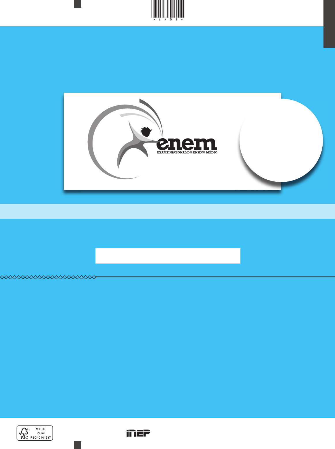 A COR DA CAPA DO SEU CADERNO DE QUESTÕES É AZUL. MARQUE-A EM SEU CARTÃO-RESPOSTA. PROVA DE CIÊNCIAS HUMANAS E SUAS TECNOLOGIAS PROVA DE CIÊNCIAS DA NATUREZA E SUAS TECNOLOGIAS Há uma doce luz no silêncio. LEIA ATENTAMENTE AS INSTRUÇÕES SEGUINTES: 1. Este CADERNO DE QUESTÕES contém 90 questões numeradas de 1 a 90, dispostas da seguinte maneira: a) as questões de número 1 a 45 são relativas à área de Ciências Humanas e suas Tecnologias; b) as questões de número 46 a 90 são relativas à área de Ciências da Natureza e suas Tecnologias. 2. Confira se o seu CADERNO DE QUESTÕES contém a quantidade de questões e se essas questões estão na ordem mencionada na instrução anterior. Caso o caderno esteja incompleto, tenha defeito ou apresente qualquer divergência, comunique ao aplicador da sala para que ele tome as providências cabíveis. 3. Para cada uma das questões objetivas, são apresentadas 5 opções. Apenas uma responde corretamente à questão. 4. O tempo disponível para estas provas é de quatro horas e trinta minutos. 5. Reserve os 30 minutos finais para marcar seu CARTÃO-RESPOSTA. Os rascunhos e as marcações assinaladas no CADERNO DE QUESTÕES não serão considerados na avaliação. 6. Quando terminar as provas, acene para chamar o aplicador e entregue este CADERNO DE QUESTÕES e o CARTÃO-RESPOSTA. 7. Você poderá deixar o local de prova somente após decorridas duas horas do início da aplicação e poderá levar seu CADERNO DE QUESTÕES ao deixar em definitivo a sala de prova nos 30 minutos que antecedem o término das provas. EXAME NACIONAL DO ENSINO MÉDIO ATENÇÃO: transcreva no espaço apropriado do seu CARTÃO-RESPOSTA, com sua caligrafia usual, considerando as letras maiúsculas e minúsculas, a seguinte frase: Ministério da Educação 1º DIA CADERNO 1 AZUL2015 *AZUL75SAB1* CH - 1º dia | Caderno 1 - AZUL - Página 2 2015*AZUL75SAB2* CIÊNCIAS HUMANAS E SUAS TECNOLOGIAS Questões de 1 a 45 QUESTÃO 01 BRASIL. Ministério do Meio Ambiente/IBGE. Biomas. 2004 (adaptado). No mapa estão representados os biomas brasileiros que, em função de suas características físicas e do modo de ocupação do território, apresentam problemas ambientais distintos. Nesse sentido, o problema ambiental destacado no mapa indica A desertificação das áreas afetadas. B poluição dos rios temporários. C queimadas dos remanescentes vegetais. D desmatamento das matas ciliares. E contaminação das águas subterrâneas. QUESTÃO 02 Dominar a luz implica tanto um avanço tecnológico quanto uma certa liberação dos ritmos cíclicos da natureza, com a passagem das estações e as alternâncias de dia e noite. Com a iluminação noturna, a escuridão vai cedendo lugar à claridade, e a percepção temporal começa a se pautar pela marcação do relógio. Se a luz invade a noite, perde sentido a separação tradicional entre trabalho e descanso — todas as partes do dia podem ser aproveitadas produtivamente. SILVA FILHO, A. L. M. Fortaleza: imagens da cidade. Fortaleza: Museu do Ceará; Secult-CE, 2001 (adaptado). Em relação ao mundo do trabalho, a transformação apontada no texto teve como consequência a A melhoria da qualidade da produção industrial. B redução da oferta de emprego nas zonas rurais. C permissão ao trabalhador para controlar seus próprios horários. D diminuição das exigências de esforço no trabalho com máquinas. E ampliação do período disponível para a jornada de trabalho. QUESTÃO 03 Apesar de seu disfarce de iniciativa e otimismo, o homem moderno está esmagado por um profundo sentimento de impotência que o faz olhar fixamente e, como que paralisado, para as catástrofes que se avizinham. Por isso, desde já, saliente-se a necessidade de uma permanente atitude crítica, o único modo pelo qual o homem realizará sua vocação natural de integrar-se, superando a atitude do simples ajustamento ou acomodação, apreendendo temas e tarefas de sua época. FREIRE, P. Educação como prática da liberdade. Rio de Janeiro: Paz e Terra, 2011. Paulo Freire defende que a superação das dificuldades e a apreensão da realidade atual será obtida pelo(a) A desenvolvimento do pensamento autônomo. B obtenção de qualificação profissional. C resgate de valores tradicionais. D realização de desejos pessoais. E aumento da renda familiar. QUESTÃO 04 AMARILDO. Disponível em: www.amarildo.com.br. Acesso em: 3 mar. 2013. Na charge há uma crítica ao processo produtivo agrícola brasileiro relacionada ao A elevado preço das mercadorias no comércio. B aumento da demanda por produtos naturais. C crescimento da produção de alimentos. D hábito de adquirir derivados industriais. E uso de agrotóxicos nas plantações. X X X X CH - 1º dia | Caderno 1 - AZUL - Página 3 2015 *AZUL75SAB3* QUESTÃO 05 A casa de Deus, que acreditam una, está, portanto, dividida em três: uns oram, outros combatem, outros, enfim, trabalham. Essas três partes que coexistem não suportam ser separadas; os serviços prestados por uma são a condição das obras das outras duas; cada uma por sua vez encarrega-se de aliviar o conjunto... Assim a lei pode triunfar e o mundo gozar da paz. ALDALBERON DE LAON. In: SPINOSA, F. Antologia de textos históricos medievais. Lisboa: Sá da Costa, 1981. A ideologia apresentada por Aldalberon de Laon foi produzida durante a Idade Média. Um objetivo de tal ideologia e um processo que a ela se opôs estão indicados, respectivamente, em: A Justificar a dominação estamental / revoltas camponesas. B Subverter a hierarquia social / centralização monárquica. C Impedir a igualdade jurídica / revoluções burguesas. D Controlar a exploração econômica / unificação monetária. E Questionar a ordem divina / Reforma Católica. QUESTÃO 06 A língua de que usam, por toda a costa, carece de três letras; convém a saber, não se acha nela F, nem L, nem R, coisa digna de espanto, porque assim não têm Fé, nem Lei, nem Rei,