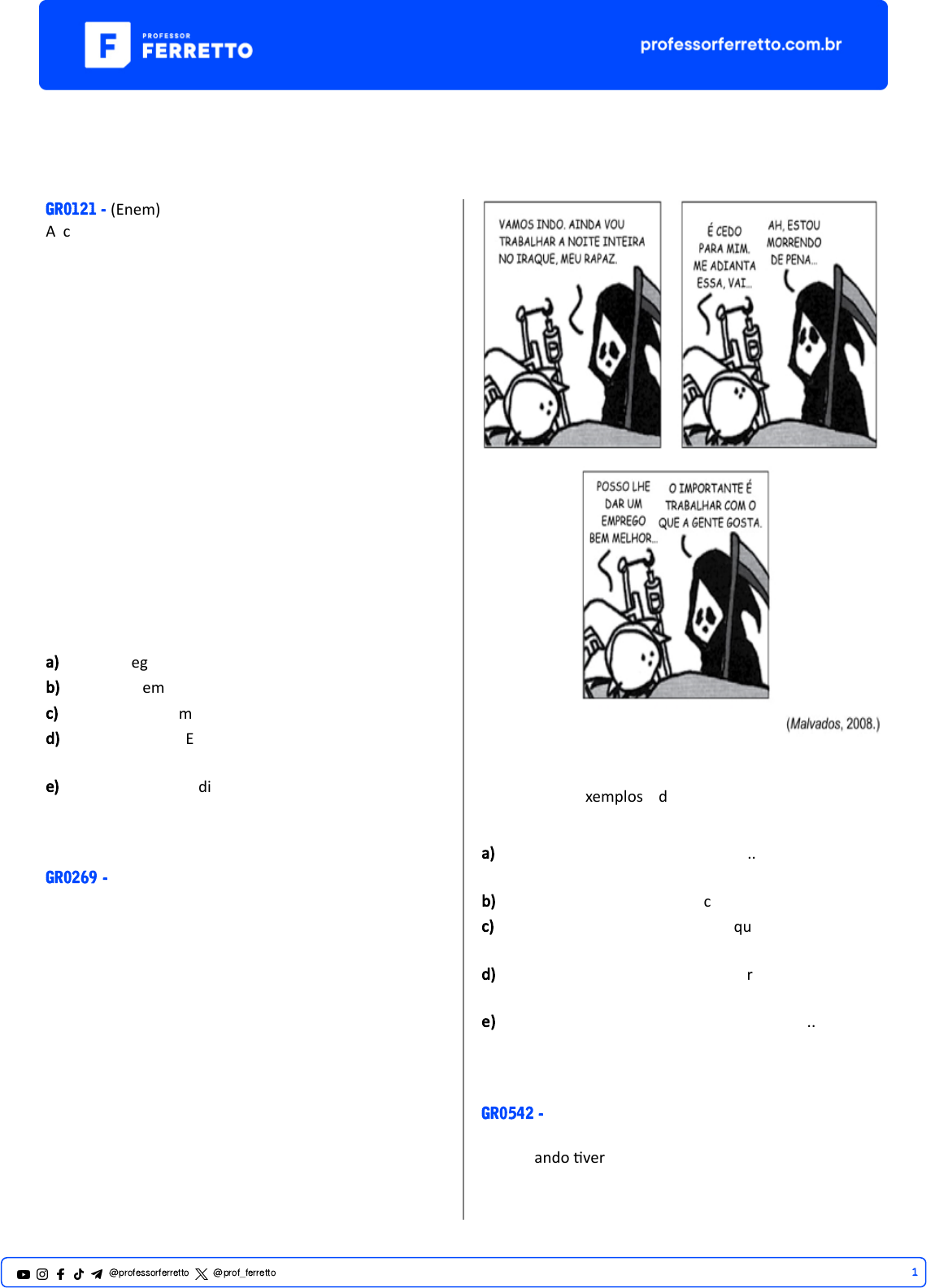 Colocação Pronominal GR0121 - (Enem) A colocação pronominal é a posição que os pronomes pessoais oblíquos átonos ocupam na frase em relação ao verbo a que se referem. São pronomes oblíquos átonos: me, te, se, o, os, a, as, lhe, lhes, nos e vos. Esses pronomes podem assumir três posições na oração em relação ao verbo. Próclise, quando o pronome é colocado antes do verbo, devido a par�culas atra�vas, como o pronome rela�vo. Ênclise, quando o pronome é colocado depois do verbo, o que acontece quando este es�ver no impera�vo afirma�vo ou no infini�vo impessoal regido da preposição “a” ou quando o verbo es�ver no gerúndio. Mesóclise, usada quando o verbo es�ver flexionado no futuro do presente ou no futuro do pretérito. A mesóclise é um �po de colocação pronominal raro no uso coloquial da língua portuguesa. No entanto, ainda é encontrada em contextos mais formais, como se observa em: a) Não lhe negou que era um improviso. b) Faz muito tempo que lhe falei essas coisas. c) Nunca um homem se achou em mais apertado lance. d) Referia-se à D. Evarista ou tê-la-ia encontrado em algum outro autor? e) Acabou de chegar dizendo-lhe que precisava retornar ao serviço imediatamente. GR0269 - (Unesp) Cons�tuem exemplos de linguagem formal e de linguagem coloquial, respec�vamente, as seguintes falas: a) “Ah, estou morrendo de pena...” e “Ainda vou trabalhar a noite inteira no Iraque, meu rapaz.” b) “Me adianta essa, vai...” e “É cedo para mim.” c) “O importante é trabalhar com o que a gente gosta.” e “Posso lhe dar um emprego bem melhor...” d) “É cedo para mim.” e “Posso lhe dar um emprego bem melhor...” e) “Posso lhe dar um emprego bem melhor...” e “Me adianta essa, vai...” GR0542 - (Esc. Naval) Laivos de memória “... e quando �verem chegado, vitoriosamente, ao fim dessa primeira etapa, mais ainda se convencerão de que 1@professorferretto @prof_ferretto abraçaram uma carreira di�cil, árdua, cheia de sacri�cios, mas ú�l, nobre e, sobretudo bela.” (NOSSA VOGA, Escola Naval, Ilha de Villegagnon, 1964) Há quase 50 anos, experimentei um misto de angús�a, tristeza e ansiedade que meu jovem coração de adolescente soube suportar com bravura. Naquela ocasião, despedia-me dos amigos de infância e da família e deixava para trás bucólica cidadezinha da região serrana fluminense. A mo�vação que me levava a abandonar gentes e coisas tão caras era, naquele momento, suficientemente forte para respaldar a decisão tomada de dar novos rumos à minha vida. Meu mundo de então se tornara pequeno demais para as minhas aspirações. Meus desejos e sonhos projetavam horizontes que iam muito além das montanhas que circundam minha terra natal. Como resis�r à sedução e ao fascínio que a vida no mar desperta nos corações dos jovens? Havia, portanto, uma convicção: aquelas despedidas, ainda que dolorosas – e despedidas são sempre dolorosas – não seriam certamente em vão. Não �nha dúvidas de que os sonhos que acalentavam meu coração pouco a pouco iriam se converter em realidade. (...) Inúmeros foram também os portos e cidades visitadas, não só no Brasil como no exterior, o que sempre nos proporciona ines�máveis e valiosos conhecimentos, principalmente graças ao contato com povos diferentes e até mesmo de culturas exó�cas e hábitos às vezes totalmente diversos dos nossos, como os ribeirinhos amazonenses ou os criadores de serpentes da an�ga Taprobana, ex-Ceilão e hoje Sri Lanka. Como foi fascinante e delicioso navegar por todos esses cantos. Cada novo mar percorrido, cada nova enseada, estreito ou porto visitado �nha sempre um gosto especial de descoberta... Sim, pois, como dizia Câmara Cascudo, “o mar não guarda os ves�gios das quilhas que o atravessam. Cada marinheiro tem a ilusão cordial do descobrimento”. (CÉSAR, CMG (RM1) William Carmo. Laivos de memória. In: Revista de Villegagnon, Ano IV, nº 4, 2009. p. 42-50. Texto adaptado) Assinale a opção em que o uso da ênclise se dá pelo mesmo mo�vo observado em: “Naquela ocasião, despedia-me dos amigos de infância e da família (...)” (2º parágrafo) a) Os Aspirantes sen�am-se orgulhosos de suas conquistas acadêmicas. b) Aqui, instalaram-se comodamente os atletas brasileiros, durante os Jogos Olímpicos. c) A mãe da jovem Aspirante �nha-lhe observado a importância da escolha profissional. d) Relatou-nos, com detalhes, as aventuras e desventuras de sua úl�ma viagem de barco. e) Os alunos não estavam gostando do livro, mas con�nuavam a lê-lo. GR0386 - (Enem) Papos – Me disseram... – Disseram-me. – Hein? – O correto é “disseram-me”. Não “me disseram”. – Eu falo como quero. E te digo mais... Ou é “digo-te”? – O quê? – Digo-te que você... – O “te” e o “você” não combinam. – Lhe digo? – Também não. O que você ia me dizer? – Que você está sendo grosseiro, pedante e chato. [...] – Dispenso as suas correções. Vê se esquece-me. Falo como bem entender. Mais uma correção e eu... – O quê? – O mato. – Que mato? – Mato-o. Mato-lhe. Mato você. Matar-lhe-ei-te. Ouviu bem? Pois esqueça-o e para-te. Pronome no lugar certo é eli�smo! – Se você prefere falar errado... – Falo como todo mundo fala. O importante é me entenderem. Ou entenderem-me? VERISSIMO, L. F. Comédias para se ler na escola. Rio de Janeiro: Obje�va, 2001 (adaptado). Nesse texto, o uso da norma-padrão defendido por um dos personagens torna-se inadequado em razão do(a) a) falta de compreensão causada pelo choque entre gerações. b) contexto de comunicação em que a conversa se dá. c) grau de polidez dis�nto entre os interlocutores. d) diferença de escolaridade entre os falantes. e) nível social dos par�cipantes da situação. GR0402 - (Unesp) Leia a crônica “Seu ‘Afredo’”, de Vinicius de Moraes (1913-1980). 2@professorf