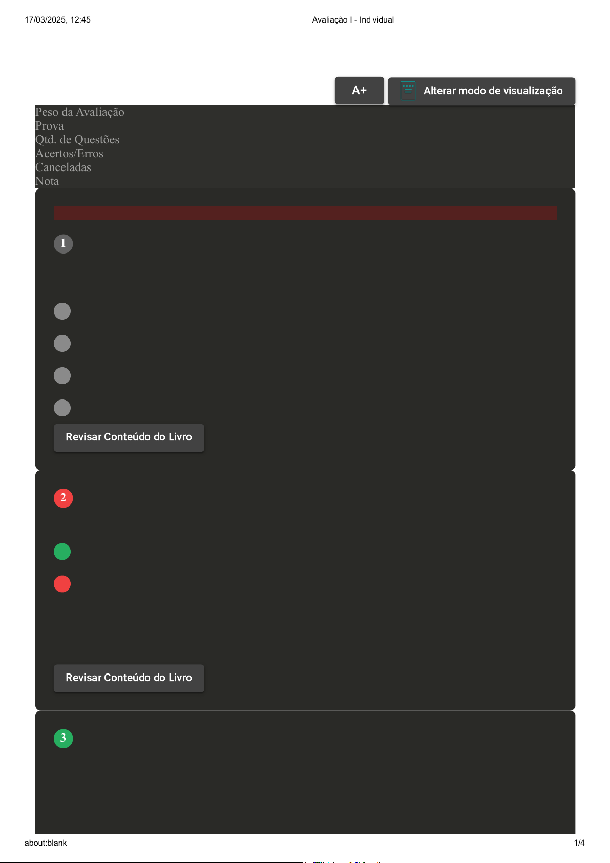 Prova Impressa GABARITO | Avaliação I - Individual (Cod.:655760) Peso da Avaliação 1,50 Prova 26786410 Qtd. de Questões 10 Acertos/Erros 7/2 Canceladas 1 Nota 8,00 Atenção: Esta questão foi cancelada, porém a pontuação foi considerada. As fibras de condução nervosa ou fibras nervosas de condução são formadas por meio de prolongamentos dos neurônios (dendritos / axônios) e seus envoltórios, organizando-se em feixes. Cada feixe forma um nervo e é responsável por revestir o sistema nervoso periférico. Assinale a alternativa CORRETA que se apresenta a camada que envolve essas estruturas nervosas: A Endoneuro. B Perineuro. C Tetraneuro. D Prolongamentos citoplasmáticos. O corpo humano é constituído por diversos tipos de células, aproximadamente 130 tipos que se distinguem por suas funções e formas específicas. Uma célula típica nos seres humanos é composta por diferentes partes. Assinale a alternativa CORRETA que apresenta as organelas celulares: A Mitocôndrias, retículos endoplasmáticos e complexos de golgi. B Núcleo celular, citoplasma e membrana plasmática. C Peroxissomos, lisossomos e ribossomos. D Núcleo celular, centríolos e vacúolos. Vivemos em um universo onde existe milhares de organismos vivos que usam os corpos de outros organismos para sobrevirem ou proliferarem. Esse é o caso para vírus, bactérias e fungos. Nesse sentido, existe dentro da epidemiologia um processo chamado de história natural da doença. Assinale a alternativa CORRETA quanto à história natural da doença: A Falha do sistema de proteção e a morte do sistema. VOLTAR A+ Alterar modo de visualização 1 Revisar Conteúdo do Livro 2 Revisar Conteúdo do Livro 3 17/03/2025, 12:45 Avaliação I - Individual about:blank 1/4 B Refere-se apenas ao estímulo patológico que gera o processo. C Inter-relações do agente, do suscetível e do meio ambiente. D Refere-se especificamente à maneira com que um vírus ataca o organismo. O corpo humano é pluricelular, ou seja, constituído por trilhões de células. As células são consideradas a menor parte dos organismos vivos e elementos estruturais funcionais. Assinale a alternativa CORRETA que apresenta as funções específicas das células: A Regeneração através da mitose celular, reposição das células que se perderam. B Reprodução através de reposição das células que se perderam. C Regeneração através da mitose celular, células novas se formam e células velhas morrem. D Produção de energia através da mitose celular. O conhecimento do que é doença e do conceito de saúde é muito importante, principalmente para os profissionais da área de saúde. O conhecimento do processo patológico e sua origem levará os profissionais a melhorar sua atuação. Quanto ao conceito de saúde segundo a organização mundial de saúde, assinale a alternativa CORRETA: A Ausência de doenças ou enfermidades. B Bom funcionamento dos sistemas do corpo humano. C Completo bem-estar físico, mental e social. D Estado de bem-estar físico e também mental. A ciência que estuda as causas das doenças, os mecanismos que as produzem e as alterações morfológicas é chamada de Patologia. Assim, a patologia é um segmento dentro da área de Medicina. Assinale a alternativa CORRETA que apresenta o objetivo de estudo da Patologia: A Prevenção de doenças. B Diagnóstico clínico. C Alterações funcionais nos tecidos. D Terapêutica das doenças. 4 5 6 Revisar Conteúdo do Livro 17/03/2025, 12:45 Avaliação I - Individual about:blank 2/4 A Patologia é uma disciplina fundamental para os profissionais da saúde e está dividida em patologia geral e anatomia patológica ou patologia sistêmica. A patologia engloba diferentes áreas, como Etiologia, Patogenia e Fisiopatologia. Quanto ao estudo da anatomia patológica, assinale a alternativa CORRETA: A Estuda os mecanismos básicos das doenças e tecidos frente a estímulos diversos. B Estuda as causas gerais e origens de um determinado fenômeno. C Estuda as alterações fisiopatológicas de cada estrutura de órgãos do corpo. D Estuda a junção dos processos normais e patológicos que acontecem no corpo humano. Os órgãos são formados por diferentes tipos de tecidos para realizar uma função específica no corpo humano. A união de diferentes órgãos forma um sistema. O organismo é formado por diferentes níveis de organização, desde o celular ao sistêmico, no entanto, é constituído por quatro principais compostos químicos. Assinale a alternativa CORRETA que apresenta os quatro principais compostos químicos no corpo humano: A Oxigênio, hidrogênio, nitrogênio e cálcio. B Oxigênio, hidrogênio, nitrogênio e carbono. C Oxigênio, cálcio, nitrogênio e fósforo. D Sódio, potássio, nitrogênio e carbono. A célula é a unidade básica estrutural e funcional do corpo humano. Grupos de células com uma função em comum formam os tecidos. No organismo, existem diferentes tipos de tecidos. Assinale a alternativa CORRETA que apresenta os quatro tipos básicos de tecidos no corpo humano: A Ósseo, conjuntivo, muscular e nervoso. B Epitelial, conjuntivo, muscular e nervoso. C Epitelial, muscular estriado, cardíaco e liso. D Epitelial, conjuntivo, muscular e cardíaco. A célula é a unidade básica da vida. No entanto, o corpo humano é formado por estruturas menores, como as células, até estruturas muito complexas. Assinale a alternativa CORRETA que apresenta a ordem dos níveis de organização do corpo humano: A Químico, sistêmico, orgânico, tecidual e celular. B Químico, celular, tecidual, orgânico e sistêmico. 7 8 9 10 17/03/2025, 12:45 Avaliação I - Individual about:blank 3/4 C Químico, celular, tecidual, sistêmico e orgânico. D Orgânico, sistêmico, químico, tecidual e celular. Imprimir 17/03/2025, 12:45 Avaliação I - Individual about:blank 4/4