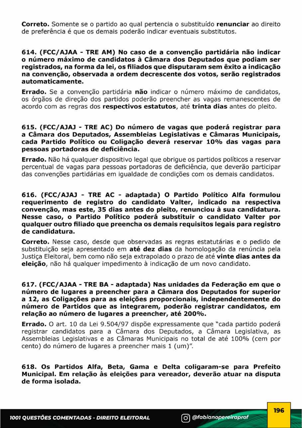 Correto. Somente se o partido ao qual pertencia o substituído renunciar ao direito de preferência é que os demais poderão indicar eventuais substitutos. 614. (FCC/AJAA TRE AM) No caso de a convenção partidária não indicar o número máximo de candidatos à Câmara dos Deputados que podiam ser registrados, na forma da lei, os filiados que disputaram sem êxito a indicação na convenção, observada a ordem decrescente dos votos, serão registrados automaticamente. Errado. Se a convenção partidária não indicar o número máximo de candidatos, os órgãos de direção dos partidos poderão preencher as vagas remanescentes de acordo com as regras dos respectivos estatutos, até trinta dias antes do pleito. 615. (FCC/AJAJ TRE AC) Do número de vagas que poderá registrar para a Câmara dos Deputados, Assembleias Legislativas e Câmaras Municipais, cada Partido Político ou Coligação deverá reservar 10% das vagas para pessoas portadoras de deficiência. Errado. Não há qualquer dispositivo legal que obrigue os partidos políticos a reservar percentual de vagas para pessoas portadoras de deficiência, que deverão participar das convenções partidárias em igualdade de condições com os demais candidatos. 616. (FCC/AJAJ TRE AC - adaptada) o Partido Político Alfa formulou requerimento de registro do candidato Valter, indicado na respectiva convenção, mas este, 35 dias antes do pleito, renunciou à sua candidatura. Nesse caso, o Partido Político poderá substituir o candidato Valter por qualquer outro filiado que preencha os demais requisitos legais para registro de candidatura. Correto. Nesse caso, desde que observadas as regras estatutárias e o pedido de substituição seja apresentado em até dez dias da homologação da renúncia pela Justiça Eleitoral, bem como não seja extrapolado o prazo de até vinte dias antes da eleição, não há qualquer impedimento à indicação de um novo candidato. 617. (FCC/AJAA TRE BA adaptada) Nas unidades da Federação em que o número de lugares a preencher para a Câmara dos Deputados for superior a 12, as Coligações para as eleições proporcionais, independentemente do número de Partidos que as integrarem, poderão registrar candidatos, em relação ao número de lugares a preencher, até 200%. Errado. art. 10 da Lei 9.504/97 dispõe expressamente que "cada partido poderá registrar candidatos para a Câmara dos Deputados, a Câmara Legislativa, as Assembleias Legislativas e as Câmaras Municipais no total de até 100% (cem por cento) do número de lugares a preencher mais 1 (um)". 618. Os Partidos Alfa, Beta, Gama e Delta coligaram-se para Prefeito Municipal. Em relação às eleições para vereador, deverão atuar na disputa de forma isolada. 196 1001 QUESTÕES COMENTADAS DIREITO ELEITORAL @fabianopereiraprofCorreto. Atualmente não são mais admitidas as coligações para disputa das eleições proporcionais. 619. (FCC/AJAJ TRE PE) É CORRETO afirmar que a coligação partidária poderá inscrever candidatos de qualquer Partido dela integrante, desde que respeitada a proporcionalidade com o número de Partidos coligados. Errado. Não há necessidade de respeito a qualquer proporcionalidade no momento de inscrição dos respectivos candidatos pela coligação. Trata-se de matéria interna corporis, que deve ser decidida conjuntamente pelos partidos integrantes da coligação. 620. (FCC/AJAA TRE PE) Os Partidos Alfa e Beta coligaram-se para Prefeito Municipal. Os Partidos Gama e Delta formaram outra coligação para Prefeito Municipal. Desse modo, esses quatro Partidos podem ser coligar para Vereador. Errado. Atualmente não são mais admitidas as coligações para disputa das eleições proporcionais. 621. (FCC/AJAA TRE AM) As convenções para escolha de candidatos deverão ter lugar no mês de junho do ano das eleições. Errado. As convenções partidárias para escolha de candidatos devem ser realizadas entre os dias 20 de julho e 05 de agosto do ano eleitoral. 622. (FCC/AJAJ TRE BA) Paulo é Senador eleito pelo Partido Alfa, está encerrando seu mandato e é candidato à reeleição. Para as eleições majoritárias destinadas à renovação de duas vagas no Senado Federal, inclusive a sua, Paulo terá seu número obrigatoriamente sorteado na Convenção Partidária, com a dezena do Partido, entre as centenas de 11 a 99. Errado. Os candidatos ao cargo de Senador concorrerão com o número identificador do partido político ao qual estiverem filiados, seguidos de um algarismo à direita (Exemplos: 131, 451, 153, 651 etc.). Ademais, é assegurado ao candidato que estiver pleiteando a reeleição o direito de manter o número que lhe foi atribuído na eleição anterior para o mesmo cargo. 623. (FCC/AJAJ TRE AC) Do número de vagas que poderá registrar para a Câmara dos Deputados, Assembleias Legislativas e Câmaras Municipais, cada Partido Político ou Coligação deverá reservar cinquenta por cento para candidaturas de cada sexo. Errado. Do número de vagas resultante das regras previstas na Lei 9.504/1997, cada partido ou coligação preencherá o mínimo de 30% (trinta por cento) e o máximo de 70% (setenta por cento) para candidaturas de cada sexo. 197 1001 QUESTÕES COMENTADAS DIREITO ELEITORAL @fabianopereiraprof624. (FCC/AJAJ TRE-TO) As propostas defendidas pelo candidato não se incluem dentre os documentos que devem instruir o registro de qualquer candidatura. Errado. Se o candidato deseja disputar os cargos de Prefeito, Governador de Estado ou Presidente da República, deverá apresentar, juntamente com os demais documentos exigidos para o registro de candidatura, cópia das propostas defendidas. 625. (FCC/AJAA TRE-TO) Se o registro do candidato estiver sub judice, ele poderá efetuar todos os atos relativos à campanha eleitoral, enquanto estiver sob essa condição. Correto. Para responder às questões de prova, lembre-se sempre de que a validade dos votos atribuídos ao candidato fica condicionada ao de