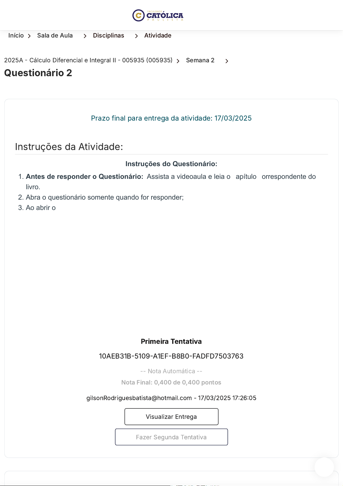 Início 〉 Sala de Aula 〉 Disciplinas 〉 Atividade 2025A � Cálculo Diferencial e Integral II � 005935 �005935� 〉 Semana 2 〉 Questionário 2 Instruções da Atividade: Prazo final para entrega da atividade: 17/03/2025 Instruções do Questionário: 1. Antes de responder o Questionário: Assista a videoaula e leia o capítulo correspondente do livro. 2. Abra o questionário somente quando for responder; 3. Ao abrir o questionário você terá 4 questões para responder; 4. Leia com calma todas as questões e entenda o que pede a questão: se pede a incorreta, a correta e qual o tema da questão; 5. Lembre-se de Clicar no botão "Enviar"; 6. Você tem duas tentativas para fazer o teste, a segunda tentativa é opcional; 7. Lembre-se que as respostas mudam de lugar em cada tentativa; 8. As respostas corretas só aparecem após o envio da segunda tentativa; 9. O sistema considera a maior nota entre as duas tentativas; 10. Lembre-se que na segunda tentativa zera TODAS as questões, inclusive as que você acertou na primeira tentativa. Bons estudos! Primeira Tentativa 10AEB31B�5109�A1EF�B8B0�FADFD7503763 -- Nota Automática -- Nota Final: 0,400 de 0,400 pontos gilsonRodriguesbatista@hotmail.com - 17/03/2025 17�26�05 Visualizar Entrega Fazer Segunda Tentativa https://ava.uca.edu.br/aluno/sala-de-aula/disciplina/modulo/atividade/280361 https://ava.uca.edu.br/aluno/sala-de-aula/disciplina/modulo/atividade/280361 https://ava.uca.edu.br/aluno/sala-de-aula/disciplina https://ava.uca.edu.br/aluno/sala-de-aula/disciplina/modulo/atividade/:id/:nome https://api.whatsapp.com/send?phone=5514988263000&text=Suporte javascript:void(0); Perguntas Pergunta 1. Pergunta 2. Pergunta 3. Pergunta 4. pontos: 0,100Pergunta 1. Utilizando a integração por substituição, assinale a alternativa que contenha a correta solução para a integral ∫ 1 1 + 2𝑥 dx: Múltipla Escolha: A�� 1 2 ln |𝑥²| + C B�� ln |1 + 2𝑥| + C C�� 1 2 ln |1 + 2𝑥| + C D�� 2𝑥² ln |1| + C E�� 1 2 ln |1 + 𝑥²| + C Avaliação https://api.whatsapp.com/send?phone=5514988263000&text=Suporte javascript:void(0); pontos: 0,100Pergunta 2. Utilizando a integração por substituição, assinale a alternativa que contenha a correta solução para a integral ∫ 𝑠𝑒𝑛² 𝑥 cos 𝑥 d𝑥: Múltipla Escolha: A�� 3𝑠𝑒𝑛³𝑥 + C B�� - 1 3 𝑠𝑒𝑛³𝑥 + C C�� 1 3 𝑠𝑒𝑛³𝑥 + C D�� - 1 3 cos³𝑥 + C E�� 3cos³𝑥 + C Nota Avaliada: 0,100 de 0,100 Avaliação Nota Avaliada: 0,100 de 0,100 https://api.whatsapp.com/send?phone=5514988263000&text=Suporte javascript:void(0); pontos: 0,100Pergunta 3. Utilizando a integração por partes, encontre a correta solução para a integral ∫𝑒ˣ𝑠𝑒𝑛𝑥 d𝑥: Múltipla Escolha: A�� 𝑒ˣcos 𝑥 4 - 𝑒ˣ𝑠𝑒𝑛 𝑥 2 + C B�� - 𝑒ˣcos 𝑥 2 + 𝑒ˣ𝑠𝑒𝑛 𝑥 2 + C C�� 𝑒ˣ- 𝑒ˣcos 𝑥 2 - 𝑒ˣ𝑠𝑒𝑛 𝑥 2 - C D�� 𝑒ˣ- 𝑒ˣcos 𝑥 2 + 𝑒ˣ𝑠𝑒𝑛 𝑥 2 + C E�� 𝑒ˣcos 𝑥 2 + 3𝑠𝑒𝑛 𝑥 2 + C pontos: 0,100Pergunta 4. Avaliação Nota Avaliada: 0,100 de 0,100 https://api.whatsapp.com/send?phone=5514988263000&text=Suporte javascript:void(0); Utilizando a integração por partes, encontre a correta solução para a integral ∫𝑥³𝑒ˣ d𝑥: Múltipla Escolha: A�� 𝑥³𝑒ˣ + 3𝑥³𝑒ˣ + 2𝑒ˣ + C B�� 𝑥³𝑒ˣ - 3 (𝑥² 𝑒ˣ - 2(𝑒ˣ𝑥 - 𝑒ˣ)) + C C�� 𝑥³𝑒ˣ - 3(𝑥²𝑒ˣ -(𝑒ˣ𝑥 - 𝑒ˣ)) + C D�� -𝑥³𝑒ˣ + 3𝑥³𝑒ˣ + 2(𝑒ˣ𝑥 - 𝑒ˣ) + C E�� 𝑥³𝑒ˣ - 3𝑥²𝑒ˣ + C Fechar Visualização 〈 Voltar aos Módulos Avaliação Nota Avaliada: 0,100 de 0,100 https://api.whatsapp.com/send?phone=5514988263000&text=Suporte javascript:void(0); 〈 Anterior Próxima 〉 Faculdade Católica Paulista Contato Endereço Avenida Cristo Rei, 305 � Banzato Marília, São Paulo – CEP� 17515�200 Horário De Funcionamento Segunda a quinta, das 8�00 às 20�00 horas As sextas, das 8�00 às 18�00 horas. WhatsApp : �14� 9.8826�3000 Telefone Sede: �14� 3422�1815 Central de Atendimento: 0800 664 5583 E-mail : secretaria@uca.edu.br https://www.instagram.com/faculdadecatolicaead/ https://facebook.com/ucaead https://www.youtube.com/@UcaEduBr https://www.linkedin.com/school/faculdade-catolica-paulista/?originalSubdomain=br https://maps.app.goo.gl/wWsD9QX5fVPa3h6PA https://api.whatsapp.com/send?phone=5514988263000&text=Suporte tel:14-3422-1815 tel:14-3422-1815 tel:0800-664-5583 tel:0800-664-5583 mailto:secretaria@uca.edu.br https://api.whatsapp.com/send?phone=5514988263000&text=Suporte javascript:void(0);