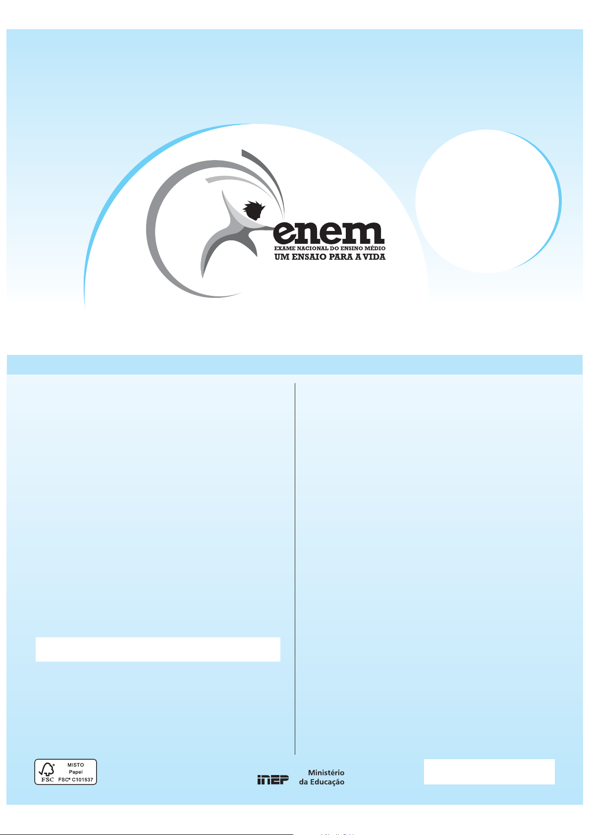 7 AZUL EXAME NACIONAL DO ENSINO MÉDIO 2º DIA CADERNO 2011 A COR DO SEU CADERNO DE QUESTÕES É AZUL. MARQUE-A EM SEU CARTÃO-RESPOSTA PROVA DE REDAÇÃO E DE LINGUAGENS, CÓDIGOS E SUAS TECNOLOGIAS PROVA DE MATEMÁTICA E SUAS TECNOLOGIAS 1 Este CADERNO DE QUESTÕES contém a Proposta de Redação e 90 questões numeradas de 91 a 180, dispostas da seguinte maneira: a. as questões de número 91 a 135 são relativas à área de Linguagens, Códigos e suas Tecnologias; b. as questões de número 136 a 180 são relativas à área de Matemática e suas Tecnologias. ATENÇÃO: as questões de 91 a 95 são relativas à língua estrangeira. Você deverá responder apenas às questões relativas à língua estrangeira (inglês ou espanhol) escolhida no ato de sua inscrição. 2 Confira se o seu CADERNO DE QUESTÕES contém a quantidade de questões e se essas questões estão na ordem mencionada na instrução anterior. Caso o caderno esteja incompleto, tenha qualquer defeito ou apresente divergência, comunique ao aplicador da sala para que ele tome as providências cabíveis. 3 Verifique, no CARTÃO-RESPOSTA e na FOLHA DE REDAÇÃO, que se encontra no verso do CARTÃO-RESPOSTA, se os seus dados estão registrados corretamente. Caso haja alguma divergência, comunique-a imediatamente ao aplicador da sala. 4 ATENÇÃO: após a conferência, escreva e assine seu nome nos espaços próprios do CARTÃO-RESPOSTA e da FOLHA DE REDAÇÃO com caneta esferográfica de tinta preta. 5 ATENÇÃO: transcreva no espaço apropriado do seu CARTÃO- RESPOSTA, com sua caligrafia usual, considerando as letras maiúsculas e minúsculas, a seguinte frase: 6 Marque no CARTÃO-RESPOSTA, no espaço apropriado, a opção correspondente à cor desta capa. ATENÇÃO: se você assinalar mais de uma opção de cor ou deixar todos os campos em branco, sua prova não será corrigida. 7 Não dobre, não amasse nem rasure o CARTÃO-RESPOSTA, pois ele não poderá ser substituído. 8 Para cada uma das questões objetivas, são apresentadas 5 opções identificadas com as letras A, B, C, D e E. Apenas uma responde corretamente à questão. 9 No CARTÃO-RESPOSTA, preencha todo o espaço compreendido no círculo correspondente à opção escolhida para a resposta. A marcação em mais de uma opção anula a questão, mesmo que uma das respostas esteja correta. 10 O tempo disponível para estas provas é de cinco horas e trinta minutos. 11 Reserve os 30 minutos finais para marcar seu CARTÃO-RESPOSTA. Os rascunhos e as marcações assinaladas no CADERNO DE QUESTÕES não serão considerados na avaliação. 12 Somente serão corrigidas as redações transcritas na FOLHA DE REDAÇÃO. 13 Quando terminar as provas, acene para chamar o aplicador e entregue este CADERNO DE QUESTÕES e o CARTÃO- RESPOSTA/FOLHA DE REDAÇÃO. 14 Você poderá deixar o local de prova somente após decorridas duas horas do início da aplicação e poderá levar seu CADERNO DE QUESTÕES ao deixar em definitivo a sala de provas nos últimos 30 minutos que antecedem o término da prova. 15 Você será excluído do exame no caso de: a) prestar, em qualquer documento, declaração falsa ou inexata; b) agir com incorreção ou descortesia para com qualquer participante ou pessoa envolvida no processo de aplicação das provas; c) perturbar, de qualquer modo, a ordem no local de aplicação das provas, incorrendo em comportamento indevido durante a realização do Exame; d) se comunicar, durante as provas, com outro participante verbalmente, por escrito ou por qualquer outra forma; e) utilizar qualquer tipo de equipamento eletrônico e de comunicação durante a realização do Exame; f) utilizar ou tentar utilizar meio fraudulento, em benefício próprio ou de terceiros, em qualquer etapa do Exame; g) utilizar livros, notas ou impressos durante a realização do Exame; h) se ausentar da sala de provas levando consigo o CADERNO DE QUESTÕES antes do prazo estabelecido e/ou o CARTÃO-RESPOSTA a qualquer tempo. LEIA ATENTAMENTE AS INSTRUÇÕES SEGUINTES *AZUL25DOM0* Lenta, descansa a onda que a maré deixa.