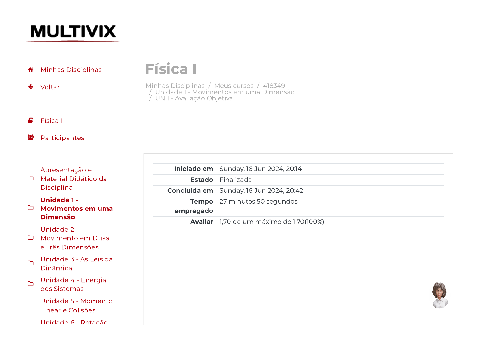 Minhas Disciplinas / Meus cursos / 418349 / Unidade 1 - Movimentos em uma Dimensão / UN 1 - Avaliação Objetiva Física I Iniciado em Sunday, 16 Jun 2024, 20:14 Estado Finalizada Concluída em Sunday, 16 Jun 2024, 20:42 Tempo empregado 27 minutos 50 segundos Avaliar 1,70 de um máximo de 1,70(100%) Minhas Disciplinas Voltar Física I Participantes Apresentação e Material Didático da Disciplina Unidade 1 - Movimentos em uma Dimensão Unidade 2 - Movimento em Duas e Três Dimensões Unidade 3 - As Leis da Dinâmica Unidade 4 - Energia dos Sistemas Unidade 5 - Momento Linear e Colisões Unidade 6 - Rotação, https://avap.multivix.edu.br/my/ https://avap.multivix.edu.br/course/view.php?id=26252 https://avap.multivix.edu.br/course/view.php?id=26252§ion=2 https://avap.multivix.edu.br/mod/quiz/view.php?id=1634386 https://avap.multivix.edu.br/my/ https://avap.multivix.edu.br/course/view.php?id=26252 https://avap.multivix.edu.br/user/index.php?id=26252 https://avap.multivix.edu.br/course/view.php?id=26252§ion=1 https://avap.multivix.edu.br/course/view.php?id=26252§ion=2 https://avap.multivix.edu.br/course/view.php?id=26252§ion=3 https://avap.multivix.edu.br/course/view.php?id=26252§ion=4 https://avap.multivix.edu.br/course/view.php?id=26252§ion=5 https://avap.multivix.edu.br/course/view.php?id=26252§ion=6 https://avap.multivix.edu.br/course/view.php?id=26252§ion=7 https://avap.multivix.edu.br/ https://avap.multivix.edu.br/ https://avap.multivix.edu.br/ https://avap.multivix.edu.br/ https://avap.multivix.edu.br/ https://avap.multivix.edu.br/ https://avap.multivix.edu.br/ https://avap.multivix.edu.br/ https://avap.multivix.edu.br/ https://avap.multivix.edu.br/ https://avap.multivix.edu.br/ Questão 1 Correto Atingiu 0,34 de 0,34 Os engenheiros de uma indústria automotiva realizaram uma série de testes com um novo automóvel, monitorando o deslocamento de um piloto de provas em função do tempo, como se vê no grá�co a seguir: Considerando os trechos assinalados no grá�co, avalie as a�rmações a seguir. I. A velocidade no ponto B é maior do que no ponto A. II. No ponto C, o veículo está com sua maior velocidade. III. No ponto D, o veículo está desacelerando. IV. No ponto E, o veículo encontra-se em repouso. Minhas Disciplinas Voltar Física I Participantes Apresentação e Material Didático da Disciplina Unidade 1 - Movimentos em uma Dimensão Unidade 2 - Movimento em Duas e Três Dimensões Unidade 3 - As Leis da Dinâmica Unidade 4 - Energia dos Sistemas Unidade 5 - Momento Linear e Colisões Unidade 6 - Rotação, https://avap.multivix.edu.br/my/ https://avap.multivix.edu.br/course/view.php?id=26252 https://avap.multivix.edu.br/user/index.php?id=26252 https://avap.multivix.edu.br/course/view.php?id=26252§ion=1 https://avap.multivix.edu.br/course/view.php?id=26252§ion=2 https://avap.multivix.edu.br/course/view.php?id=26252§ion=3 https://avap.multivix.edu.br/course/view.php?id=26252§ion=4 https://avap.multivix.edu.br/course/view.php?id=26252§ion=5 https://avap.multivix.edu.br/course/view.php?id=26252§ion=6 https://avap.multivix.edu.br/course/view.php?id=26252§ion=7 https://avap.multivix.edu.br/ https://avap.multivix.edu.br/ https://avap.multivix.edu.br/ https://avap.multivix.edu.br/ https://avap.multivix.edu.br/ https://avap.multivix.edu.br/ https://avap.multivix.edu.br/ https://avap.multivix.edu.br/ https://avap.multivix.edu.br/ https://avap.multivix.edu.br/ https://avap.multivix.edu.br/ É correto apenas o que se a�rma em. Escolha uma opção: a. II e III. b. I, II e III. c. I, III e IV. d. I e IV. e. I e II. Minhas Disciplinas Voltar Física I Participantes Apresentação e Material Didático da Disciplina Unidade 1 - Movimentos em uma Dimensão Unidade 2 - Movimento em Duas e Três Dimensões Unidade 3 - As Leis da Dinâmica Unidade 4 - Energia dos Sistemas Unidade 5 - Momento Linear e Colisões Unidade 6 - Rotação, https://avap.multivix.edu.br/my/ https://avap.multivix.edu.br/course/view.php?id=26252 https://avap.multivix.edu.br/user/index.php?id=26252 https://avap.multivix.edu.br/course/view.php?id=26252§ion=1 https://avap.multivix.edu.br/course/view.php?id=26252§ion=2 https://avap.multivix.edu.br/course/view.php?id=26252§ion=3 https://avap.multivix.edu.br/course/view.php?id=26252§ion=4 https://avap.multivix.edu.br/course/view.php?id=26252§ion=5 https://avap.multivix.edu.br/course/view.php?id=26252§ion=6 https://avap.multivix.edu.br/course/view.php?id=26252§ion=7 https://avap.multivix.edu.br/ https://avap.multivix.edu.br/ https://avap.multivix.edu.br/ https://avap.multivix.edu.br/ https://avap.multivix.edu.br/ https://avap.multivix.edu.br/ https://avap.multivix.edu.br/ https://avap.multivix.edu.br/ https://avap.multivix.edu.br/ https://avap.multivix.edu.br/ https://avap.multivix.edu.br/ Questão 2 Correto Atingiu 0,34 de 0,34 Um veículo de passeio se movimenta ao longo de uma estrada retilínea, e o comportamento de sua velocidade, em função do tempo, encontra-se retratato no grá�co a seguir: Considerando o grá�co, avalie as a�rmações a seguir. I. O movimento tem aceleração variável. II. Em t = 8 s o veículo retorna ao seu ponto de origem. III. Em t = 4 s o veículo tem velocidade nula. IV. No intervalo entre 4 s e 8 s o móvel está freando. É correto apenas o que se a�rma em. Minhas Disciplinas Voltar Física I Participantes Apresentação e Material Didático da Disciplina Unidade 1 - Movimentos em uma Dimensão Unidade 2 - Movimento em Duas e Três Dimensões Unidade 3 - As Leis da Dinâmica Unidade 4 - Energia dos Sistemas Unidade 5 - Momento Linear e Colisões Unidade 6 - Rotação, https://avap.multivix.edu.br/my/ https://avap.multivix.edu.br/course/view.php?id=26252 https://avap.multivix.edu.br/user/index.php?id=26252 https://avap.multivix.edu.br/course/view.php?id=26252§ion=1 https://avap.multivix.edu.br/course/view.php?id=26252§ion=2 https://avap.multivix.edu.br/course/view.php?id=26252§ion=3 https://avap.mult