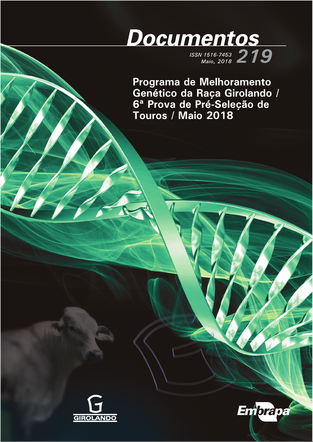 Empresa Brasileira de Pesquisa Agropecuária Embrapa Gado de Leite Ministério da Agricultura, Pecuária e Abastecimento Associação Brasileira dos Criadores de Girolando Embrapa Gado de Leite Juiz de Fora, MG 2018 Programa de Melhoramento Genético da Raça Girolando 6ª Prova de Pré-Seleção de Touros Maio 2018 Marcello de Aguiar Rodrigues Cembranelli Gustavo Sousa Gonçalves Leandro de Carvalho Paiva Marcos Vinicius Gualberto Barbosa da Silva Marta Fonseca Martins João Cláudio do Carmo Panetto Edivaldo Ferreira Junior Mariana Magalhães Campos Marco Antonio Machado Daniele Ribeiro de Lima Reis Faza Editores Técnicos DOCUMENTOS 219 ISSN 1516-7453 Maio/2018 Exemplares desta publicação podem ser adquiridos na: Embrapa Gado de Leite Rua Eugênio do Nascimento, 610 – Bairro Dom Bosco 36038-330 – Juiz de Fora, MG Fone: (32) 3311-7400 Fax: (32) 3311-7401 www.embrapa.br www.embrapa.br/fale-conosco/sac Associação Brasileira dos Criadores de Girolando Rua Orlando Vieira do Nascimento, 74 – Vila São Cristóvão 38040-280 – Uberaba, MG Fone:(34) 3331-6000 www.girolando.com.br girolando@girolando.com.br Todos os direitos reservados. A reprodução não autorizada desta publicação, no todo ou em parte, constitui violação dos direitos autorais (Lei nº 9.610). Dados Internacionais de Catalogação na Publicação (CIP) Embrapa Gado de Leite © Embrapa, 2018 Programa de Melhoramento Genético da Raça Girolando – 6ª Prova de Pré-Seleção de Touros – Maio 2018 / Marcello de Aguiar Rodrigues Cembranelli... [et al.]. Juiz de Fora : Embrapa Gado de Leite. 36 p. (Embrapa Gado de Leite. Documentos, 219). ISSN 1516-7453 1. Raça Girolando. 2. Melhoramento animal. 4. Teste de progênie. I. Cembranelli, Marcello de Aguiar Rodrigues. II. Gonçalves, Gustavo Sousa, III. Paiva, Leandro de Carvalho. IV. Silva, Marcos Vinícius Gualberto Barbosa da. V. Martins, Marta Fonseca. VI. Panetto, João Cláudio do Carmo. VII. Ferreira Junior, Edivaldo. VIII. Costa, Mateus José Rodrigues Paranhos da. IX. Silva, Lívia Carolina Magalhães. X. Carvalhal, Monique Valéria de Lima. XI. Sant’Anna, Aline Cristina. XII. Campos, Mariana Magalhães. XIII. Machado, Marco Antonio. XIV. Faza, Daniele Ribeiro de Lima Reis. XV. Guimarães, José Domingos. XVI. Guimarães, Simone Eliza Facioni. XVII. Série. CDD 636.082.2 Comitê Local de Publicações da Unidade Responsável Presidente Pedro Braga Arcuri Secretário-Executivo Inês Maria Rodrigues Membros Jackson Silva e Oliveira, Leônidas Paixão Passos, Alexander Machado Auad, Fernando César Ferraz Lopes, Francisco José da Silva Lédo, Pérsio Sandir D´Oliveira, Fábio Homero Diniz, Frank Angelo Tomita Bruneli, Nívea Maria Vicentini, Letícia Caldas Mendonça, Rita de Cássia Bastos de Souza, Rita de Cássia Palmyra da Costa Pinto, Virgínia de Souza Columbiano Barbosa Supervisão editorial Marta Fonseca Martins Normalização bibliográfica Inês Maria Rodrigues Tratamento das ilustrações e editoração eletrônica Carolina Rodrigues Pereira e Carlos Alberto Medeiros de Moura Projeto gráfico da coleção Carlos Eduardo Felice Barbeiro Arte da capa Criar Propaganda 1ª edição 1ª impressão (2018): 500 Autores Marcello de Aguiar Rodrigues Cembranelli Médico Veterinário, mestre em Ciência Animal, Coordenador Operacional do PMGG, Associação Brasileira dos Criadores de Girolando, Uberaba, MG Gustavo Sousa Gonçalves Zootecnista, técnico da Associação Brasileira dos Criadores de Girolando, Uberaba, MG Leandro de Carvalho Paiva Zootecnista, Superintendente Técnico da Associação Brasileira dos Criadores de Girolando, Uberaba, MG Marcos Vinícius Gualberto Barbosa da Silva Zootecnista, doutor em Genética e Melhoramento, pesquisador da Embrapa Gado de Leite, Juiz de Fora, MG Marta Fonseca Martins Bióloga, doutora em Genética e Melhoramento, pesquisadora da Embrapa Gado de Leite, Juiz de Fora, MG João Cláudio do Carmo Panetto Zootecnista, doutor em ciências biológicas (genética), pesquisador da Embrapa Gado de Leite, Juiz de Fora, MG Edivaldo Ferreira Junior Graduando em Zootecnia, técnico da Associação Brasileira dos Criadores de Girolando, Uberaba, MG Mateus José Rodrigues Paranhos da Costa Zootecnista, doutor em Psicobiologia, professor da Universidade Estadual Paulista Júlio de Mesquita Filho, Jaboticabal, SP Lívia Carolina Magalhães Silva Zootecnista, doutora em Zootecnia, bolsista de pós-doutorado Universidade Estadual Paulista Júlio de Mesquita Filho, Jaboticabal, SP Monique Valéria de Lima Carvalhal Zootecnista, doutora em Zootecnia, Universidade Estadual Paulista Júlio de Mesquita Filho, Jaboticabal, SP Aline Cristina Sant’Anna Bióloga, doutora em Genética e Melhoramento Animal, professora da Universidade Federal de Juiz de Fora, Juiz de Fora, MG Mariana Magalhães Campos Médica Veterinária, doutora em Zootecnia, pesquisadora da Embrapa Gado de Leite, Juiz de Fora, MG Marco Antonio Machado Engenheiro Agrônomo, doutor em Genética e Melhoramento, pesquisador da Embrapa Gado de Leite, Juiz de Fora, MG Daniele Ribeiro de Lima Reis Faza Farmacêutica e bioquímica, analista da Embrapa Gado de Leite, Juiz de Fora, MG José Domingos Guimarães Médico Veterinário, doutor em Reprodução Animal, professora da Universidade Federal de Viçosa, Viçosa, MG Simone Eliza Facioni Guimarães Médica Veterinária, doutora em Genética e Melhoramento Animal, professora da Universidade Federal de Viçosa, Viçosa, MG Apresentação Em 2013, a Associação Brasileira dos Criadores de Girolando – Girolando, a Embrapa e o Instituto Federal de Educação, Ciência e Tecnologia do Triângulo Mineiro – IFTM estabeleceram uma parceria com o objetivo de selecionar os melhores reprodutores antes de serem incluídos no Teste de Progênie. Até agora, já foram realizadas seis Provas de Pré-Seleção de Touros para o Teste de Progênie da Raça Girolando. Essa estratégia mostrou-se acertada, uma vez que já vem trazendo result