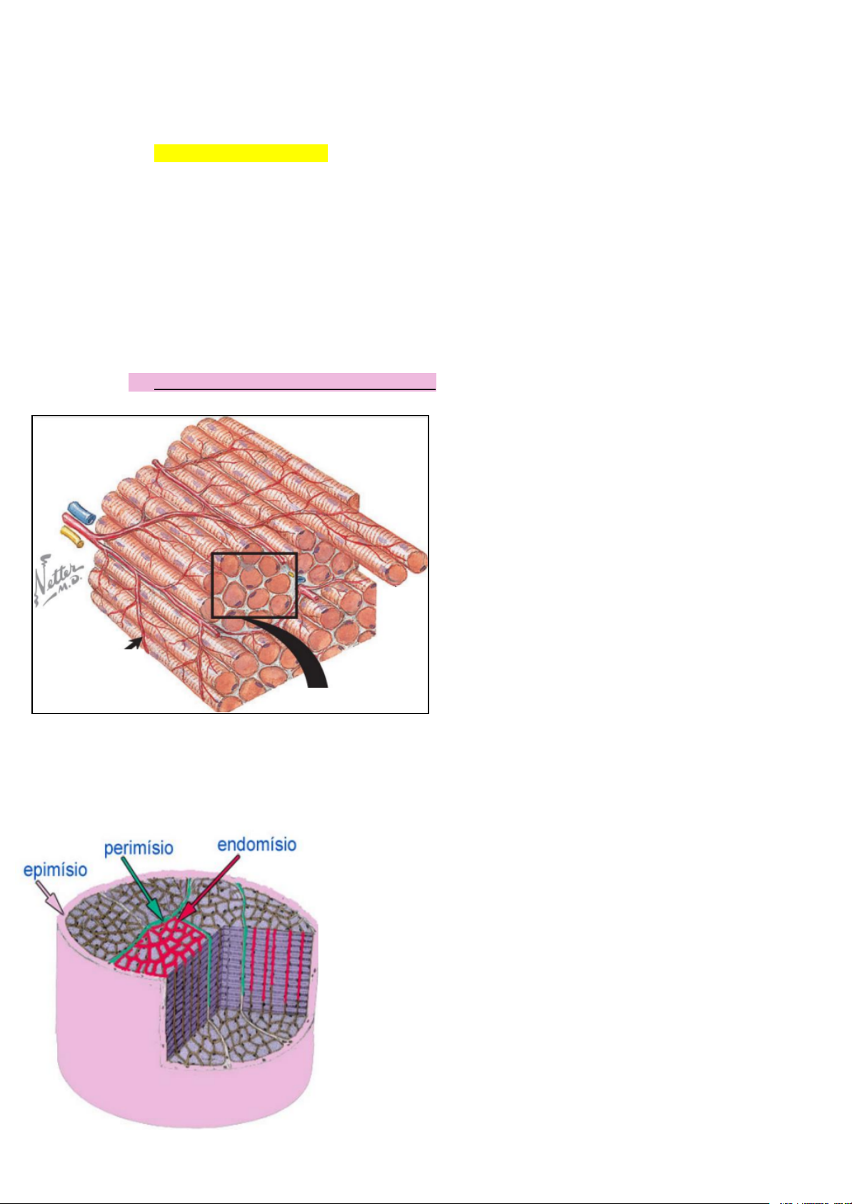 HISTOLOGIA - TECIDO MUSCULAR ● FIBRAS MUSCULARES são as células especializadas dos tecidos musculares - células contráteis, permitindo movimentação - a contratilidade é proporcionada pelos MIOFILAMENTOS (proteínas contráteis): ACTINA (miofilamentos delgados) e MIOSINA (miofilamentos espessos) ● Existem 3 tipos de músculo: estriado esquelético, estriado cardíaco e liso - podem ser diferenciados a microscopia óptica por alguns critérios: I. espessura das fibras II. posição e quantidade de núcleos III. presença ou não de estriações (visíveis em cortes longitudinais) 1) MÚSCULO ESTRIADO ESQUELÉTICO ● Fibras cilíndricas longas, que apresentam o comprimento do músculo em que estão localizadas - vão de ponta a ponta no músculo ● São multinucleadas - os núcleos se encontram na periferia das fibras - o sarcoplasma (citoplasma) é praticamente todo preenchido pelas miofibrilas/miofilamentos (80%) - as organelas ficam amassadas entre as fibrilas ou na periferia da fibra ● Presença de estriações transversais no citoplasma ● Contração rápida, forte, descontínua e voluntária ● Organização: a) EPIMÍSIO: tecido conjuntivo denso modelado que envolve todo o músculo - é a capa esbranquiçada que envolve peças de carne no açougue - a fáscia é uma camada externa de epimísio que garante proteção b) PERIMÍSIO: tecido conjuntivo frouxo ricamente vascularizado e inervado - forma septos que dividem o músculo em conjuntos de fibras chamados FASCÍCULOS ou FEIXES - presença principalmente de nervos motores, que propiciam a contração - alta vascularização promove chegada de nutrientes para geração de energia local c) ENDOMÍSIO: tecido conjuntivo frouxo delicado que envolve cada uma das fibras musculares - contém vasos sanguíneos (arteríolas, vênulas e capilares) e linfáticos e nervos ● Junção miotendínea/miotendinosa: região de união entre as fibras musculares estriadas esqueléticas e o tecido conjuntivo denso modelado do tendão - esse tecido conjuntivo tendíneo se insere no osso ● Organização ultraestrutural - SARCOLEMA: membrana plasmática - SARCOPLASMA: citoplasma - RETÍCULO SARCOPLASMÁTICO: retículo endoplasmático liso 💀 ESSA NOMENCLATURA É VÁLIDA PARA TODOS OS TIPOS DE MÚSCULO!! ● As estriações são causadas pelo alinhamento paralelo dos miofilamentos delgados e dos miofilamentos espessos - os miofilamentos delgados são os miofilamentos de actina - os miofilamentos espessos são os miofilamentos de miosina ● SARCÔMERO: é a unidade funcional do músculo estriado (tanto esquelético como cardíaco) - um sarcômero se estende de uma LINHA Z à outra - bandas I: formadas unicamente por miofilamentos de actina (como são filamentos delgados, as bandas I aparentam ser mais claras) - bandas A: formadas por filamentos de actina e miosina na porção que não coincide com a banda H (aparência mais escura de todo o sarcômero) - bandas H: porção da banda A que não apresenta actina, apresentando somente miosina (mais escura que as bandas I, porém mais clara que o restante da banda A) - linha M: miosinas que interagem através de pontes moleculares (por isso o tom mais escurecido) ● O filamento de actina F (filamentosa) é formado por monômeros de actina G (globular) ● O filamento de miosina é formado pelas cadeias pesadas de miosina (caudas) e pelas cadeias leves de miosina (cabeças) - a cabeça é a parte responsável pela interação com a actina, mecanismo que promove a contração ● Componentes estruturais dos MIOFILAMENTOS DELGADOS - Actina F: base do miofilamento - Tropomiosina: “corda” que se liga ao filamento de actina para estabilizá-lo, conferindo à molécula uma “amarração final” ➢ 2 cadeias em disposição helicoidal no sulco gerado pela conformação da cadeia de actina F - Complexo de troponina: formado por 3 subunidades de troponina I. Troponina T: se liga à tropomiosina II. Troponina I: troponina inibitória (inibe interação entre actina e miosina, impedindo a contração) III. Troponina C: ligação com Ca2+, desencadeando a contração - Nebulina: controla o tamanho do filamento de actina (não permite que moléculas de actina G se polimeriza em excesso) ● Componentes estruturais dos MIOFILAMENTOS ESPESSOS - moléculas de miosina II: 2 caudas trançadas em hélice + 4 cabeças nas extremidades - polimerização: caudas alinhadas em paralelo para o centro do miofilamento (zona central) e cabeças voltadas para as extremidades (para a interação com a actina) ● Os miofilamentos espessos estão ancorados às linhas Z através de moléculas elásticas de proteínas chamadas TITINAS ● A linha Z é formada por diversas proteínas, sendo as principais: - alfa-actinina: separa os miofilamentos delgados paralelos entre si - cap Z: ancoragem do miofilamento delgado e espesso ● Desmina: ligação das miofibrilas (ao nível da linha Z) aos costâmeros (regiões do sarcolema) - isso mantém a estrutura do sarcolema e a estabilidade das fibrilas no sarcoplasma - isso gera a contração TOTAL da célula, inclusive do sarcolema - obs.: distrofinas → proteínas que promovem a interação entre desminas e costâmeros 💀 Distrofia muscular de Duchenne: defeito na produção de distrofinas, o que gera falta de adesão ao sarcolema e acarreta lesões e morte muscular ➢ morte precoce, geralmente ainda na infância ➢ herança ligada ao sexo associada ao cromossomo X 💡COMO OCORRE A CONTRAÇÃO DO MÚSCULO ESTRIADO ESQUELÉTICO? ● PLACA MOTORA: axônio de neurônio motor se difunde na fibra muscular, formando uma conexão sináptica entre o nervo e o músculo (junção neuromuscular) ● Mecanismo contrátil: I. liberação de neurotransmissores (acetilcolina), através de vesículas sinápticas que realizam exocitose, do axônio para a placa motora II. acetilcolina se liga a receptores no sarcolema III. abertura de canais de Na+ quimiossensíveis, gerando despolar