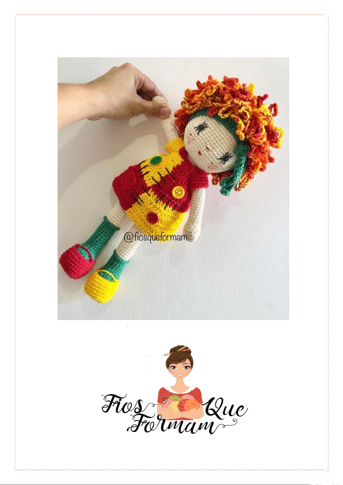 Boneca Emília MATERIAIS *1 par de olhos com travas de segurança de 1cm • fibra acrílica (enchimento) • agulhas de crochê (3mm) • agulhas para tapeçaria e para bordado nariz, cílios e boca ,e acabamentos. Agulha de 15 cm para costura dos braços no corpo . • Linha amigurumi nas cores : Cor branca 8001 Off White 8176 – corpo Vermelho Carmim 3528 Amarelo canário 1289 Verde bandeira 5767 Linha preta anne ou de sua preferencia sendo mais fina que a amigurumi para bordar os detalhes Linha Anne mesclada vermelha/amarelo/laranja 9165 para o cabelo (usar dois fios) Acetato para a sola do sapato. (se não tiver acetato pode usar qualquer plástico ) Bastão de cola quente do mais grosso para sustentação da cabeça.( um bastão mede 30cm, divide ao meio que dar para usar em duas bonecas ) TAMANHO DA BONECA – 35 CM ( O tamanho pode variar de acordo com a tensão do ponto de cada pessoa) ABREVIAÇÕES Pb – ponto baixo Px – ponto baixíssimo p.a. – ponto alto corr. – correntes BLO – pegando na corrente de trás BONECA BRAÇOS sem manga 1) 6p.b. anel magico (06) 2) Aum. Toda a volta (12) 3) 1pb. 1 aum (18) 4 a 6) pb toda volta (18) 7) 3dim seguidas – 12 pb (15) 8) 3 dim. Seguidas – 9 pb (12) 9 a 25) pb toda volta (12) * enche com fibra 26) só diminuição e arremata No primeiro braço depois que arrematar esconde o fio e arremata , no segundo braço deixa um fio longo por volta de 40 cm para costura . SAPATOS – 1 vermelho / 1 amarelo 7 corretes 1) 6pb – gira crocheta do na outra parte da coreente - 1 aum. – 4 pb – 1 aum. (14) 2) 1 aum. – 4pb – 3aum. – 4pb – 2 aum. (20) 3) 2aum. 4pb- 2 aum. – 2pb – 2aum. -4pb – 2aum – 2pb (28) 4) 1aum. – 1pb – 1aum – 6pb – (1aum – 1pb) 2x – (1pb- 1aum) 2x – 6pb-(1aum – 1pb) 2x – 1pb (36) 5) Pb pegando na corrente de trás (36) 6 A 9 ) pb toda volta (36) 10) 12 pb – 6 dim. Seguidas – 12pb. (30) * já pode cortar o acetato e colocar na sola 11) 11pb – 7 correntes – pula 8 pontos,insere a agulha no próximo ponto e faz 11 pb. PERNAS/CORPO/CABEÇA Pernas começa com a cor verde 7 corretes 1) 6pb - 1 aum. – 4 pb – 1 aum. (14) 2) 1 aum. – 4pb – 3aum. – 4pb – 2 aum. (20) 3) 2aum. 4pb- 2 aum. – 2pb – 2aum. -4pb – 2aum – 2pb (28) 4) 1aum. – 1pb – 1aum. – 6pb (1aum – 1pb )2x – (1pb-1aum)2x – 6pb – (1aum- 1pb)2x – 1pb (36) 5) Pb pegando na corrente de trás (36) 6 a 8) pb toda volta (36) 9) 13 pb. – (1dim – 1 pb) 3x – 14 pb (33) 10) 10pb – (1dim – 1pb)4x – 11pb (29) 11) 9pb – 6 dim. Seguidas – 8pb ( 23) 12) 7pb – 5 dim. Seguidas – 6pb (18) 13) 7pb – 2dim seguidas – 7 pb (16) Na primeira perna : 14 a 17 ) pb toda volta (16) Muda para cor da pele pegando na corrente de trás 18 a 37 ) pb em toda volta (16) Na segunda perna : 14 a 23 ) pb em toda a volta (16) Muda para cor da pele pegando na corrente de trás 24 a 37 ) pb em toda a volta (16) Antes de terminar de subir a perna já coloca dentro do sapato. Fazer o acabamento das meias com pb em cada ponto da carreira da troca de cor Juntar as pernas 8pb juntando a primeira perna 4 correntes 8pb juntando a segunda perna Faça 40 pb arrodeando toda a peça pegando na corrente da frente. 38) 19pb – 1 aum. (42) 39 a 43) pb toda volta (42) 44) pb toda volta pegando na corrente de trás (42) 45) 12 pb – 1 dim (39) 46) pb. Toda a volta (39) 47) 11 pb – 1dim (36) 48) pb toda a volta (36) 49) 10pb – 1dim (33) 50 a 58)pb toda a volta (33) 59) 6pb – (1dim – 1pb) 2x – 1 dim – 8pb –(1 dim -1pb)2x – 1dim – 3pb (27) 60) 1pb -1 dim de 3pontos juntos – 4 pb – 1dim – 4 pb – 1dim de 3pontos juntos – 1pb- 1dim- 2pb 1dim - 1pb – 1dim (19) 61) 1 dim de 3 pontos juntos – 7pb – 1dim de 3 pontos juntos – 6pb (15) 62) 1dim – 13 pb (14) 63) pb toda a volta (14) Nesse momento já pode inserir o bastão de cola quente e adicionar enchimento. Continua com a cor pele fazer a CABEÇA 64) aum. Toda volta (28) 65)13 pb – 1 aum. (30) 66) 4pb – 1 aum. (36) 67) 5pb - 1 aum. (42) 68) 6pb – 1 aum. (48) 69) 7pb – 1 aum, (54) 70) 8pb – 1 aum (60) 71 a 82) pb toda volta (60) Inserir os olhos na carreira 75 com 9 pontos entre eles Borda os cílios antes de botar a trava nos olhos 83) 8pb- 1 dim (54) 84) 7pb – 1 dim (48) 85) 6pb – 1 dim. (42) 86) 5pb. 1 dim (36) 87) 4pb – 1 dim. (30) 88) 3pb- 1 dim. (24) 89) 2pb – 1 dim. (18) 90) 1 pb – 1 dim (12) 91) só diminuição e arremata * Fazer nariz alinhavando dois pontos no meio dos olhos , a boca 2 carreiras embaixo do nariz . * bordar as pintinhas das bochechas . Calcinha Na carreira 44 do corpo onde ficou com corrente aparente pegue na parte de trás , no centro das costas e comece a crochetar . 1) Ponta baixo em cada ponto da carreira (42) 2) (9 pb – 1 aum) 4 x – 2pb (46) 3 a 10) pb toda as voltas (46) 11) Divida a peça ao meio e faça 23 pb em cada perna uma de cada vez . Se a sua divisão não der os 23 pontos para cada lado não tem problema , pode continuar normalmente , o importante é dividir por igual para cada perna . 12) (3pb – 1dim) 4x – 3pb (19) em cada perna Depois faça um biquinho 2 correntes – pb no próximo pontos - sobe 2 correntes – pb no próximo ponto .. segue a sequência. Costure os braços . com a agulha de 15 cm insira o fio do segundo braço que você deixo em uma boa quantidade , lembra ? Passe de lado para o outro pegando o outro braço que vai esta no local a ser costurado . Depois bote o fio para trás e arremate , depois esconda o fio e corte . CABELO na cor mesclada BLO – signica pegando na corrente de trás 1) 6pb anel magico (6) 2) Aum. Toda volta (12) BLO 3) 1pb- 1 aum (18) 4) 2pb – 1 aum (24) BLO 5) 3pb – 1 aum. (30) 6) 4pb – 1 aum. (36) BLO 7) 5 pb – 1 aum. (42) 8) 6pb – 1 aum (48) BLO 9) 7 pb – 1 aum. (54) 10) 8 pb – 1 aum. (60) BLO 11) PB (60 ) NORMAL 12) PB (60) BLO 13) PB (60) NORMAL 14) PB (60) BLO 15) PB (60) NORMAL 16) PB (60) BLO 17) PB (60) NORMAL 18) 