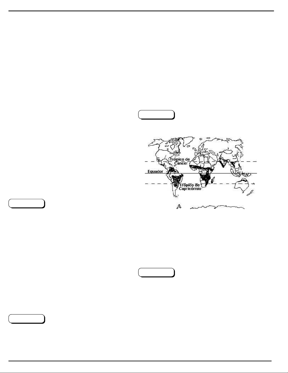 III. Vegetação: Savana Clima: Tropical Localização: No centro do continente africano Ação Antrópica: Queimadas não-cíclicas IV. Vegetação: Vegetação Monçônica Clima: Tropical Localização: Sul da Europa e Norte da África Ação Antrópica: Abertura de clarões para produção de arroz. V. Vegetação: Florestas Equatoriais Clima: Equatorial Localização: Baixas latitudes Ação Antrópica: Desmatamento para a agropecuária e extrativismo vegetal. Pela análise do quadro, conclui-se que a relação correta entre os dados está na alternativa a) I e II b) I e III c) I, II e IV d) II, III e V e) IV e V Questão 512 Leia o texto a seguir com atenção: Trata-se de um dos mais esplendorosos ecossistemas do planeta. Desenvolvendo-se na zona intertropical, próximo ao equador, apresenta elevadas e constantes taxas de umidade, sendo muito rica e variada a sua flora e a sua fauna. O texto trata do domínio natural da: a) Mata Atlântica b) Savana Africana c) Florestas Temperadas d) Floresta Pluvial Amazônica Questão 513 "Nas vastas planícies que dominam a paisagem da Rússia Central, o inverno rigoroso cobre o solo com uma camada de neve que, ao fundir-se na primavera, permite a germinação de uma vegetação herbácea extensiva que atinge seu desenvolvimento máximo no verão chuvoso, quando intensa atividade biológica decompõe o capim morto do ano anterior, originando muito húmus e matéria orgânica, que conferem aos solos uma cor escura e muita fertilidade." A descrição refere-se a) ao sahel. b) às estepes. c) às savanas. d) às tundras. e) à taiga. Questão 514 Considere o mapa apresentado a seguir. s áreas destacadas, no mapa, indicam de modo geral, a presença de vegetação original de a) florestas tropicais. b) florestas caducifólias. c) pradarias. d) estepes. e) savanas. Questão 515 Esta floresta é encontrada sobretudo no hemisfério Norte e se caracteriza pela homogeneidade das poucas espécies ali existentes. As coníferas dominam a paisagem, submetida a invernos longos e rigorosos. A floresta descrita no texto é encontrada principalmente a) nos países escandinavos, Rússia e Canadá. b) nos países escandinavos, Estados Unidos e China. c) no Canadá, China e Irlanda do Norte. d) nos Estados Unidos, Rússia e Noruega. e) na Irlanda do Norte, Noruega e China. 136 ssinale a alternativa que descreve corretamente asQuestão 516 Analise os perfis florestais apresentados a seguir. ssinale a alternativa que identifica os perfis florestais I e II. a) Perfil I: Floresta - tropical úmida; Perfil II: Floresta - temperada; b) Perfil I: Floresta - tropical úmida; Perfil II: Floresta - tropical de folhas caducas; c) Perfil I: Floresta - boreal; Perfil II: Floresta - subtropical; d) Perfil I: Floresta - boreal; Perfil II: Floresta - tropical de folhas caducas; e) Perfil I: Floresta - mediterrânea; Perfil II: Floresta - boreal. Questão 517 Os biomas compreendem grandes unidades da superfície terrestre onde vivem agrupamentos de seres vivos. A figura abaixo destaca, em negro, um dos grandes biomas da superfície terrestre, localizado nas Américas Central e do Sul. principais características desse bioma terrestre. a) Representa florestas equatoriais e tropicais, com temperaturas e umidade elevadas por todo o ano e grande biodiversidade. b) Compreende os desertos de altas latitudes, com temperaturas e umidade elevadas por todo o ano, ocupados por vegetação de arbustos. c) Refere-se às savanas localizadas em altas latitudes, com temperaturas e umidade baixas, onde se adaptam plantas xerófitas e caducifólias. d) Representa florestas temperadas localizadas nas baixas latitudes, com clima de estações pouco definidas e grande biodiversidade. e) Refere-se às tundras em baixas latitudes, com baixas temperaturas e elevada umidade, vegetação de campo e grande biodiversidade. Questão 518 Considerando as características das formações vegetais e as transformações impostas pelo homem, correlacione corretamente as formações vegetais indicadas na primeira coluna com as características descritas na segunda coluna. (I) Floresta temperada (II) Floresta estacional e savanas (III) Vegetação mediterrânea (IV) Florestas pluviais equatoriais tropicais ( ) Formações vegetais em regiões de clima com verões quentes e secos e invernos amenos e chuvosos. As maiores ocorrências estão no sul da Europa, onde foi muito desmatada para o cultivo de oliveiras e videiras. ( ) Formações higrófilas e latifoliadas, extremamente heterogêneas, localizadas nas baixas latitudes, em domínios quentes e úmidos. Nas últimas décadas, o desmatamento provocou grande redução das áreas florestadas. ( ) Formações florestais caducifólias, encontradas em latitudes intermediárias, com precipitação abundante e regularmente distribuída. Devido a práticas agrícolas intensivas e à intensa urbanização, restam poucas áreas representativas. ( ) Formações vegetais adaptadas à alternância de verões chuvosos e invernos secos. Vegetação complexa com estratos arbóreo, arbustivo e herbáceo. Amplamente 137 utilizada para agricultura e pecuária. Marque a alternativa que apresenta a seqüência correta, decorrente do preenchimento da segunda coluna. a) III, I, II e IV b) I, II, III e IV c) III, IV, I e II d) IV, I, II e III e) I, IV, III e II Questão 519 As informações abaixo mostram a correlação existente entre formações vegetais e suas respectivas características. I - Ambiente em que o solo funciona como suporte para a automanutenção da floresta, de tal maneira que, nas áreas desmatadas, o trabalho dos micróbios se acelera e as chuvas removem os produtos finais da decomposição orgânica, deixando um solo laterítico, que não responde bem à agricultura. II - Domínio vegetacional que pode variar de gramíneas a arbustos e árvores; estende-se em ambos os lados da linha do Equador, nos hemisférios Norte e Sul, onde o clima se caracteriza por apresentar u