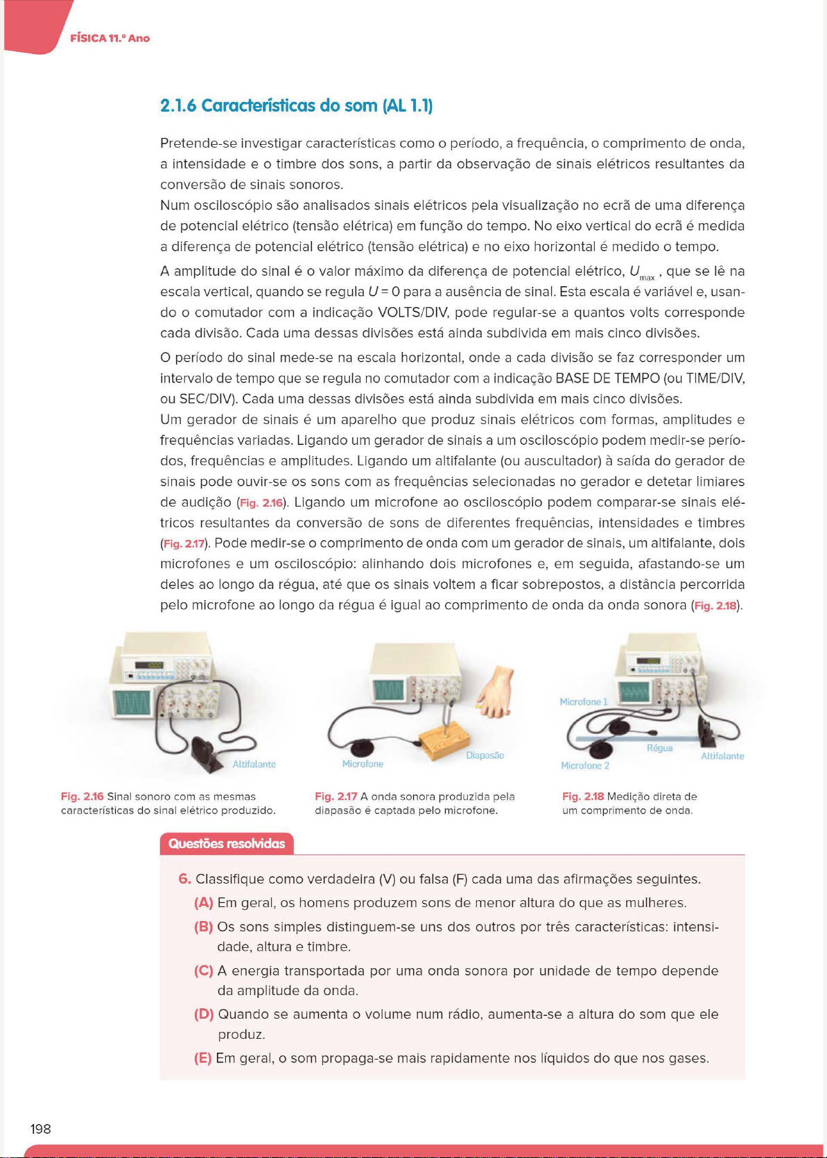 198 FÍSICA 11.0 Ano 2.1.6 Características do som (AL 1.1) Pretende-se investigar características como o período, a frequência , o comprimento de onda, a intensidade e o timbre dos sons, a partir da observação de sinais elétricos resultantes da conversão de sinais sonoros. Num osciloscópio são analisados sinais elétricos pela visualização no ecrã de uma diferença de potencial elétrico (tensão elétrica) em função do tempo. No eixo vertical do ecrã é medida a diferença de potencial elétrico (tensão elétrica) e no eixo horizontal é medido o tempo. A amplitude do sinal é o valor máximo da diferença de potencial elétrico, U max , que se lê na escala vertical, quando se regula U = O para a ausência de sinal. Esta escala é variável e, usan do o comutador com a indicação VOLTS/DIV, pode regular-se a quantos volts corresponde cada divisão. Cada uma dessas divisões está ainda subdivida em mais cinco divisões. O período do sinal mede-se na escala horizontal, onde a cada divisão se faz corresponder um intervalo de tempo que se regula no comutador com a indicação BASE DE TEMPO (ou TIME/DIV, ou SEC/DIV). Cada uma dessas divisões está ainda subdivida em mais cinco divisões. Um gerador de sinais é um aparelho que produz sinais elétricos com formas, amplitudes e frequências variadas. Ligando um gerador de sinais a um osciloscópio podem medir-se perío dos, frequências e amplitudes. Ligando um altifalante (ou auscultador) à saída do gerador de sinais pode ouvir-se os sons com as frequências selecionadas no gerador e detetar limiares de audição (Fig. 2.16). Ligando um microfone ao osciloscópio podem comparar-se sinais elé tricos resultantes da conversão de sons de diferentes frequências, intensidades e timbres (Fig. 2.11). Pode medir-se o comprimento de onda com um gerador de sinais, um altifalante, dois microfones e um osciloscópio: alinhando dois microfones e, em seguida, afastando-se um deles ao longo da régua , até que os sinais voltem a ficar sobrepostos, a distância percorrida pelo microfone ao longo da régua é igual ao comprimento de onda da onda sonora (Fig. 2.1s). J\I rn1,r Fig. 2.16 Sinal sonoro com as mesmas caracte rística s do sinal e létrico produzido. Fig. 2.17 A onda sonora p roduzida pe la d iapasão é captada pelo microfone. Fig. 2.18 Medição d ireta de um comprimento de onda. 6. Classifique como verdadeira (V) ou falsa (F) cada uma das afirmações seguintes. (A) Em geral, os homens produzem sons de menor altura do que as mulheres. (B) Os sons simples distinguem-se uns dos outros por três características: intensi dade, altura e timbre. (C) A energia transportada por uma onda sonora por unidade de tempo depende da amplitude da onda. (D) Quando se aumenta o volume num rádio, aumenta-se a altura do som que ele produz. (E) Em geral, o som propaga-se mais rapidamente nos líquidos do que nos gases.