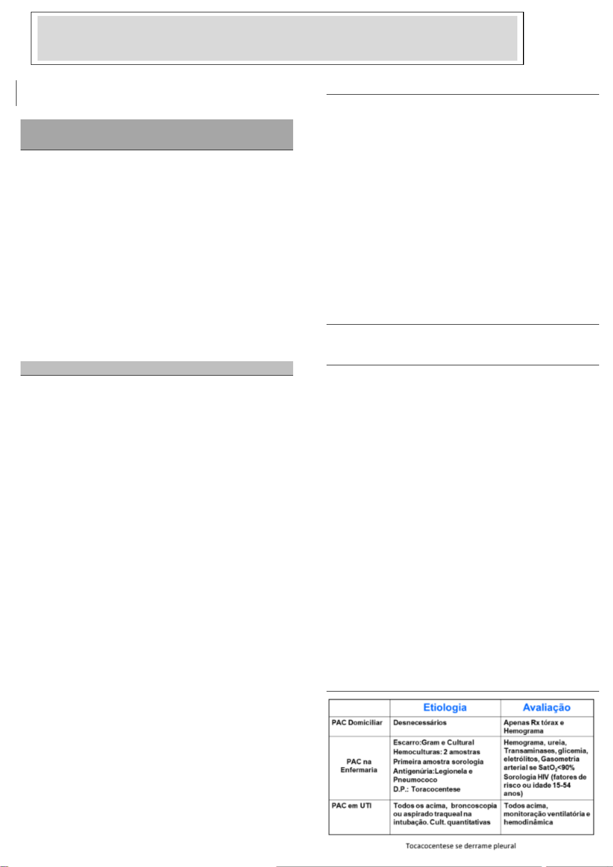 Aula: 13 de junho de 2024 Infecto- Dr. Daniel pneumonias Ainda uma das infecções mais importantes. Processo inflamatório que compromete a via aérea distal, o alvéolo e o interstício- dentro do parênquima pulmonar. Pode ser infecciosa ou não infecciosa (agente químico), as mais comuns são por vírus, bactérias, fungos e parasitas. As não infecciosas podem ser causadas por agentes físicos (broncoaspiração) e químicos (ex: Boate Kiss- gás tóxico). Pode ser classificada segundo o local de aquisição: adquiridas na comunidade ou associadas à cuidados de saúde (não se usa mais o termo hospitalar) Segundo o tipo de hospedeiro: imuno componentes ou imunodeprimido (HV positivo, oncológico, uso de imunossupressores, transplantado de órgão sólido ou de MO. PNEUMONIA ADQUIRIDA NA COMUNIDADE: PAC Patógeno chega ao pulmão por - microaspiração da orofaringe (bactérias que colonizam mucosa nasal ou oral), inalação (pp/ micobacterium), disseminação hematogênica de um foco extrapulmonar ou extensão direta do mediastino e espaço subfrênico.- existem n causas. Fases anatomo-patológicas: Congestão: presença de exsudato inflamatório e bactéria; Hepatização vermelha: presença de eritrócitos no exsudato intra-alveolar (se não tratada evolui); Hepatização cinzenta: se não tratada, similaridade radiológica com o fígado e percussão maciça- predominam os neutrófilos, deposição abundante de fibrina e desaparecimento das bactérias. Resolução: macrófagos predominam e debris celulares são eliminados. É essencial para o manejo → diagnóstico correto, reconhecer os fatores de risco, avaliar a gravidade da PNM, decidir o local de tratamento (ambulatório ou hospitalar) e escolher o antibiótico (conforme sítio de ação, pp/ patógenos que causam nesses sítios). Trio ternura: leigionela, clamidófilos, haemophilus Pneumococo mais comum; Micoplasma. *Dentro do HU, para PNM hospitalar, não precisa cobrir gram- positivo. Quando pensar em pneumonia? Quando pensar em pneumonia: presença de sintomas de doença aguda do trato respiratório inferior - tosse e um ou mais dos seguintes (expectoração, falta de ar, dor torácica, manifestações sistêmicas - confusão, cefaleia, sudorese, calafrios, mialgias, temperatura> 37,8C), achados focais no exame físico do tórax (pode ser desde estertores crepitantes até uma síndrome de consolidação); corroborados pela presença de uma opacidade nova, usualmente vista a radiografia do tórax. *Idoso com alteração do nível de consciência: desidratação, infecção e acidente vascular cerebral Achados radiológicos: consolidação pulmonar, hepatização (pedaço do pulmão acometido fica com o mesmo aspecto do fígado- esbranquiçado). Mortalidade por PAC Alta tx de mortalidade nos extremos de idade. Exames de imagem na PAC A. Paciente com PAC de baixo risco, tratados no ambulatório devem realizar apenas a radiografia de tórax e o hemograma como exame subsidiário; B. O padrão radiológico não pode ser usado para predizer o agente causal, ou mesmo separar grupos de agentes; C. TC de tórax deve ser realizada quando houver dúvidas sobre a presença do infiltrado pneumônico, para a detecção de complicações e na suspeita de neoplasia. D. Derrames pleurais significativos (5 cm ou mais, identificado na projeção lateral em ortostatismo) devem ser puncionados; E. Radiografia de tórax deve ser repetida após seis semanas do início dos sintomas em fumantes com mais de 50 anos e na persistência dos sintomas ou achados anormais no exame físico (o exame de imagem leva 4 a 6 semanas para voltar ao normal - não ficar repetindo sem indicação);- pedir para avaliar se o paciente está tendo ou melhora clínica, mas não fazer seriadamente. Se for jovem, nem precisa. F. A saturação periférica de O2 (SPO2) deve ser observada de rotina, antes do uso eventual de oxigênio; G. A presença de hipoxemia indica o uso de O2 suplementar e admissão hospitalar; Exames laboratoriais: doenças bacterianas Criança, por exemplo, pode apresentar uma dor subcostal e não retroesternal. Patógenos mais comuns na PAC: Atípica → Mycoplasma pneumoniae, Chlamydia pneumoniae e Legionella pneumophila (histórico de viagem) - pensar nos extremos de idade. Critério de gravidade CRB- 65 CRB- CRP circulação, respiração e pressão arterial 65 faz referência a idade. Cada parâmetro pontua 1 ponto. Pedir ureia, pois se elevada também vai pontuar aqui- significa que está hipermetabolizando. Fatores de risco para patógenos específicos: Não é porque tem pseudomonas que é uma infecção hospitalar, pois esse agente está presente no ambiente como um todo. Tratamento da PAC: Seleção do esquema terapêutico inicial para pacientes com PAC considera os microrganismos de maior prevalência; Não há evidência definitiva que comprove a superioridade de esquemas com cobertura para os patógenos atípicos realizada de forma sistêmica, com exceção de casos de pneumonias por Legionella sp. Paciente jovem → sem necessidade da cobertura de atípicos; Para escolher o antibiótico → qual a patologia → qual o germe mais comum que causa a patologia (PAC - pneumococo X PAH - de acordo com a microbiota do ambiente hospitalar) → qual antibiótico cobre esse germe → boa penetração no sítio de infecção; PAC ambulatorial: considera alta proporção de agentes sensíveis a beta lactâmicos no Brasil (falta de dados definitivos quanto a cobertura de bactérias atípicas em PAC não grave); Indivíduos adultos com PAC de leve a moderada gravidade podem ser efetivamente tratados com antibióticos ministrados por um período igual ou inferior a sete dias; Fluorquinolonas, pp/, se houver alguma fatores de risco para pseudomonas. Paciente previamente hígido com pneumonia= investigar HIV. Pseudomonas- apenas cefalosporina a partir da 4ª geração que pega. Beta-lactâmicos que pegam pseudomonas: cefalosporina de 3 e 4° geração