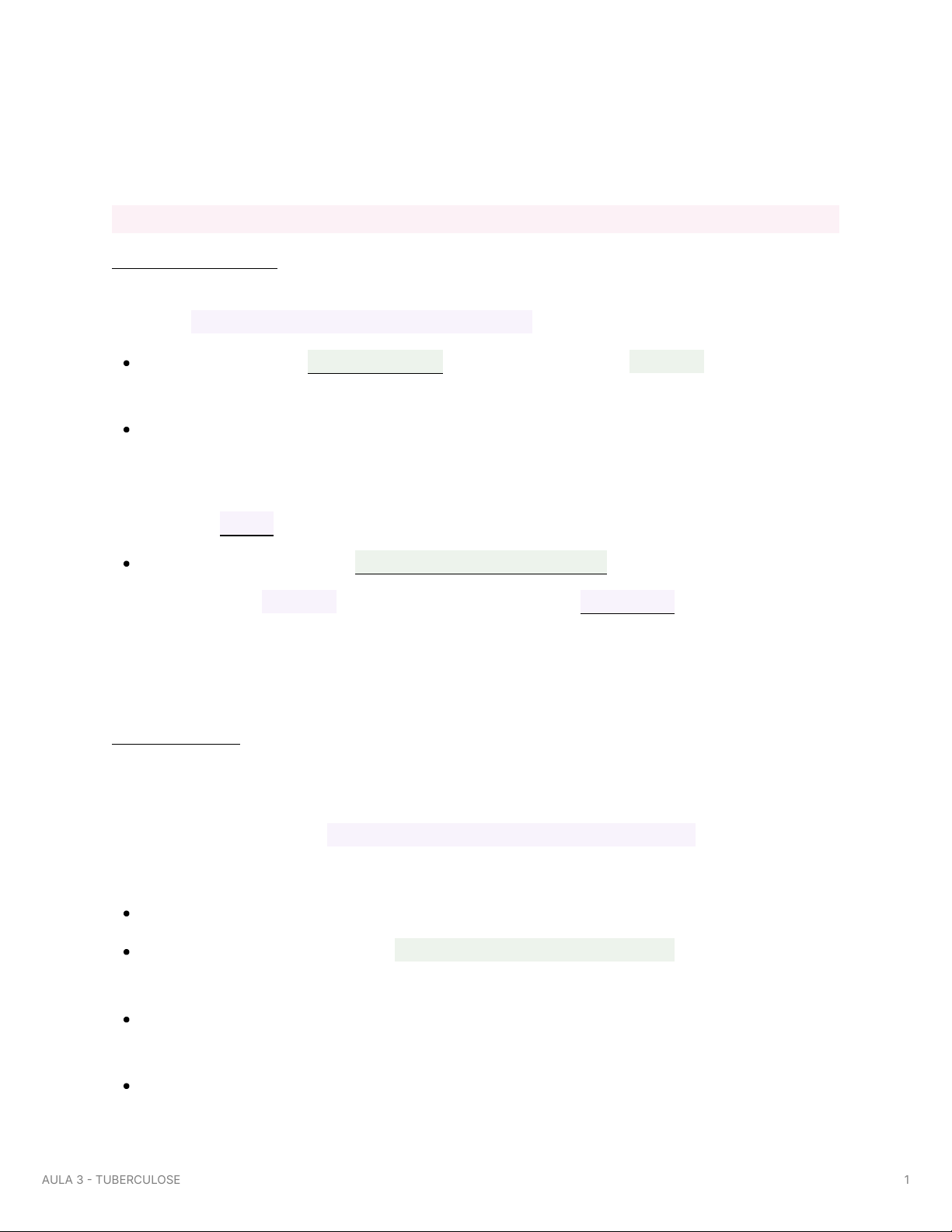 AULA 3 - TUBERCULOSE CONCEITOS INICIAIS Agente infeccioso → causada por qualquer uma das sete espécies de micobactérias que fazem parte do complexo Mycobacterium tuberculosis mais importantes: M. tuberculosis (bacilo de Koch) e o M. bovis (é a espécie utilizada na BCG também incluem: M. africanum, M. canetti, M. microti, M. pinnipedi e M. caprae → são resistentes a diversos antibióticos e também aos álcool-ácidos (etanol + ác clorídrico) - BAAR ficam avermelhados na coloração de Ziehl-Neelsen → dependem de oxigênio para seu metabolismo - as cavidades apresentam as condições ideais para essa proliferação → além da tuberculose, causam hanseníase e infecções por Micobactéria de Crescimento Rápido MCR Epidemiologia → é uma das dez principais causas de óbito no mundo e a principal causa de morte por um único agente infeccioso → doença grave, porém curável em praticamente 100% dos casos → os tratamentos são eficazes, mas o tempo de tratamento é muito longo reduz fontes de infecção e o impacto da doença na comunidade avanço no tratamento pelas pesquisas relacionadas ao HIV - é o que mais mata a partir do momento que a doença é tratada, a carga bacteriana no ambiente é reduzida redução da pressão seletiva - mecanismos de resistência AULA 3 TUBERCULOSE 1 15 dias de medicação - se torna paucibacilífero - não transmite mais → para que ocorra a transmissão é necessário o agente infeccioso modo de transmissão - através de aerossóis ou vertical (rara) suscetibilidade - cerca de 5% das pessoas que tiveram contato com o bacilo que vão desenvolver a doença → acomete principalmente países em desenvolvimento → demora para o diagnóstico - na suspeita de tuberculose, não use quinolonas As quinolonas são antibióticos frequentemente usados para tratamento de pneumonia, podem também ser usados para tuberculose. a pneumonia bacteriana é um diagnóstico diferencial da tuberculose, logo, se você prescrever levofloxacino para um paciente que na verdade tem tuberculose, há risco dele ser parcialmente tratado e até de desenvolver uma tuberculose resistente → caso novo = doente que nunca foi tratado ou que usou drogas antituberculínicas por menos de 30 dias - não gera imunidade duradoura → Doença de Notificação compulsória (qualquer profissional da saúde habilitado pode fazer) PATOGENIA Transmissão → pela via aérea através da geração de aerossóis - falar, tossir, espirrar também chamadas de gotículas de Flügge pode se manter em suspensão por muitas horas recomenda-se manter o ambiente arejado, com circulação de ar e com entrada de luz solar (o bacilo é sensível à luz natural) só são transmissíveis as formas laríngea e pulmonar → transmissão vertical (raro) AULA 3 TUBERCULOSE 2 mães com tuberculose, mesmo não bacilíferas, podem transmitir a doença para o neonato por via placentária ou através do líquido amniótico contaminado, que pode ser aspirado/ingerido pelo neonato quem mais transmite a doença são aqueles com a forma pulmonar cavitária e enquanto a baciloscopia estiver positiva Patogênese → após o contato com o bacilo, existem três desfechos diferentes: eliminação imediata da micobactéria desenvolvimento da doença primária controle da infecção com latência do bacilo no organismo � doença primária pessoa doente (bacifílero) elimina os aerossóis no ambiente → pessoa suscetível inala essa partícula, que chega até os alvéolos o sistema imune inato tenta combater a infecção → eliminação ou profileração os bacilos proliferam dentro dos macrófagos, que podem migrar para outros tecidos (TB extrapulmonar) atraem outros macrófagos - granuloma (nódulo de Ghon ou foco primário) replicação bacteriana descontrolada - invasão de linfáticos e linfonodos - linfonodomegalia hilar com o passar dos anos, esse granuloma tende a calcificar - sequela o bacilo profilera até que a imunidade celular se desenvolva 2 a 10 semanas em 10% dos infectados, a imunidade celular não segura a infecção - destruição progressiva do parênquima pulmonar - necrose caseosa OU disseminação hematogênica AULA 3 TUBERCULOSE 3 🦠 OBS.: complexo de Ranke = linfonodomegalia hilar + nódulo de Ghon � reativação falha na imunidade celular - as bactérias dentro do granuloma voltam a se replicar Linfonodomegalia mediastinal (seta) e consolidação nos lobos médio e inferior direito (cabeça de seta) em um paciente de 6 meses de idade com tuberculose primária. Complexo de Ghon, caracterizado por lesão no parênquima pulmonar (seta), associado a linfonodomegalia hilar (cabeça de seta) Linfonodomegalia mediastinal AULA 3 TUBERCULOSE 4 🫁 fatores que aumentam o risco de reativação Infecção pelo HIV e AIDS; Diabetes mellitus; Desnutrição; Uso de imunossupressores como corticoides e inibidores do TNF- alfa; Pessoas vivendo em situações de rua e aquelas privadas de liberdade; Indígenas; Tabagismo � infecção latente pelo M. tuberculosis ILTB paciente entra em contato com o bacilo, mas não desenvolve a doença ocorre em 90% dos casos é identificada através de exames de rastreio de contato com a micobactéria (ex.: prova tuberculínica PPD QUADRO CLÍNICO Tuberculose pulmonar → é o órgão mais acometido pela tuberculose � TB pulmonar primária AULA 3 TUBERCULOSE 5 é mais frequente na infância, mas pode acometer adultos febre, sudorese noturna e inapetência a presença de sintomas respiratórios não é regra a febre é o sintoma mais comum Rx de tórax geralmente normal, mas se estiver alterada - complexo de Ranke � OBS.: crianças 10 anos são abacilíferas! � TB pulmonar secundária o principal sintoma é tosse seca ou produtiva, 2 a 3 semanas, com ou sem hemoptise febre vespertina sudorese noturna perda ponderal RX com imagens sugestivas lobo superior mais acometido (maior concentração de oxigênio) infiltrado lobar cavitações AULA 3 TUBERCULOSE 6 T