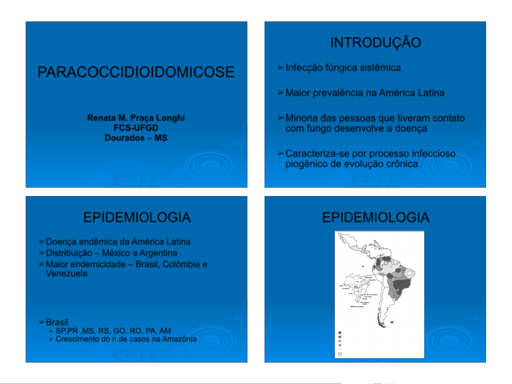 PARACOCCIDIOIDOMICOSE Renata M. Praça Longhi FCS-UFGD Dourados – MS INTRODUÇÃO ➢ Infecção fúngica sistêmica ➢Maior prevalência na América Latina ➢Minoria das pessoas que tiveram contato com fungo desenvolve a doença ➢Caracteriza-se por processo infeccioso piogênico de evolução crônica EPIDEMIOLOGIA ➢Doença endêmica da América Latina ➢Distribuição – México a Argentina ➢Maior endemicidade – Brasil, Colômbia e Venezuela Incidência em zonas endêmicas varie de 3 a 4 novos casos/ milhão até 1 a 3 novos casos por 100 mil habitantes ao ano. ➢Brasil ● SP,PR ,MS, RS, GO, RO, PA, AM ● Crescimento do n de casos na Amazônia EPIDEMIOLOGIA 4 Epidemiol. Serv. Saude, Brasília, 27( núm. esp.):e0500001, 2018 Consenso em Paracoccidiodomicose há casos desta micose associados à infecção pelo HIV, a neoplasias e, mais raramente, a transplantes de órgãos e ao uso de imunobiológicos.17,18,19,20 Incidência, prevalência e mortalidade Uma vez que a PCM não se constitui em doença de notificação compulsória, não temos dados precisos sobre sua incidência no Brasil. Os cálculos de prevalên- cia, incidência e morbidade da micose baseiam-se em relatos de inquéritos epidemiológicos, séries de casos e dados de hospitalização e mortalidade.21 Com base na experiência de serviços de referência no atendimento de pacientes com PCM, acredita-se que sua incidência em zonas endêmicas varie de 3 a 4 novos casos/milhão até 1 a 3 novos casos por 100 mil habitantes ao ano. Cerca de 80% dos casos são registrados, no Brasil, particularmente nos estados de São Paulo, Paraná, Rio Grande do Sul, Goiás e Rondônia (Figura 3).2 Na América Latina, casos são mais frequentemente registrados na Argentina, na Colômbia, na Venezuela, no Equador e no Paraguai. Estimativas de incidência anual no Brasil variam de 0,71 caso a 3,70 casos por 100 mil hab.,21 com registros recentes de incidência de 9,4 casos por 100 mil hab. em Rondônia – sendo que, em dois mu- nicípios, há incidências próximas de 40 casos por 100 mil hab.14 Informações registradas no Ministério da Saúde atestam que 3.181 casos de óbito por PCM foram registrados no Brasil entre 1980 e 1995, resultando em taxa de mortalidade por PCM de 1,45 caso por milhão de habitantes (2,59 para a região Sul; 2,35 para o Centro Oeste; 1,81 para o Sudeste; 1,08 para o Norte; e 0,20 para o Nordeste).22 Nesse estudo, os autores apontaram a PCM como a oitava causa de mortalidade por doença infecciosa predominantemente crônica entre as doenças infecciosas e parasitárias – taxa inclusive maior que a da mortalidade por leishmanioses, e a mais alta entre as micoses sistêmicas. Dados recentes de 13.683 pacien- tes hospitalizados, de janeiro de 1998 a dezembro de 2006, com micoses sistêmicas,23 apontam a PCM como a responsável pelo maior número de internações (49%) entre essas micoses, destacando-se as taxas de hospi- talização nas regiões Norte e Centro-Oeste, sem grande diferença na mortalidade pela micose em pacientes hospitalizados (Figura 3). Fonte: Martinez R, 2017.21 Figura 3 – Áreas geográficas da endemicidade da paracoccidioidomicose na América Latina Primeiras áreas reconhecidas com alta endemicidade Áreas com alta endemicidade a partir das últimas décadas do século XX Áreas com evidência recente de aumento da endemicidade Áreas com moderada endemicidade Áreas com baixa endemicidade Nenhum ou raros casos de paracoccidioidomicose relatados nestes países ou regiões EPIDEMIOLOGIA ETIOLOGIA ➢ Paracoccidioides brasiliensis e P. lutzii ➢ Fungo assexuado dimórfico ➢ Forma de micélio filamentoso ● Saprofítica no maio ambiente ● Desenvolvimento entre 19-28ºC ➢ Forma leveduriforme ● Presente no homem ● Crescimento com temperatura 37ºC ● Divisão por brotamento múltiplo ● Crescimento em cultura – 2 a 4 semanas ETIOLOGIA EPIDEMIOLOGIA ➢Aquisição do fungo – via inalatória ➢Exposição acidental ao microambiente do fungo ➢ Infecção ocorre desde infância em áreas endêmicas ➢Maioria não desenvolve doença ➢Não há transmissão interhumana EPIDEMIOLOGIA ➢Microambiente saprofítico do fungo ● Solo ● Cresce sobre detritos vegetais e umidade ● Clima temperado-quente – verão chuvoso e inverno seco ● Floresta tropical, subtropical e transição para cerrado ● Cultivo de café EPIDEMIOLOGIA ➢Reservatórios animais ➢ Isolado em vísceras de macacos, tatus, cães ➢Tatu ● Infectados com sinais de doença sistêmica ● Hospedeiro acidental? ● Contribui para preservação e disseminação fungo na natureza EPIDEMIOLOGIA ➢Desenvolvimento de doença ● Atinge todas as faixas etárias ● Até a puberdade ♀/♂ mesma proporção ● Adultos 80% ♂ ● Estrógeno fator protetor – impede transformação em levedura ● Doença associada ao trabalho rural, com solo e vegetais 3 Epidemiol. Serv. Saude, Brasília, 27( núm. esp.):e0500001, 2018 Maria Aparecida Shikanai-Yasuda e colaboradores pode ser facilmente cultivado a partir de seus órgãos internos (baço, fígado e linfonodos), indicando assim um processo sistêmico. P. lutzii ainda não foi isolado de tatus (Figura 2). Surtos epidêmicos de PCM nunca foram observados, e a recuperação fúngica (cultivo) diretamente da sua forma saprofítica ambiental mostrou ser particular- mente difícil de se obter sem reprodutibilidade. Em função desta dificuldade, considera-se “reservaria” a região onde se adquire a doença. Métodos sensíveis de biologia molecular, no entanto, indicam a presença frequente do fungo em solos e aerossóis, particular- mente quando provenientes de tocas de animais ou de locais com teores de umidade média a alta, protegidos por coberturas vegetais.13 Mudanças nas características demográficas e na dis- tribuição geográfica têm sido observadas nas últimas décadas. Possivelmente, a urbanização, a aplicação de métodos diag