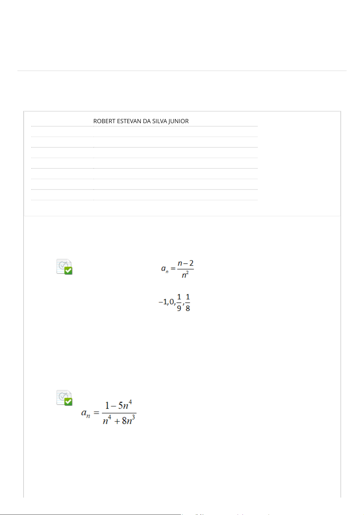 Revisar envio do teste: QUESTIONÁRIO UNIDADE I ANALILSE MATEMATICA D56B_13701_R_20251 CONTEÚDO Usuário ROBERT ESTEVAN DA SILVA JUNIOR Curso ANALILSE MATEMATICA Teste QUESTIONÁRIO UNIDADE I Iniciado 18/03/25 14:19 Enviado 18/03/25 14:34 Status Completada Resultado da tentativa 5 em 5 pontos Tempo decorrido 15 minutos Resultados exibidos Respostas enviadas, Perguntas respondidas incorretamente Pergunta 1 Resposta Selecionada: a. Para sequência (an) que segue , os valores dos quatro primeiros termos são: Pergunta 2 Resposta Selecionada: b. Sobre a sequência dada, podemos afirmar que: Converge para -5. UNIP BIBLIOTECAS MURAL DO ALUNOCONTEÚDOS ACADÊMICOS 0,5 em 0,5 pontos 0,5 em 0,5 pontos http://company.blackboard.com/ https://ava.ead.unip.br/webapps/blackboard/execute/courseMain?course_id=_390727_1 https://ava.ead.unip.br/webapps/blackboard/content/listContent.jsp?course_id=_390727_1&content_id=_4385303_1&mode=reset https://ava.ead.unip.br/webapps/portal/execute/tabs/tabAction?tab_tab_group_id=_49_1 https://ava.ead.unip.br/webapps/portal/execute/tabs/tabAction?tab_tab_group_id=_27_1 https://ava.ead.unip.br/webapps/portal/execute/tabs/tabAction?tab_tab_group_id=_47_1 https://ava.ead.unip.br/webapps/portal/execute/tabs/tabAction?tab_tab_group_id=_25_1 https://ava.ead.unip.br/webapps/login/?action=logout Pergunta 3 Resposta Selecionada: a. Analise os itens e assinale a alternativa correta: I - A série é uma série divergente pelo teste da razão. II - A série é uma série convergente pelo teste da raiz. III - A série é uma série divergente pelo teste da comparação. IV - A série é uma série geométrica convergente com razão 4/3. Apenas a alternativa II está correta. Pergunta 4 Resposta Selecionada: e. Sobre a série dada, podemos afirmar que: É uma p – série convergente. Pergunta 5 Resposta Selecionada: d. Usando o teste de comparação, podemos afirmar que a série é: Divergente. Pergunta 6 0,5 em 0,5 pontos 0,5 em 0,5 pontos 0,5 em 0,5 pontos 0,5 em 0,5 pontos Resposta Selecionada: a. Para a série , podemos afirmar que: É divergente. Pergunta 7 Resposta Selecionada: a. Analise os itens e assinale a alternativa correta: I - Toda sequência convergente é limitada. II - Toda sequência monótona e limitada é divergente. III – Se , podemos afirmar que a série é convergente. IV - Se uma série infinita for absolutamente convergente, então ela é divergente. Apenas a alternativa I está correta. Pergunta 8 Resposta Selecionada: b. Podemos afirmar que a série é: Uma série alternada convergente. Pergunta 9 Resposta Selecionada: d. Em qual das séries o teste do n-ésimo termo pode ser aplicado com sucesso garantindo sua divergência? Pergunta 10 0,5 em 0,5 pontos 0,5 em 0,5 pontos 0,5 em 0,5 pontos 0,5 em 0,5 pontos Terça-feira, 18 de Março de 2025 14h34min42s GMT-03:00 Resposta Selecionada: a. Sobre a série dada, podemos afirmar que: Diverge. ← OK