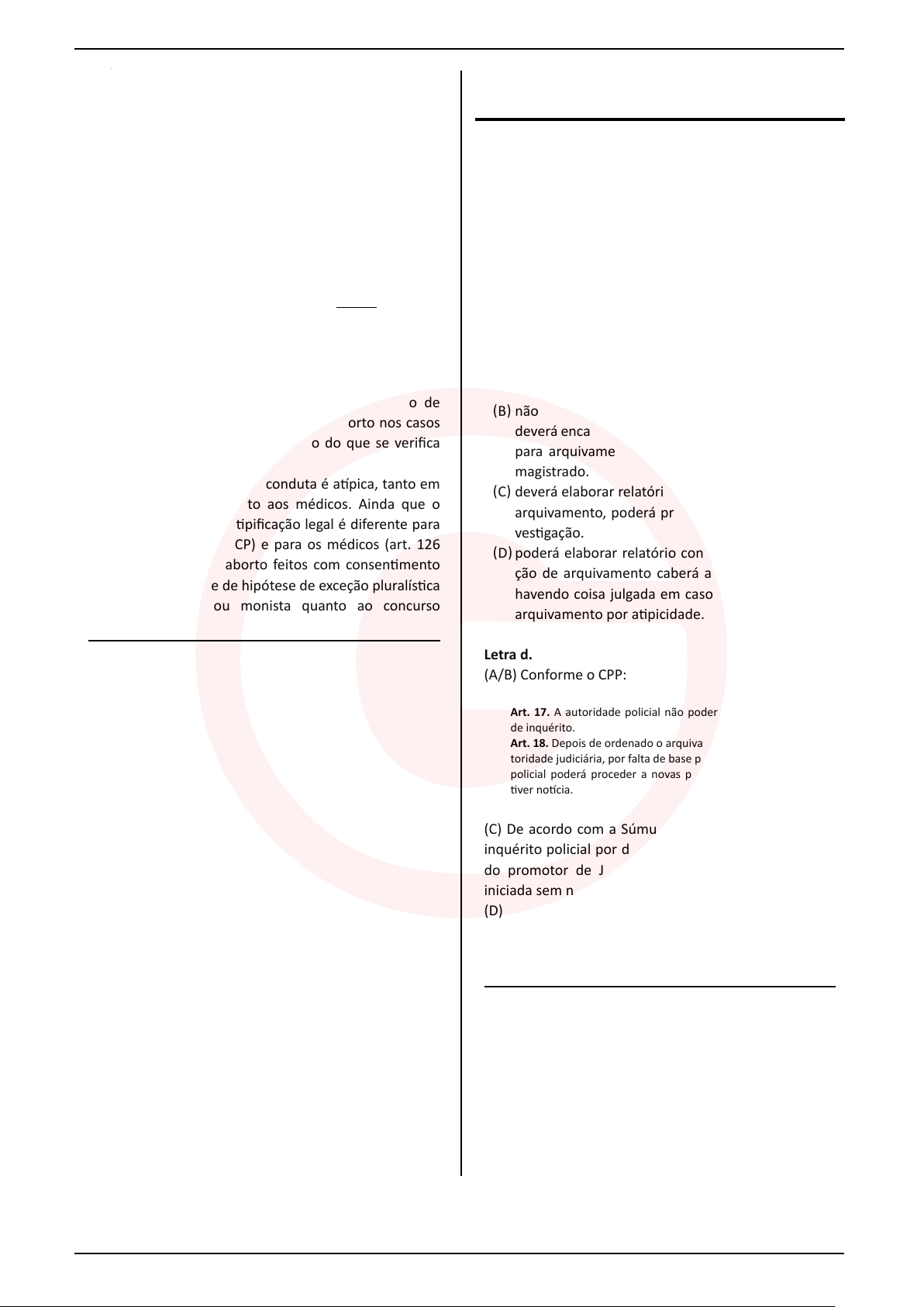 Letra a. (A) Certo. Segundo decidiu o STF no julgamento da ADPF 54, não há crime de aborto nos casos de feto anencéfalo, o qual, por malformação congênita, não possui uma parte do sistema nervoso central, faltando- lhe os hemisférios cerebrais. Segundo restou decidido, para interromper a gravidez de feto anencéfalo, não é necessária decisão judicial prévia que a autorize. Basta o diagnóstico de anencefalia. Também não é necessário que a gestante esteja correndo risco de morte. (B) Errado. O Plenário do STF, em decisão com eficácia erga omnes e efeito vinculante, decidiu que é atípica a conduta da interrupção da gravidez de um feto anencéfalo. Não há, portanto, crime. Assim, por criação jurisprudencial, ampliou-se a possibilidade de realização do aborto para além das hipóteses descritas no Código Penal. (C) Errado. No Brasil, não se adota nenhum tipo de critério temporal para a realização do aborto nos casos legalmente permitidos, ao contrário do que se verifica em outros países. (D) Errado. Não há crime, a conduta é atípica, tanto em relação à gestante quanto aos médicos. Ainda que o fato fosse criminoso, a tipificação legal é diferente para a grávida (art. 124 do CP) e para os médicos (art. 126 do CP) nos casos de aborto feitos com consentimento da gestante. Trata-se de hipótese de exceção pluralística à teoria unitária ou monista quanto ao concurso de agentes. DIREITO PROCESSUAL PENAL LORENA OCAMPOS 64 Um Delegado de Polícia, ao tomar conhecimento de um suposto crime de ação penal pública incondicio- nada, determina, de ofício, a instauração de inquérito policial. Após adotar diligência, verifica que a conduta investigada era atípica. O indiciado, então, pretende o arquivamento do inquérito e procura você, como advo- gado, para esclarecimentos, informando que deseja que o inquérito seja imediatamente arquivado. Você deverá esclarecer que a autoridade policial: (A) deverá arquivar imediatamente o inquérito, fazendo a decisão de arquivamento por atipicidade de coisa julgada material. (B) não poderá arquivar imediatamente o inquérito, mas deverá encaminhar relatório final ao Poder Judiciário para arquivamento direto e imediato por parte do magistrado. (C) deverá elaborar relatório final de inquérito e, após o arquivamento, poderá proceder a novos atos de in- vestigação. (D) poderá elaborar relatório conclusivo, mas a promo- ção de arquivamento caberá ao Ministério Público, havendo coisa julgada em caso de homologação do arquivamento por atipicidade. Letra d. (A/B) Conforme o CPP: Art. 17. A autoridade policial não poderá mandar arquivar autos de inquérito. Art. 18. Depois de ordenado o arquivamento do inquérito pela au- toridade judiciária, por falta de base para a denúncia, a autoridade policial poderá proceder a novas pesquisas, se de outras provas tiver notícia. (C) De acordo com a Súmula 524 do STF: “Arquivado o inquérito policial por despacho do juiz, a requerimento do promotor de Justiça, não pode a ação penal ser iniciada sem novas provas.” (D) Conforme doutrina majoritária, o arquivamento pela atipicidade produz coisa julgada material, impedindo o desarquivamento do inquérito policial e rediscussão do caso.