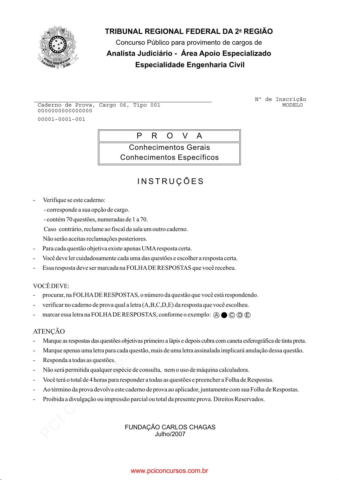 pcimarkpci MDAwMDowMDAwOjAwMDA6MDAwMDowMDAwOmZmZmY6ZDEwZTo0NjYz:V2VkLCAxOSBNYXIgMjAyNSAwMjo1MjoxOSAtMDMwMA== www.pciconcursos.com.br I N S T R U Ç Õ E S A C D E - Verifique se este caderno: - corresponde a sua opção de cargo. - contém 70 questões, numeradas de 1 a 70. Caso contrário, reclame ao fiscal da sala um outro caderno. Não serão aceitas reclamações posteriores. - Para cada questão objetiva existe apenas UMAresposta certa. - Você deve ler cuidadosamente cada uma das questões e escolher a resposta certa. - Essa resposta deve ser marcada na FOLHADE RESPOSTAS que você recebeu. VOCÊ DEVE: - procurar, na FOLHADE RESPOSTAS, o número da questão que você está respondendo. - verificar no caderno de prova qual a letra (A,B,C,D,E) da resposta que você escolheu. - marcar essa letra na FOLHADE RESPOSTAS, conforme o exemplo: - Marque as respostas das questões objetivas primeiro a lápis e depois cubra com caneta esferográfica de tinta preta. - Marque apenas uma letra para cada questão, mais de uma letra assinalada implicará anulação dessa questão. - Responda a todas as questões. - Não será permitida qualquer espécie de consulta, nem o uso de máquina calculadora. - Você terá o total de 4 horas para responder a todas as questões e preencher a Folha de Respostas. - Ao término da prova devolva este caderno de prova ao aplicador, juntamente com sua Folha de Respostas. - Proibida a divulgação ou impressão parcial ou total da presente prova. Direitos Reservados. ATENÇÃO Conhecimentos Gerais Conhecimentos Específicos P R O V A FUNDAÇÃO CARLOS CHAGAS Julho/2007 TRIBUNAL REGIONAL FEDERAL DA 2 REGIÃO Analista Judiciário - Especialidade Engenharia Civil a Concurso Público para provimento de cargos de Área Apoio Especializado ____________________________________________________ Caderno de Prova, Cargo 06, Tipo 001 0000000000000000 00001−0001−001 Nº de Inscrição MODELO www.pciconcursos.com.br pcimarkpci MDAwMDowMDAwOjAwMDA6MDAwMDowMDAwOmZmZmY6ZDEwZTo0NjYz:V2VkLCAxOSBNYXIgMjAyNSAwMjo1MjoxOSAtMDMwMA== www.pciconcursos.com.br 2 TRF2R-Conhecimentos Gerais11 CONHECIMENTOS GERAIS Instruções: As questões de números 1 a 10 referem-se ao texto apresentado abaixo. 1 5 10 15 20 25 Os princípios éticos são normas de comportamento social, e não simples ideais de vida, ou premissas doutrinárias. Como normas de comportamento humano, os princípios éticos distinguem-se nitidamente não só das regras do raciocínio matemático, mas também das leis naturais ou biológicas. Ao contrário do que sustentaram grandes pensadores, como Hobbes, Leibniz e Espinosa, a vida ética não pode ser interpretada segundo o método geométrico (ordine geometrico demonstrata). As normas éticas tampouco podem ser reduzidas a enunciados científicos, fundados na observação e na experimentação, como se se tratasse de leis zoológicas. Durante boa parte do século XIX, alguns pensadores, impressionados pelo extraordinário progresso alcançado no campo das ciências exatas, com a produção de certeza e previsibilidade no conhecimento dos dados da natureza, sucumbiram à tentação de explicar a vida humana segundo parâmetros deterministas. Ora, por mais que se queira eliminar a liberdade do mundo humano, ela teima em aparecer, desafiando constantemente as previsões “científicas”. Somos o único ser que combina, em sua vida social, a necessidade física e biológica com os deveres éticos, a sujeição aos fatos naturais com a autonomia de ação. Como é passível de comprovação, em toda sociedade o ideário e as estruturas de poder de- senvolvem-se dentro dos limites postos por determinados fatores básicos, como o patrimônio genético, o meio geográfico ou o estado da técnica. Vencer tais limitações tem sido um desafio constante lançado à espécie humana. Mas nem por isso devemos tomar esses fatores condi- cionantes da vida social como seus princípios diretivos. (Adaptado de COMPARATO, Fábio Konder. Ética: direito, moral e religião no mundo moderno. São Paulo: Companhia das Letras, 2006, p. 494-5) OBS.: Hobbes (1588-1679), Leibniz (1646-1717), Espinosa (1632- 1677) − filósofos ordine geometrico demonstrata −−−− em tradução livre, "demonstrado segundo a ordem geométrica" 1. No primeiro parágrafo, o autor (A) atribui à filosofia a responsabilidade pelo fato de a ética ser entendida sob perspectivas díspares, entre elas, a da geometria. (B) faz um inventário de como a ética foi concebida no século XIX, para, ao fim, referendar o ponto de vista oferecido pelo determinismo. (C) argumenta em defesa da imutabilidade das normas éticas, por considerá-las produtoras de sistema mais coeso e coerente que muitos outros, o matemático, por exemplo. (D) tematiza a variabilidade da compreensão da ética em certos filósofos, e alude a sua própria idéia sobre o assunto, erigida em consonância com as convergências entre ele e esses pensadores. (E) apresenta sua compreensão da ética e, para mais bem caracterizá-la, vale-se prioritamente de argu- mentos embasados no contraste. 2. No contexto, a frase do primeiro parágrafo que expressa uma causa é: (A) (linhas 13 a 16) impressionados pelo extraordinário progresso alcançado no campo das ciências exatas, com a produção de certeza e previsibilidade no conhecimento dos dados da natureza. (B) (linhas 3 a 6) os princípios éticos distinguem-se nitidamente não só das regras do raciocínio matemático, mas também das leis naturais ou biológicas. (C) (linhas 7 a 9) a vida ética não pode ser interpretada segundo o método geométrico (ordine geometrico demonstrata). (D) (linhas 9 a 11) As normas éticas tampouco podem ser reduzidas a enunciados científicos, fundados na observação e na experimentação. (E) (linha 2 e 3) e não simples ideais de vida, ou premissas doutrinárias. _________________________________________________________ 3. É correto afirmar: (A) (linha 12) século XIX, 