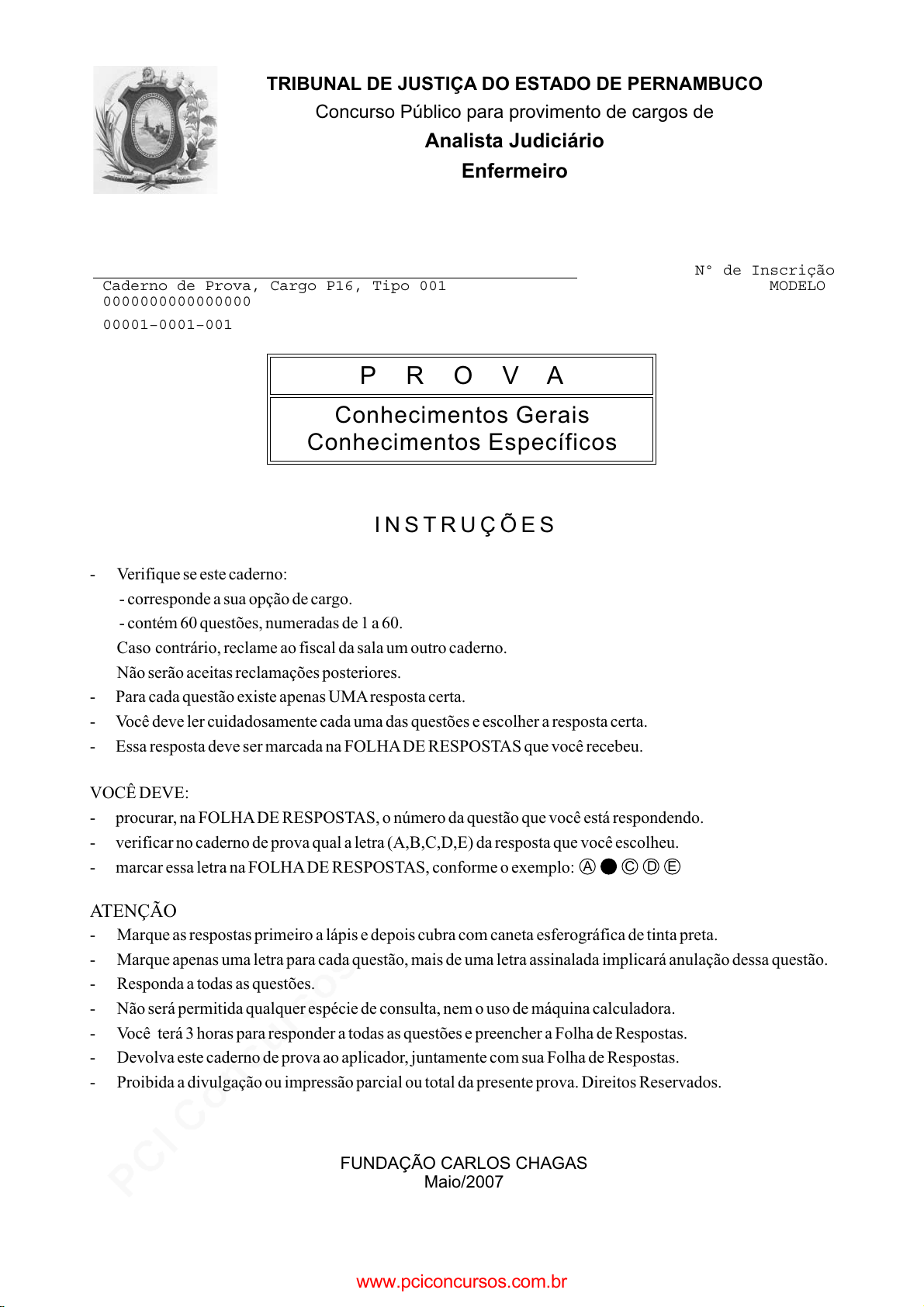 pcimarkpci MDAwMDowMDAwOjAwMDA6MDAwMDowMDAwOmZmZmY6ZDEwZTo0NjYz:V2VkLCAxOSBNYXIgMjAyNSAwMjo0NDo1NyAtMDMwMA== www.pciconcursos.com.br TRIBUNAL DE JUSTIÇA DO ESTADO DE PERNAMBUCO Concurso Público para provimento de cargos de Analista Judiciário Enfermeiro Conhecimentos Gerais Conhecimentos Específicos I N S T R U Ç Õ E S P R O V A - Verifique se este caderno: - corresponde a sua opção de cargo. - contém 60 questões, numeradas de 1 a 60. Caso contrário, reclame ao fiscal da sala um outro caderno. Não serão aceitas reclamações posteriores. - Para cada questão existe apenas UMAresposta certa. - Você deve ler cuidadosamente cada uma das questões e escolher a resposta certa. - Essa resposta deve ser marcada na FOLHADE RESPOSTAS que você recebeu. VOCÊ DEVE: - procurar, na FOLHADE RESPOSTAS, o número da questão que você está respondendo. - verificar no caderno de prova qual a letra (A,B,C,D,E) da resposta que você escolheu. - marcar essa letra na FOLHADE RESPOSTAS, conforme o exemplo: - Marque as respostas primeiro a lápis e depois cubra com caneta esferográfica de tinta preta. - Marque apenas uma letra para cada questão, mais de uma letra assinalada implicará anulação dessa questão. - Responda a todas as questões. - Não será permitida qualquer espécie de consulta, nem o uso de máquina calculadora. - Você terá 3 horas para responder a todas as questões e preencher a Folha de Respostas. - Devolva este caderno de prova ao aplicador, juntamente com sua Folha de Respostas. - Proibida a divulgação ou impressão parcial ou total da presente prova. Direitos Reservados. ATENÇÃO A C D E FUNDAÇÃO CARLOS CHAGAS Maio/2007 ____________________________________________________ Caderno de Prova, Cargo P16, Tipo 001 0000000000000000 00001−0001−001 Nº de Inscrição MODELO www.pciconcursos.com.br pcimarkpci MDAwMDowMDAwOjAwMDA6MDAwMDowMDAwOmZmZmY6ZDEwZTo0NjYz:V2VkLCAxOSBNYXIgMjAyNSAwMjo0NDo1NyAtMDMwMA== www.pciconcursos.com.br 2 TJUPE-Conhecimentos Gerais3 CONHECIMENTOS GERAIS LÍNGUA PORTUGUESA Atenção: As questões de números 1 a 15 referem-se ao texto abaixo: Cuidado: o uso desse aparelho pode produzir violência A revista Science publicou, em 2002, o relatório de uma pesquisa coordenada por Jeffrey Johnson, da Universidade de Colúmbia, em Nova York. O estudo mostra uma relação significativa entre o comportamento violento e o número de horas que um sujeito (adolescente ou jovem adulto) passa assistindo à TV. Pela pesquisa de Johnson, os televisores deveriam ser comercializados com um aviso, como os maços de cigarros: cuidado, a exposição prolongada à tela desse aparelho pode produzir violência. Estranho? Nem tanto. É bem provável que a fonte de muita violência moderna seja nossa insubordinação básica: ninguém quer ser ou continuar sendo quem é. Podemos procla- mar nossa nostalgia de tempos mais resignados, mas duvido que queiramos ou possamos renunciar à divisão constante entre o que somos e o que gostaríamos de ser. Para alimentar nossa insatisfação, inventamos a litera- tura e, mais tarde, o cinema. Mas a invenção mais astuciosa talvez tenha sido a televisão. Graças a ela, instalamos em nossas salas uma janela sobre o devaneio, que pode ser aberta a qualquer instante e sem esforço. Pouco importa que fiquemos no zapping (*) ou que paremos para sonhar em ser policiais, gângsteres ou apenas nós mesmos (um pouco piores) no Big brother. A TV confirma uma idéia que está sempre conosco: existe outra dimensão, e nossas quatro paredes são uma jaula. A pesquisa de Johnson constata que, à força de olhar, podemos ficar a fim de sacudir as barras além do permitido. Faz sentido. (*) zapping = uso contínuo do controle remoto. (Contardo Calligaris, Terra de ninguém) 1. Em relação à pesquisa coordenada por Jeffrey Johnson, o autor do texto manifesta (A) sua inteira estranheza, uma vez que tem convicções diametralmente opostas às do pesquisador. (B) sua inteira concordância, detalhando todos os ele- mentos da pesquisa e colando-se à argumentação dela. (C) o acolhimento da conclusão geral da pesquisa, mas não deixa de trilhar um caminho reflexivo pessoal sobre o fenômeno observado. (D) sua parcial concordância, pois julga que o pesquisa- dor se valeu de uma argumentação bastante es- tranha, nem sempre coerente. (E) sua plena discordância, uma vez que não vê qual- quer relação entre assistir à TV e as eventuais ati- tudes de violência do público televisivo. 2. Considere as afirmações abaixo. I. Na pesquisa de Jeffrey Johnson, ficou claro que é um exagero estabelecer uma relação de causa e efeito entre a exposição prolongada a programas de TV e atitudes de violência. II. De acordo com o autor do texto, a literatura e o cinema já estimulavam, antes do surgimento da TV, os mesmos níveis de violência social. III. O autor do texto defende a idéia de que a mídia pode estimular ações de violência que são geradas por nossa insatisfação com nós mesmos. É correto o que se afirma em (A) I, II e III. (B) I e II, apenas. (C) II e III, apenas. (D) II, apenas. (E) III, apenas. _________________________________________________________ 3. Considerando-se o contexto, traduz-se corretamente o sentido de uma expressão do texto em: (A) exposição prolongada = exibição intermitente. (B) nostalgia de tempos mais resignados = remorsos por antigas submissões. (C) uma janela sobre o devaneio = uma refração da realidade. (D) renunciar à divisão constante = recusar o freqüente desacordo íntimo. (E) sacudir as barras além do permitido = ratificar os limites inaceitáveis. _________________________________________________________ 4. Preserva-se plenamente a concordância verbal na frase: (A) Caberia comercializar-se os televisores com uma advertência expressa sobre o perigo que representa as exposições contínuas à tela de uma TV. (B) Boa parte dos atos de violência provém, de acordo com a pesquisa, do e
