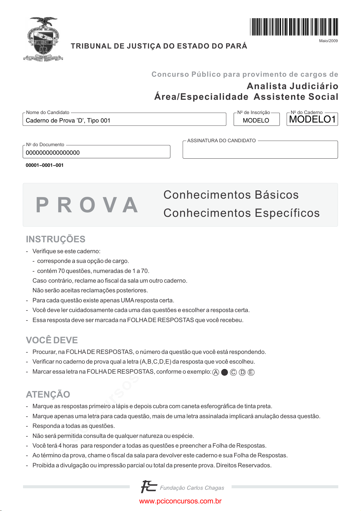 pcimarkpci MDAwMDowMDAwOjAwMDA6MDAwMDowMDAwOmZmZmY6ZDEwZTo0NjYz:V2VkLCAxOSBNYXIgMjAyNSAwMjozMjowMSAtMDMwMA== www.pciconcursos.com.br A C D E N do CadernooN de Inscriçãoo ASSINATURA DO CANDIDATO N do Documentoo Nome do Candidato Maio/2009 TRIBUNAL DE JUSTIÇA DO ESTADO DO PARÁ Analista Judiciário Área/Especialidade Assistente Social Concurso Público para provimento de cargos de Conhecimentos Básicos Conhecimentos EspecíficosP R O V A INSTRUÇÕES VOCÊ DEVE ATENÇÃO - Verifique se este caderno: - corresponde a sua opção de cargo. - contém 70 questões, numeradas de 1 a 70. Caso contrário, reclame ao fiscal da sala um outro caderno. Não serão aceitas reclamações posteriores. - Para cada questão existe apenas UMAresposta certa. - Você deve ler cuidadosamente cada uma das questões e escolher a resposta certa. - Essa resposta deve ser marcada na FOLHADE RESPOSTAS que você recebeu. - Procurar, na FOLHADE RESPOSTAS, o número da questão que você está respondendo. - Verificar no caderno de prova qual a letra (A,B,C,D,E) da resposta que você escolheu. - Marcar essa letra na FOLHADE RESPOSTAS, conforme o exemplo: - Marque as respostas primeiro a lápis e depois cubra com caneta esferográfica de tinta preta. - Marque apenas uma letra para cada questão, mais de uma letra assinalada implicará anulação dessa questão. - Responda a todas as questões. - Não será permitida consulta de qualquer natureza ou espécie. - Você terá 4 horas para responder a todas as questões e preencher a Folha de Respostas. - Ao término da prova, chame o fiscal da sala para devolver este caderno e sua Folha de Respostas. - Proibida a divulgação ou impressão parcial ou total da presente prova. Direitos Reservados. Caderno de Prova ’D’, Tipo 001 MODELO 0000000000000000 MODELO1 00001−0001−001 www.pciconcursos.com.br pcimarkpci MDAwMDowMDAwOjAwMDA6MDAwMDowMDAwOmZmZmY6ZDEwZTo0NjYz:V2VkLCAxOSBNYXIgMjAyNSAwMjozMjowMSAtMDMwMA== www.pciconcursos.com.br 2 TJUPA-Conhec.Básicos1 CONHECIMENTOS BÁSICOS Atenção: As questões de números 1 a 10 baseiam-se no texto apresentado abaixo. Liberdade minha, liberdade tua Uma professora do meu tempo de ensino médio, a propósito de qualquer ato de indisciplina ocorrido em suas aulas, invocava a sabedoria da frase “A liberdade de um termina onde começa a do outro”. Servia-se dessa velha máxima para nos lembrar limites de comportamento. Com o passar do tempo, esqueci-me de muita coisa da História que ela nos ensinava, mas jamais dessa frase, que naquela época me soava, ao mesmo tempo, justa e antipática. Adolescentes não costumam prezar limites, e a ideia de que a nossa (isto é, a minha...) liberdade termina em algum lugar me parecia inaceitável. Mas eu também me dava conta de que poderia invocar a mesma frase para defender aguerridamente o meu espaço, quando ameaçado pelo outro, e isso a tornava bastante justa... Por vezes invocamos a universalidade de um princípio por razões inteiramente egoístas. Confesso que continuo achando a frase algo perturbadora, provavelmente pelo pressuposto que ela encerra: o de que os espaços da liberdade individual estejam distribuídos e demarcados de forma inteiramente justa. Para dizer sem meias palavras: desconfio do postulado de que todos sejamos igualmente livres, ou de que todos dispomos dos mesmos meios para defender nossa liberdade. Ele parece traduzir muito mais a aspiração de um ideal do que as efetivas práticas sociais. O egoísmo do adolescente é um mal dessa idade ou, no fundo, subsiste como um atributo de todas? Acredito que uma das lutas mais ingentes da civili- zação humana é a que se desenvolve, permanentemente, contra os impulsos do egoísmo humano. A lei da sobrevivência na selva – lei do instinto mais primitivo – tem voz forte e procura resistir aos dispositivos sociais que buscam controlá-la. Naquelas aulas de História, nossa professora, para controlar a energia desbordante dos jovens alunos, demarcava seu espaço de educadora e combatia a expansão do nosso território anárquico. Estava ministrando-nos na prática, ao lembrar os limites da liberdade, uma aula sobre o mais crucial desafio da civilização. (Valdeci Aguirra, inédito) 1. A frase invocada nas aulas de História constitui o centro das presentes reflexões do autor do texto, que a explora, fundamentalmente, como expressão (A) das atribulações que todo professor bem intencio- nado precisa enfrentar, diante de jovens rebeldes e problemáticos. (B) dos impasses que a civilização provoca, ao pre- tender conciliar a fragilidade dos instintos e o senti- mento da liberdade. (C) da histórica batalha que se trava entre os nossos impulsos mais primitivos e a necessária estruturação da ordem social. (D) da dificuldade que aflige os adolescentes, quando tentam justificar seu egoísmo alegando os mais nobres princípios. (E) da ambiguidade medular dos processos históricos, representada na indecisão entre a escolha da liberdade ou da justiça. 2. Considerando-se o sentido geral e conclusivo do texto, o título Liberdade minha, liberdade tua tem significação equivalente à da seguinte formulação: (A) Minha liberdade nada tem a ver com a tua. (B) A tua e a minha liberdade são essencialmente a mesma. (C) Tua liberdade acaba por eliminar a minha. (D) A minha e a tua liberdade devem conciliar-se. (E) Nossas liberdades exercem-se paralelamente. _________________________________________________________ 3. Atente para as afirmações abaixo. I. No primeiro parágrafo, a última frase expressa uma verdade geral que se depreendeu da análise de uma situação particular. II. No segundo parágrafo, a perturbação confessada pelo autor do texto advém do reconhecimento de que todos os adolescentes são egoístas. III. No terceiro parágrafo, a lei do mais forte é invocada para explicar por que idealizamos os nossos mais primitivos instintos. Em relação ao texto, está correto APENAS o que se afirma em (A) I